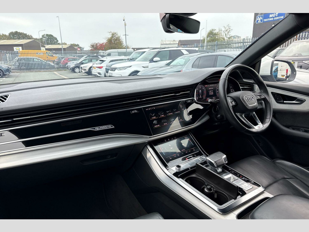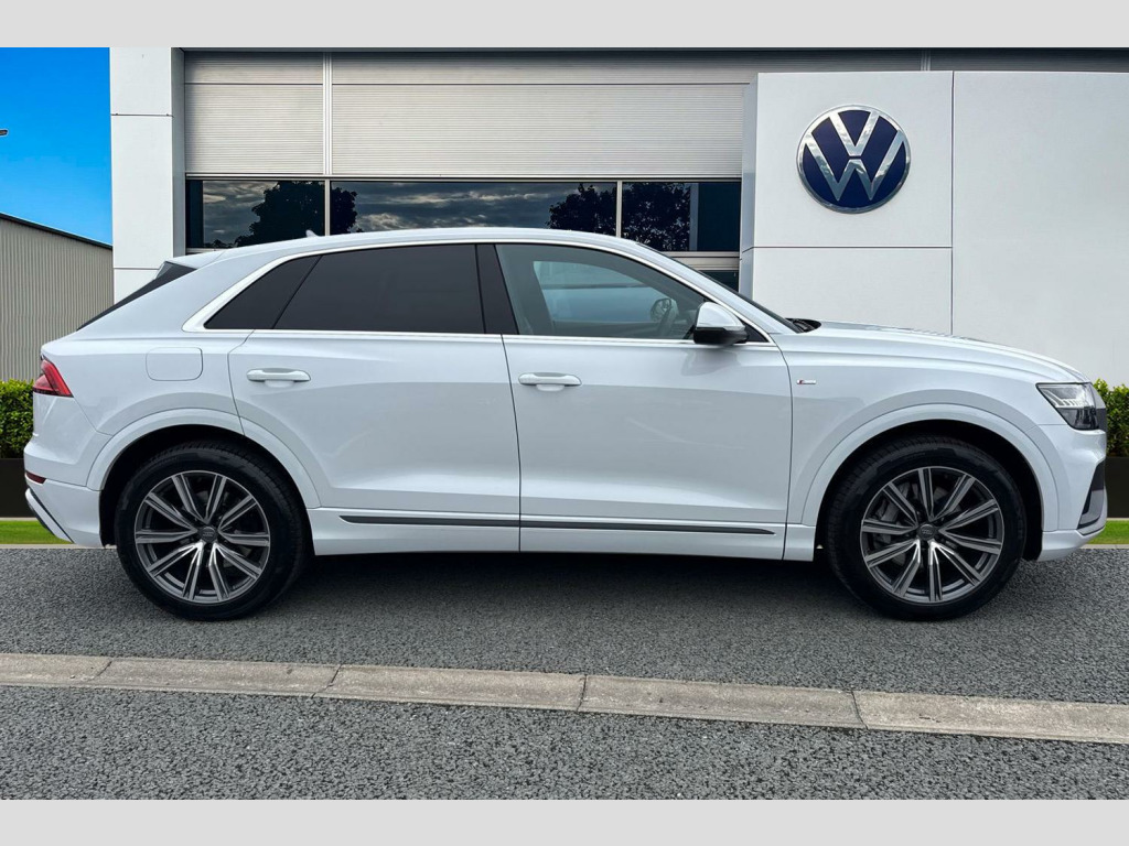 Take a look at this lovely Audi Q8 S-Line that is now available to purchase at Wrexham Volkswagen. This Q8 is powered by a 3.0 TDI 286PS engine, with automatic transmission and Quattro all wheel drive. The exterior, which is finished in a Glacier White paintwork, has a range of features on offer. To the front of the vehicle you'll find the Matrix LED headlights that provide outstanding visibility, and to the side the rear tinted windows for passenger privacy and the 21in alloy wheels. For added convenience this Q8 also features an electric tailgate, and parking sensors that assist with maneuvering alongside the rear view camera.