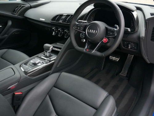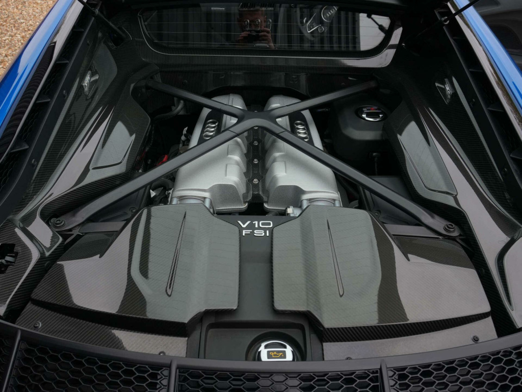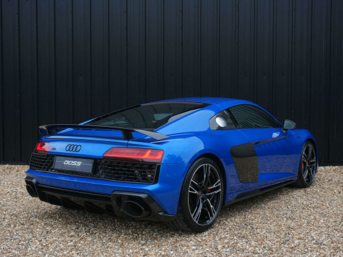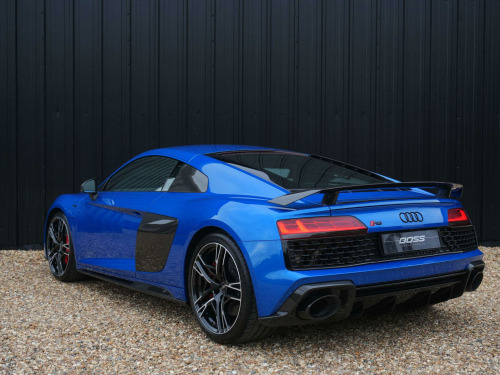2021 (71) Audi R8 V10 Performance Carbon Black3,800 miles - 2 owners from new - Full Audi main dealer service historyFinished in Ara Blue Crystal with Black extended Nappa leather interior, this low-mileage R8 Carbon Black combines Audi's naturally aspirated V10 engine with a distinctive carbon fibre exterior styling package.Key details:- 2021 / 71 plate- 3,800 miles- V10 Performance Carbon Black Coupe (620 PS)- 5.2-litre naturally aspirated V10 petrol engine- 7-speed S tronic dual-clutch transmission- Quattro all-wheel driveSpecification highlights:- Ara Blue Crystal exterior paint- Black extended Nappa leather interior- Full carbon fibre exterior trims- Carbon fibre engine bay finish- Bang & Olufsen premium sound system- Electrically adjustable sports seats- Heated front seats- Reversing camera with Parking System Plus- Wireless phone charging pad- Apple CarPlay & Android Auto connectivity- Interior ambient lighting package- LED headlights with High Beam Assist- 20'' alloy wheels in gloss blackHistory & ownership:- 2 owners from new- Full Audi main dealer service historyDisclaimer: Whilst every effort has been taken to ensure accuracy of all our vehicles information, some inaccuracies may occur. It is important that you do not rely on this information but check with Boss motor company limited about any items which may affect your decision to buy this vehicle.Fuel consumption and power usage figures are for guidance only. Factors such as driving style, weather, loading, traffic conditions, all affect the rate at which fuel or power is consumed. It is likely that some journeys will result in greater fuel consumption for the same distance than other journeys. You would be wise to ensure the power range remains above 20% at all times. ng and olufsen sound system, comfort and sound package, ara blue, fine nappa leather - r8 sports seats - black, advanced key with safelock, audi connect infotainment services (36 month subscription from new), locking wheel bolts, tyre repair kit, tool kit, start-stop system with recuperation, sideblades - gloss carbon, seat adjustment - electric and pneumatic with memory function for driver seat, s tronic transmission with hill hold assist, rear view mirror - automatically dimming - frameless with light-rain sensor, protective cover, performance sports suspension, parking system plus, mmi navigation plus with mmi touch, led headlights, inlays - gloss carbon twill, gloss carbon door mirror housing, gloss black oval tailpipe trims, front passenger airbag deactivation switch, extended inlays in titanium finish - glossy anthracite - for air vent surround, door sill trims in plastic with aluminium inlays and r8 logo, dab digital radio, carbon high gloss exterior style package, black styling pack, audi phone box with wireless charging, heated front seats, first aid kit and warning triangle, exterior mirrors electrically adjustable heated folding and automatically dimming with integrated led indicator, electric windows - front, deluxe automatic air conditioning, cruise control, ceramic brakes with red calipers, carbon engine cover, audi virtual cockpit, audi sound system, audi smartphone interface, high-beam assist, audi magnetic ride with cfrp stabilizer bar, audi drive select, audi beam, anti theft alarm and immobiliser, airbags - front side with curtain, airbags - front passenger, airbags - driver, asf - audi space frame, ami - audi music interface, abs - anti-lock braking system, 20in alloy wheels - 5 twin-spoke dynamic design aluminium wheels in gloss anthracite black - gloss turned finish, tyre pressure warning light, tracking system preparation, seat belt monitoring, reversing camera, r8 3-spoke - flat bottomed - multifunctional - perforated performance leather steering wheel with 3 operating satellites including performance mode, power steering, pedals in stainless steel, light and rain sensor, led rear lights and dynamic rear indicators, interior light package