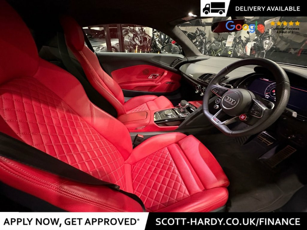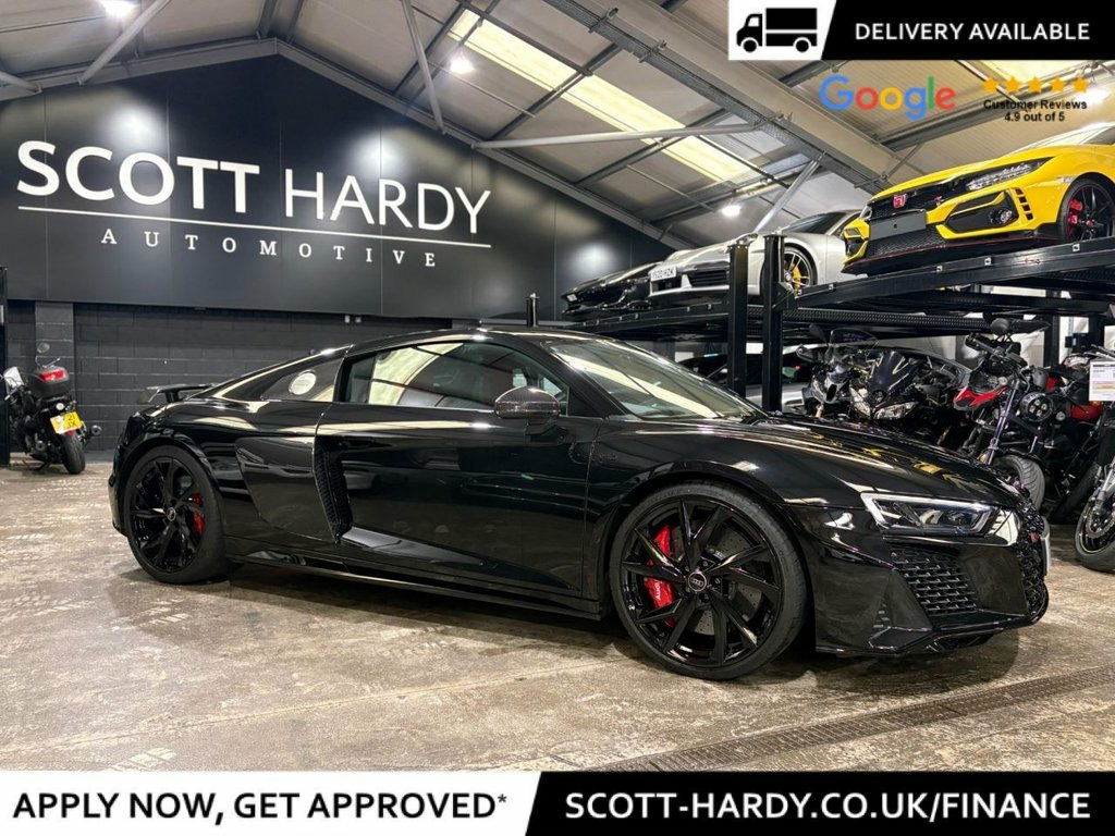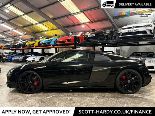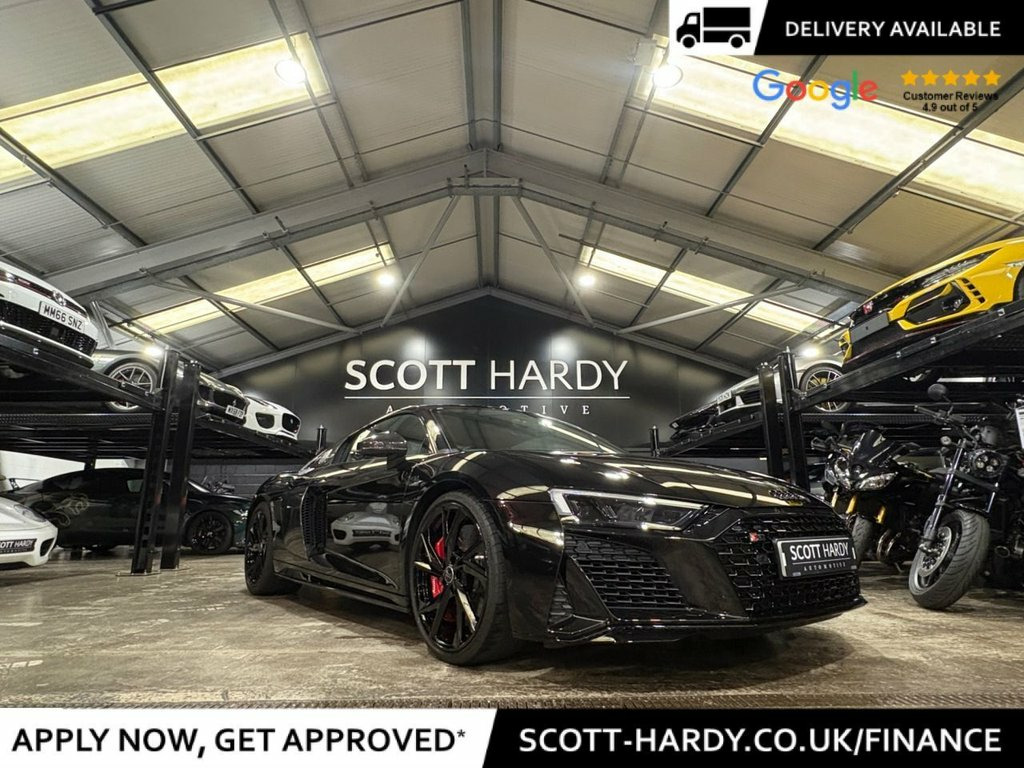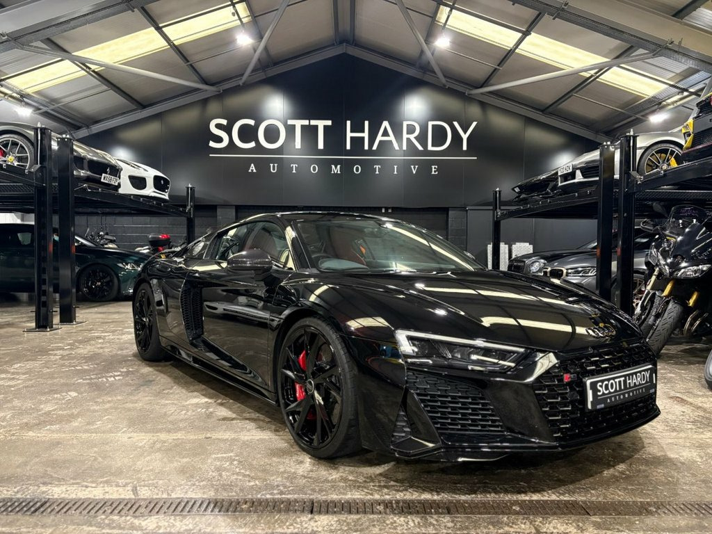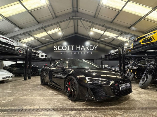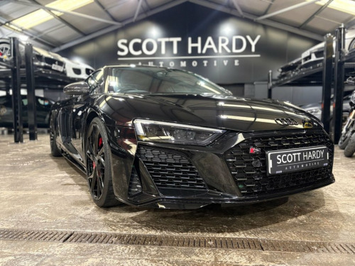 Scott Hardy Automotive are proud to present this stunning AUDI R8 V10 PERFORMANCE Edition finished in Mythos black. Unleash the symphony of a naturally aspirated V10, wrapped in the stealth elegance of Mythos Black. With 20" gloss black 5 twin-spoke dynamic alloy wheels and a carbon exterior pack that slices through the ordinary, this is more than a car—it's a statement. Inside, fine Nappa leather R8 sports seats in express red with diamond stitching ignite the senses. Heated and electrically adjustable, they cradle you in race-bred comfort. starlight roof, Audi Magnetic Ride adapts to every curve, while the Bang & Olufsen sound system turns every drive into a concert hall. Reversing camera. Parking sensors. Every detail engineered for confidence. Every moment designed for thrill. Seats - R8 Bucket Seats, Electrically Adjustable Seats, Audi Magnetic Ride with CFRP Stabilizer , Mythos Black, Fine Nappa Leather - R8 Sports Seats - E, 20in Alloy Wheels - 5 Twin-Spoke Dynamic, Carbon Pack, 20in Alloy Wheels - 5-V-Spoke Evo Design, ABS - Anti-Lock Braking System, AMI - Audi Music Interface, ASF - Audi Space Frame, Advanced Key with SafeLock, Airbags - Driver, Airbags - Front Passenger, Airbags - Front Side with Curtain, Alcantara Headlining with Stitched Diamo, Anti Theft Alarm and Immobiliser, Audi Beam, Audi Connect Infotainment Services (36 M, Audi Drive Select, Audi Phone Box with Wireless Charging, Audi Smartphone Interface, Audi Virtual Cockpit, Bang and Olufsen Soun