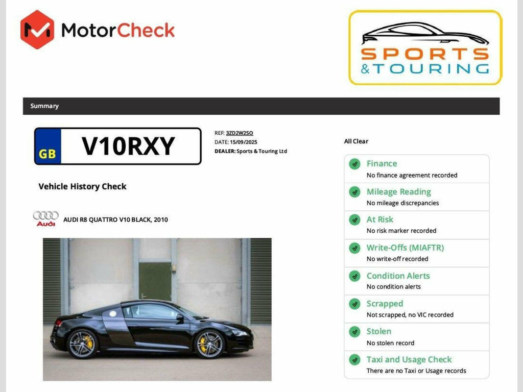 Please note: we do not accept reservations made without direct customer contact first! GREAT CONDITION | LOW MILEAGE | PRIVATE PLATE INCLUDED | FINE NAPPA LEATHER | CARBON SIGMA INLAY | ALCANTARA HEADLINING | FRESHLY REFURBISHED TWIN-SPOKE WHEELS | HEATED SPORTS SEATS | EXCELLENT SERVICE HISTORY | Were delighted to offer this stunning Audi R8, in arguably the most desirable V10 guise, with manual gearbox and with only just over 40,000 miles on the odometer. This Quattro is in impressive condition and has obviously been carefully kept, and comes with excellent main dealer service history including a recent service at Audi Newbury. It will be supplied with two remote key fobs and owners wallet with handbook set. The registration is V10 RXY, which remains on the car at the advertised price. You can chat to us live via text or WhatsApp on 07831 445521. Were open seven days a week, from 8am until 8pm, by appointment. Please read our reviews on AutoTrader and Google - we are very proud of our achievements. Contact us for access to the Google drive for any of our cars, with high-resolution photos, service history, and full build specification, or request a video viewing. All our cars are supplied with a comprehensive MotorCheck report and pre-delivery inspection. We provide a three-month, 3,000 mile warranty free of charge and twelve and twenty-four-month options are also available. Please ask us about trading-in; we will give you sound advice.