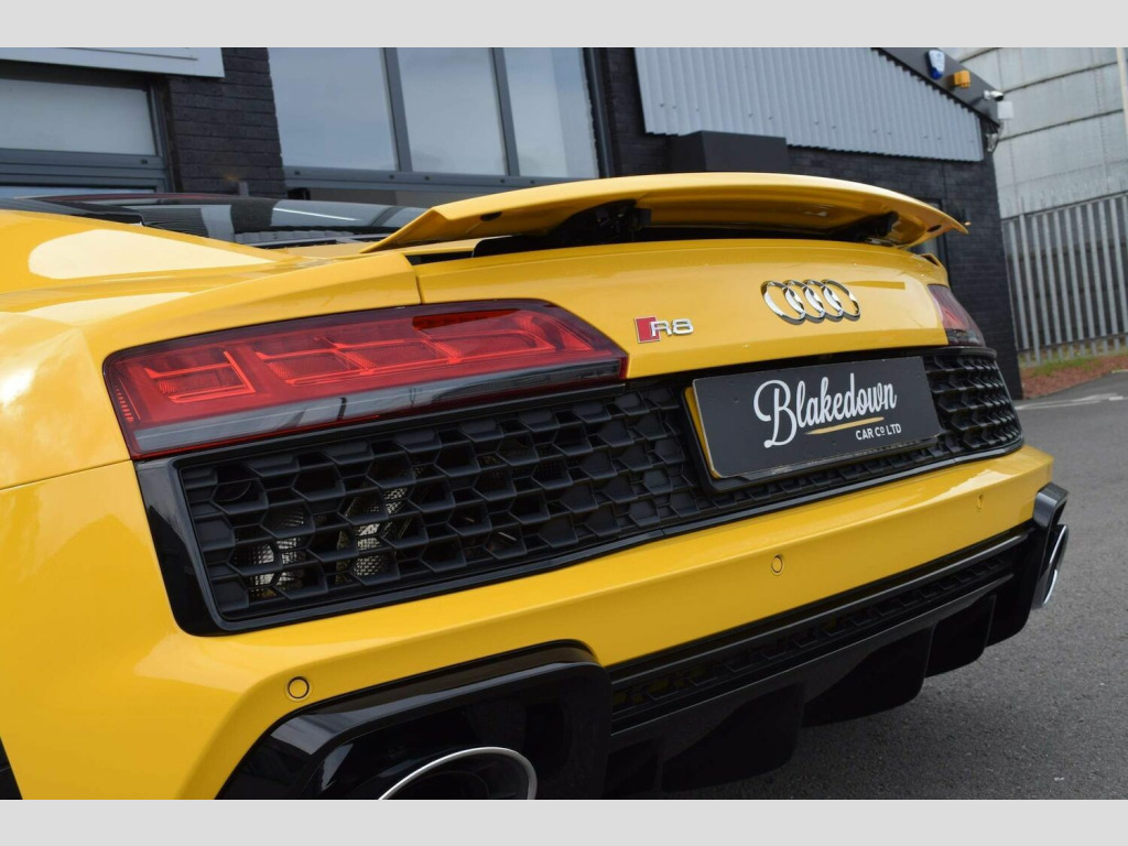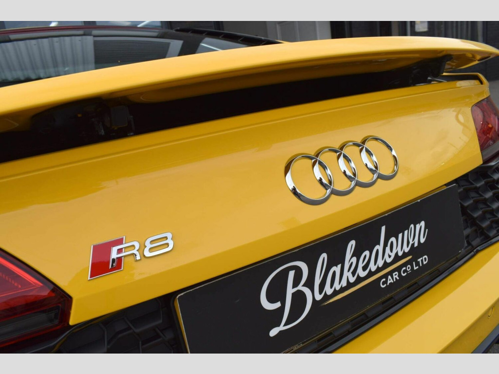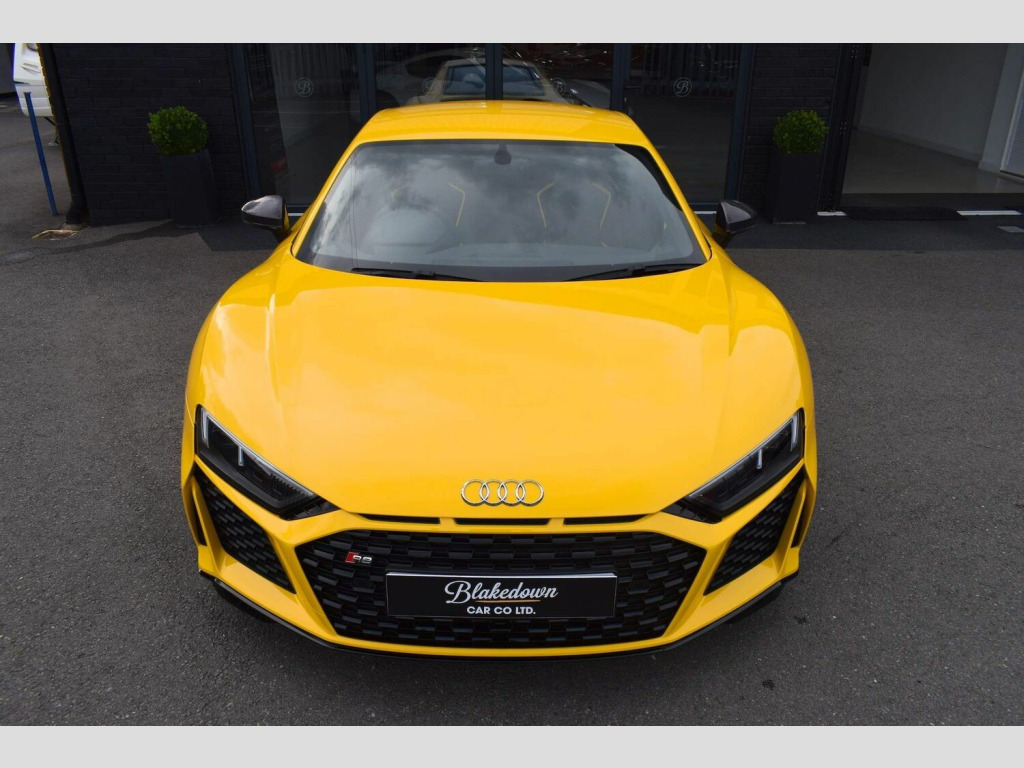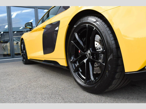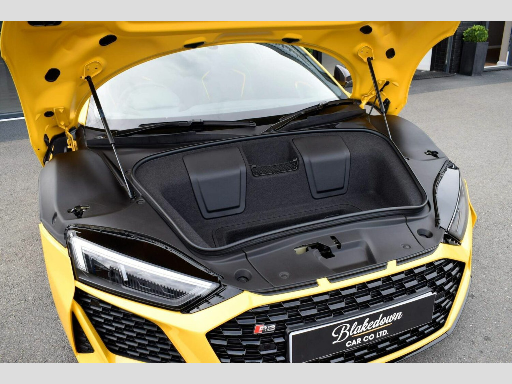 Audi R8 5.2 FSI V10 S Tronic RWD finished in striking Vegas Yellow with a one off custom black/yellow Fine Nappa Leather interior with contrast yellow stitching. Just 1900 miles covered by ONE owner from new, first service not yet due and Audi warranty in place until May 2024. Car supplied with both keys, all bookpacks and correct documentation etc. This particular car also benefits from carbon wrapped side blades and wing mirror caps which contrast beautifully with the Vegas yellow bodywork and set this car apart beautifully. As you would expect this car is presented in flawless showroom condition both inside out and mechanically. Very well equipped with features to include: 19in Alloy Wheels - 5-Spoke Design Cast Aluminium in Gloss Black, AMI - Audi Music Interface, Advanced Key with SafeLock, All-LED Headlights, Audi Connect, Audi Smartphone Interface, Audi Virtual Cockpit, Cruise Control, DAB, Gloss Black Styling Pack, Heated Front Seats, Inlays - Anthracite Anodised Paint Finish, Interior Light Package, LED Rear Lights and Dynamic Rear Indicators, MMI Navigation Plus including MMI Touch, Parking System Plus - Front and Rear Sensors, Pneumatic Seat Backrest and Side Bolster Adjustment, R8 3-Spoke Sport Leather Steering Wheel and more. FINANCE FROM 6.9% APR | GTECHNIQ DETAILING & CERAMIC COATINGS | XPEL PAINT PROTECTION FILM
