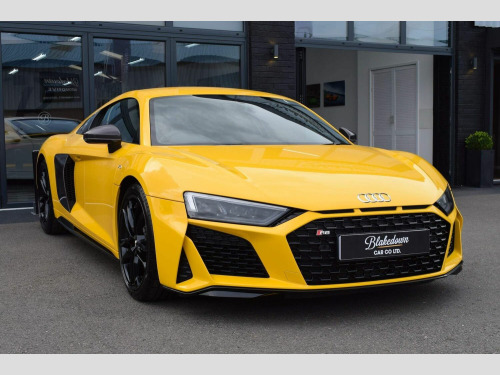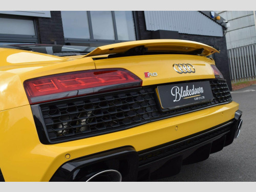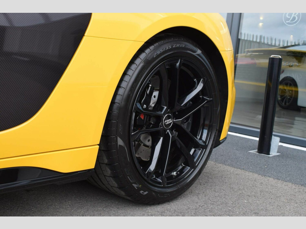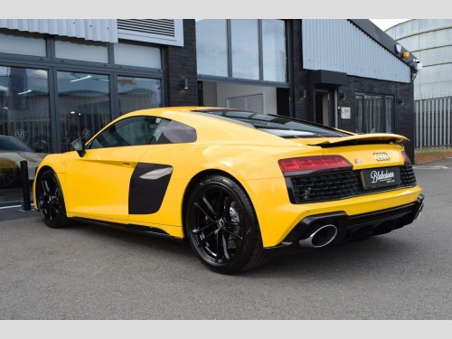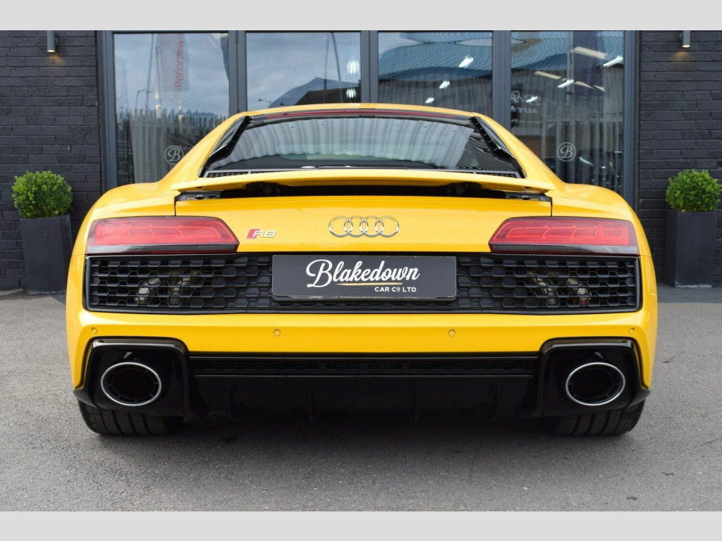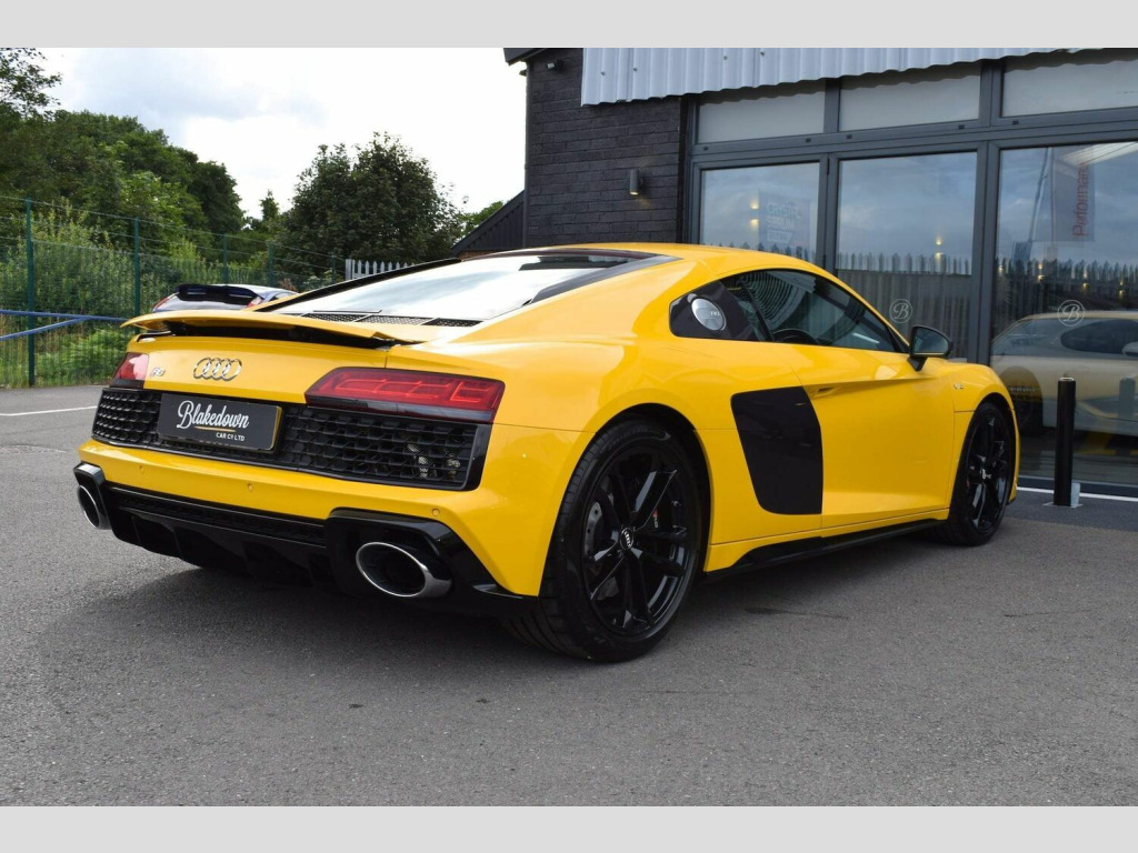 Audi R8 5.2 FSI V10 S Tronic RWD finished in striking Vegas Yellow with a one off custom black/yellow Fine Nappa Leather interior with contrast yellow stitching. Just 1900 miles covered by ONE owner from new, first service not yet due and Audi warranty in place until May 2024. Car supplied with both keys, all bookpacks and correct documentation etc. This particular car also benefits from carbon wrapped side blades and wing mirror caps which contrast beautifully with the Vegas yellow bodywork and set this car apart beautifully. As you would expect this car is presented in flawless showroom condition both inside out and mechanically. Very well equipped with features to include: 19in Alloy Wheels - 5-Spoke Design Cast Aluminium in Gloss Black, AMI - Audi Music Interface, Advanced Key with SafeLock, All-LED Headlights, Audi Connect, Audi Smartphone Interface, Audi Virtual Cockpit, Cruise Control, DAB, Gloss Black Styling Pack, Heated Front Seats, Inlays - Anthracite Anodised Paint Finish, Interior Light Package, LED Rear Lights and Dynamic Rear Indicators, MMI Navigation Plus including MMI Touch, Parking System Plus - Front and Rear Sensors, Pneumatic Seat Backrest and Side Bolster Adjustment, R8 3-Spoke Sport Leather Steering Wheel and more. FINANCE FROM 6.9% APR | GTECHNIQ DETAILING & CERAMIC COATINGS | XPEL PAINT PROTECTION FILM
