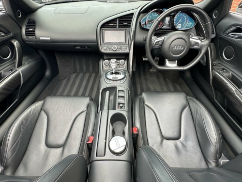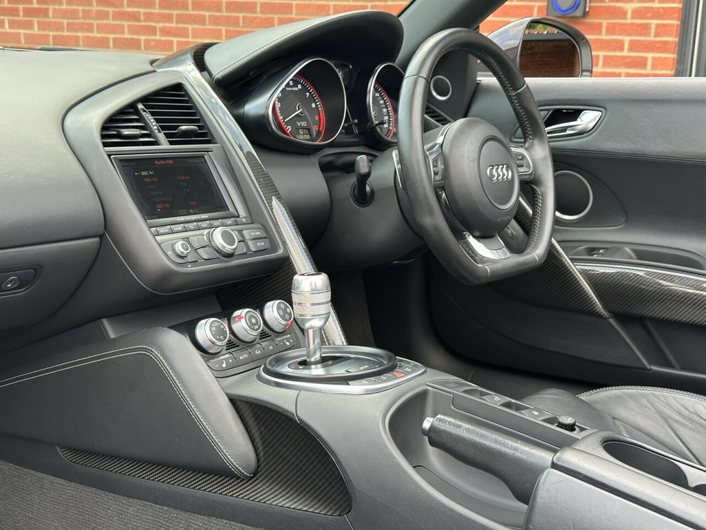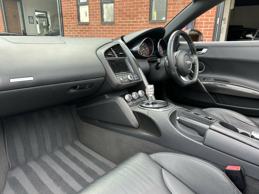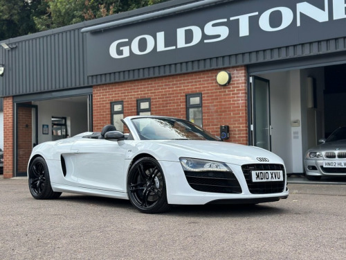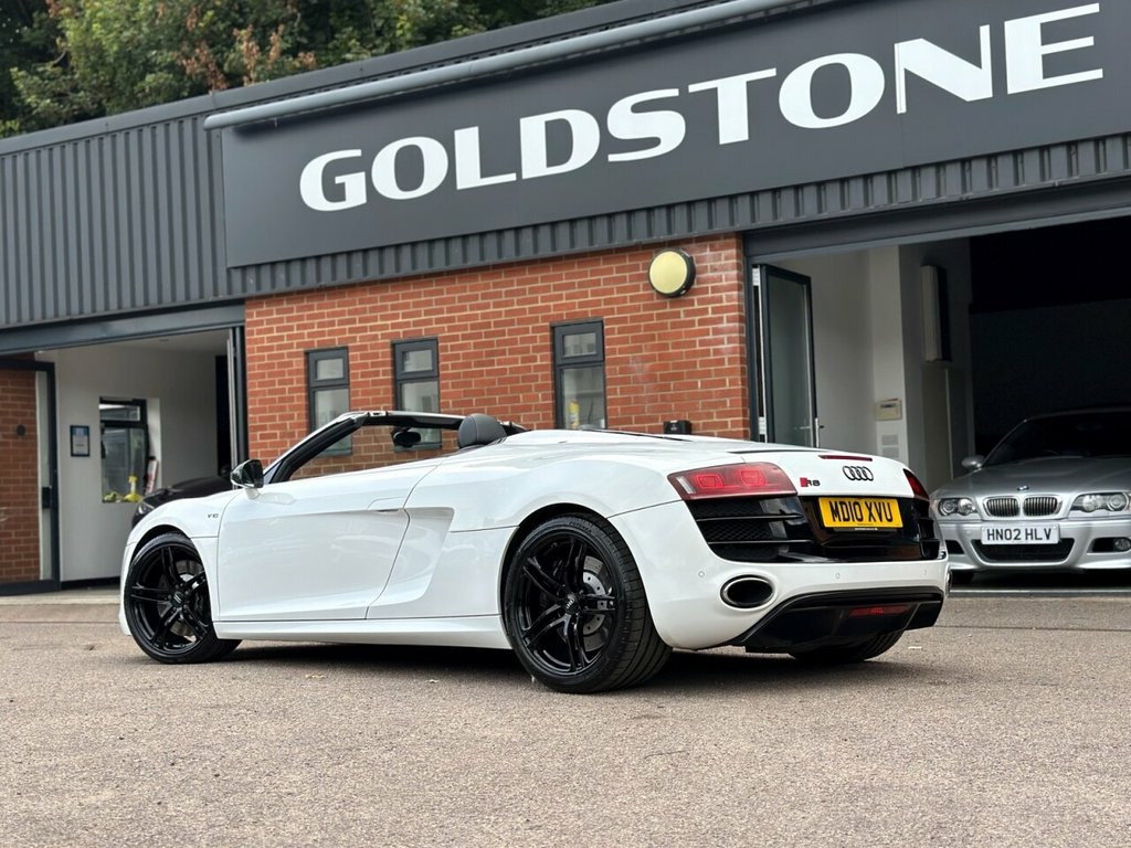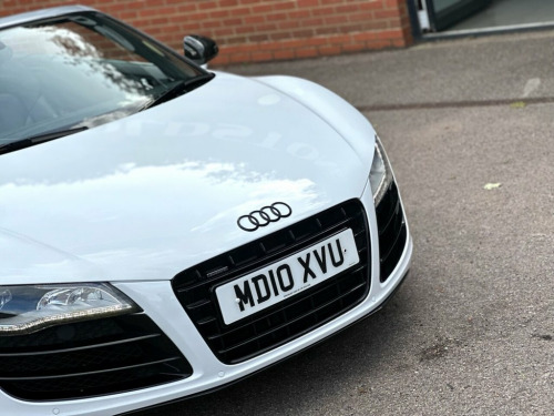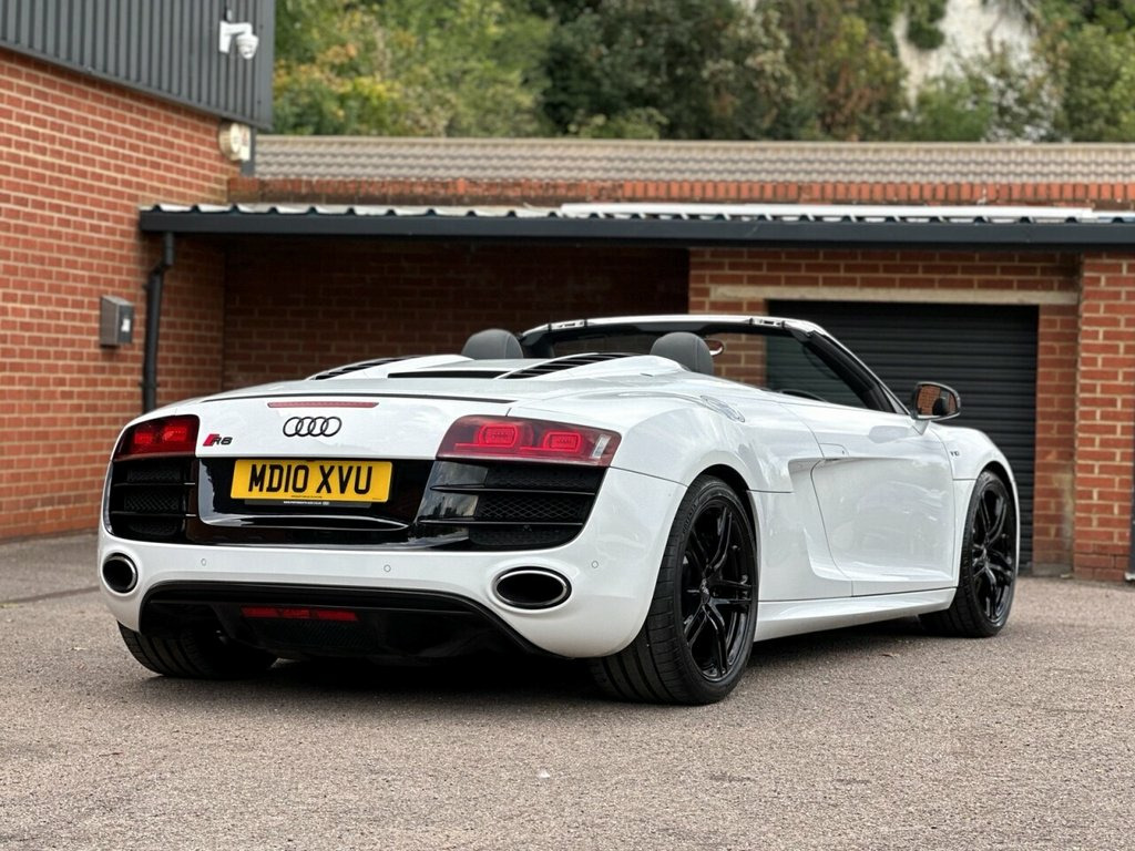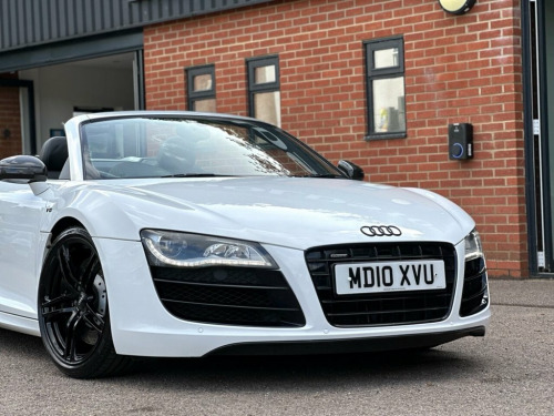 STUNNING IBIS WHITE V10 SPYDER | COMPREHENSIVE AUDI SERVICE HISTORY | CARBON SIGMA INTERIOR INLAYS | 19" DOUBLE SPOKE GLOSS BLACK ALLOYS WITH RECENT X4 BRIDGESTONE TYRES | B&O SOUND SYSTEM | REVERSE CAMERA | MAG RIDE WITH RECENT X4 REPLACEMENT AT AUDI | CARBON DOOR SILL TRIMS | CARBON MIRRORS | FINE NAPPA LEATHER WITH CONTRAST STITCHING | BEAUTIFUL CONDITION THROUGHOUT | COMPREHENSIVE HISTORY WITH INVOICES TO CONFIRM | A TRULY AMAZING SUPER CAR WITH ONE OF THE HIGHEST REGARDED ENGINE | Presented in stunning Ibis White, this exceptional 2010 Audi R8 V10 Spyder offers a rare combination of breathtaking performance, timeless styling, and engineering excellence. This is not just a car — it's a statement. Powered by Audi's legendary 5.2-litre naturally aspirated V10, the same engine platform found in the Lamborghini Gallardo, this machine delivers spine-tingling performance, producing 518 bhp and a symphony of sound that few modern cars can match. Mated to Audi's renowned Quattro all-wheel-drive system and Mag Ride adaptive suspension (recently replaced by Audi, with invoices to confirm), the R8 V10 Spyder offers sharp, confident handling whether on twisting backroads or open motorways. This particular example has been cherished and maintained to the highest standard with a comprehensive Audi service history, backed by a folder full of supporting invoices. It's as mechanically strong as it is visually stunning. Key Features Include: Carbon S Coloured stitching on upholstery, Leather- Fine Nappa Leather, Ibis White, Audi Parking System Advanced, Acoustic Parking System- Front&Rear, Carbon sigma inlay, Contoured 3Spoke flat bottom Multifuncti, Carbon door sill Trim with Aluminium ins, 19in 5Arm double Spoke Alloy Wheels- Hig, Carbon door mirror Trims, 19in 10Spoke Y design Alloy Wheels, 3Spoke flat bottom Multifunction Leather, 6CD Autochanger, Aluminium gear knob, Audi music interface, Body colour door mirrors, Electric lumbar support, Front side Airbags, Hood- Black, Hood- Brown, Hood- Red, Leather gear knob, Matt silk finish Black inlay, Mobile phone preparation- Low