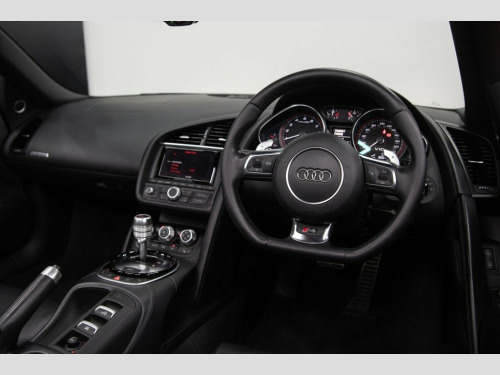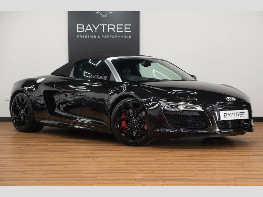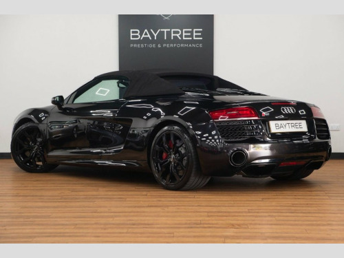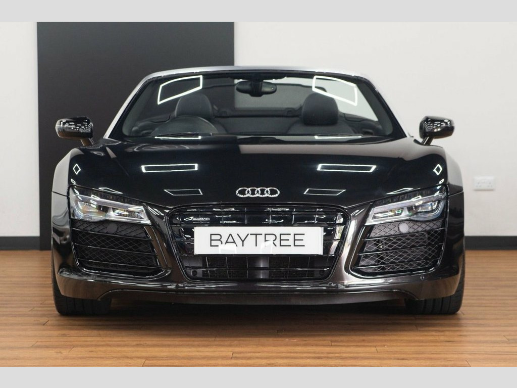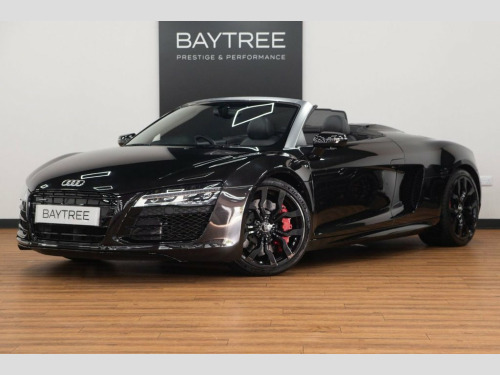 Baytree are delighted to offer for sale this exceptional April 2015 registered Audi R8 5.2 FSI V10 Spyder, elegantly presented in Mythos Black with a sleek Black Fine Nappa Leather Interior, featuring a set of striking 19" 10 Y Spoke Gloss Black Alloy Wheels. This vehicle has travelled a mere 19,000 miles. For further details or to schedule a viewing, don't hesitate to contact us. Fine Nappa Leather - Black, Mythos Black, 19in Alloy Wheels - 10-Spoke Y Design Hi, Steering Wheel - 3-Spoke Leather-Multifu, Hood - Black, 19in Alloy Wheels - 10-Spoke Y Design, 6.5in Display Screen, ABS - Anti-Lock Braking System, AMI - Audi Music Interface, ASR - Anti Slip Regulation, AUX-IN Socket, Airbags - Driver, Airbags - Front Passenger, Airbags - Front Side, Amplifier - 5-Channel, Anti Theft Locking Wheel Bolts, Anti-Theft Alarm, Audi Hill Hold Assist, Audi Magnetic Ride, Audi R8 Driving Experience - Initial Own, Auto-Dimming Rear-View Mirror, Automatic Wipers with Rain Sensor, Bang and Olufsen Sound System, Brake Lights - LED, Climate Control - Electronic, Concert Radio RNS-E - MP