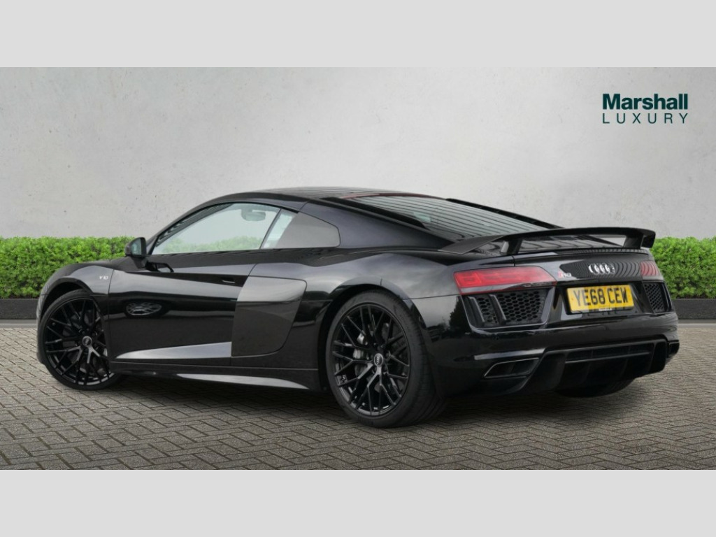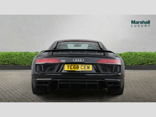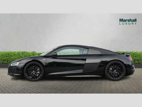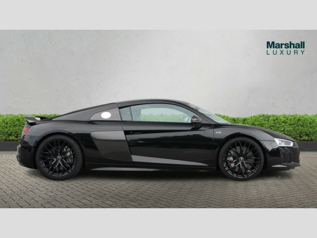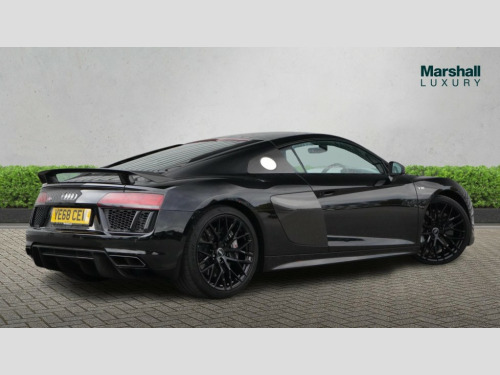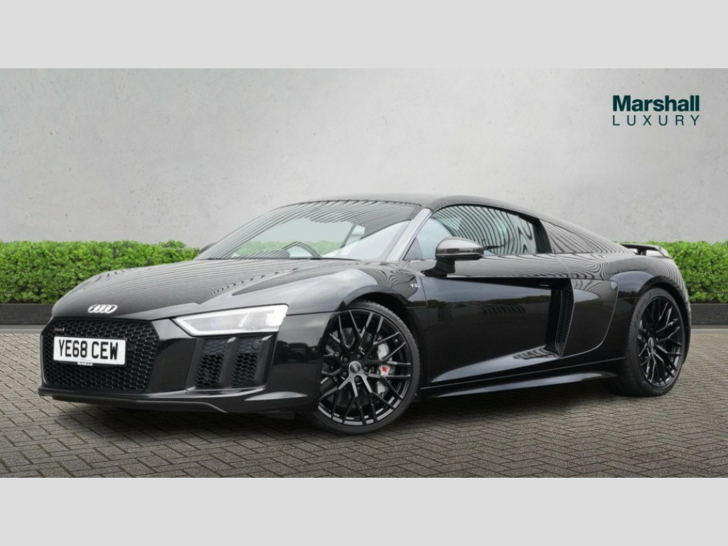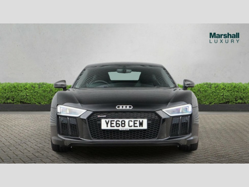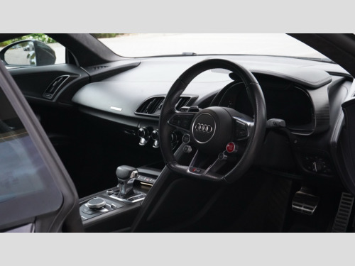 Audi R8 5.2 FSI V10 Plus Quattro 2dr S Tronic Audi connect, Audi drive select with performance mode, Audi parking system plus with front and rear sensors, Audi virtual cockpit - 12.3" high-resolution LCD display with fully customisable instrument cluster, Bluetooth connectivity with voice control, Cruise control + speed limiter, Driver's information system, MMI navigation plus with DVD, SD card reader, 10GB music storage, MMI touch panel, Service interval indicator, V10 Plus sports suspension, 2 USB ports, Audi music interface, Auxiliary input socket, DAB Digital radio, Air inlet in Anthracite gloss black, Aluminium fuel cap, Audi Beam uses LEDs to project the Audi Sport logo, Auto dimming rear view mirror with light and rain sensors, Body colour bumpers, Electric front windows, Electrically adjustable and heated door mirrors, Folding door mirrors, Gloss anthracite black air outlets, Gloss Carbon rear spoiler, Green tinted glass, Heat insulating glass, Heated rear window, Laminated windscreen, LED daytime running lights, 3 spoke flat bottomed multifunction performance leather steering wheel with 4 operating satellites, Adjustable steering column, Aluminium gear selector, Aluminium gear shift paddles, Ambient lighting, Deluxe climate control, Driver and passenger footwell lighting, Electric front seat height adjustment, Engine Compartment Light, Illuminated door pockets, Illuminated glovebox, Integrated front head restraints, Interior light with delay, Luggage compartment lighting, Reading lights, Stainless steel pedals and foot rest, ABS/EBD, ASR, Ceramic brakes, Curtain Airbag, Driver/front passenger airbag, EDL traction control, ESP, Front passenger airbag deactivation, Front side airbags, Gloss anthracite brake calipers, Hill hold control, Tyre pressure monitoring system, Warning triangle and first aid kit, Advanced key, Anti theft system, Electronic immobiliser, Locking wheel bolts, Preparation for tracking system, Remote central locking, Valet parking key, Extended inlays in matt Carbon surrounded for Audi virtual cockpit and air vents, Matt carbon inlay, Tyre repair kit