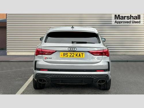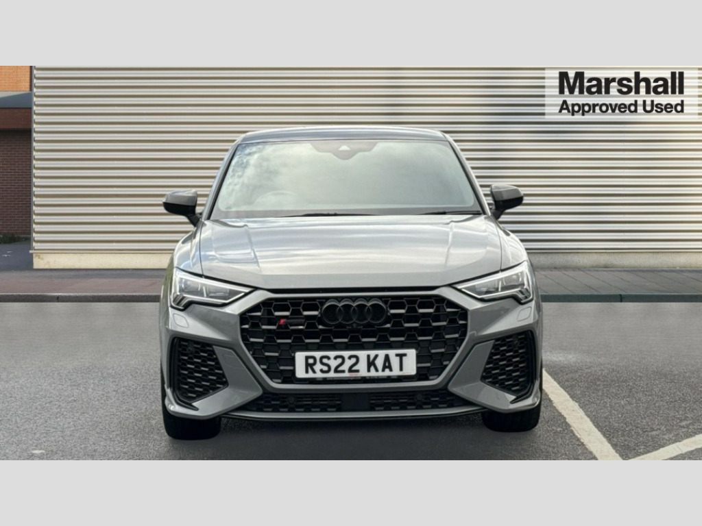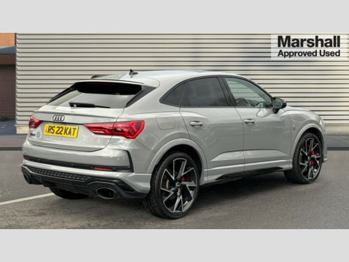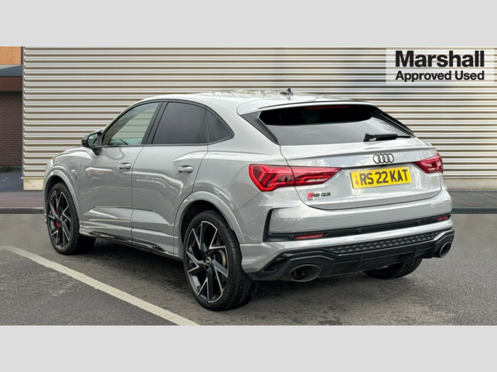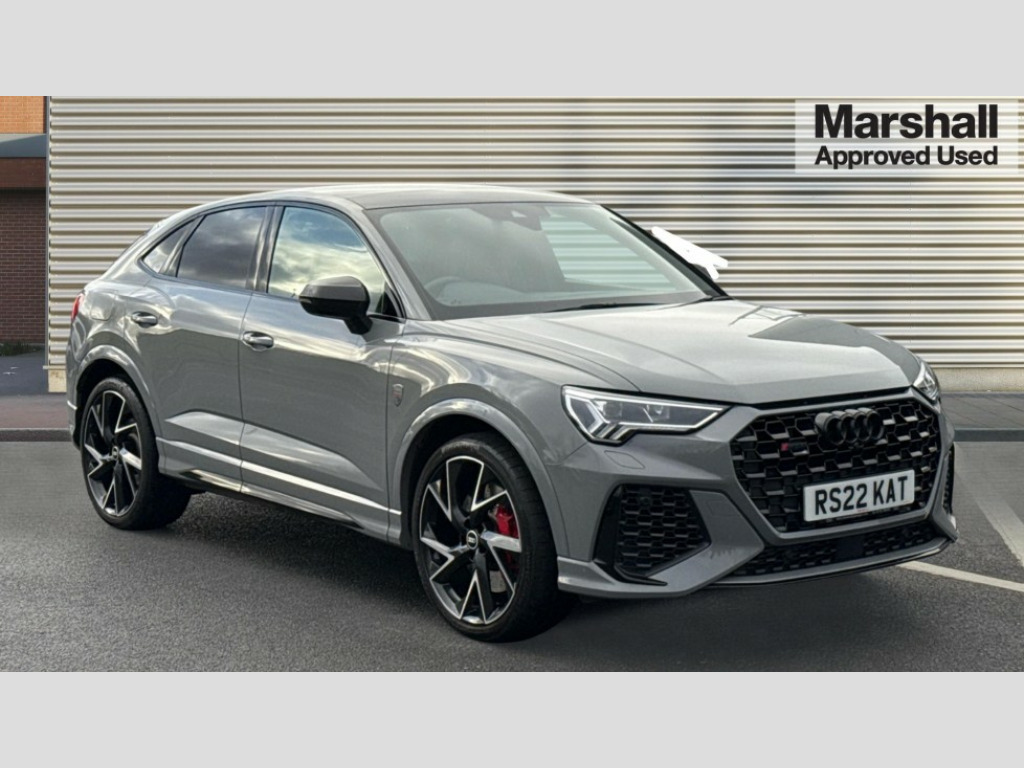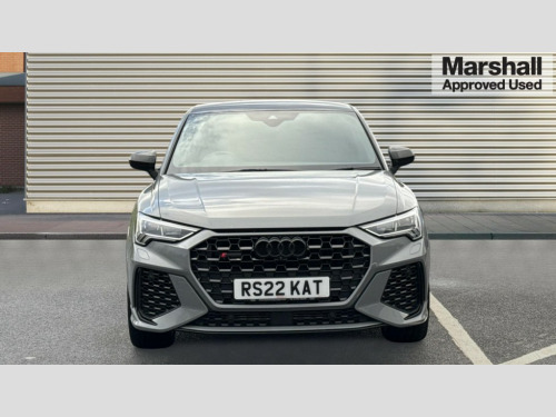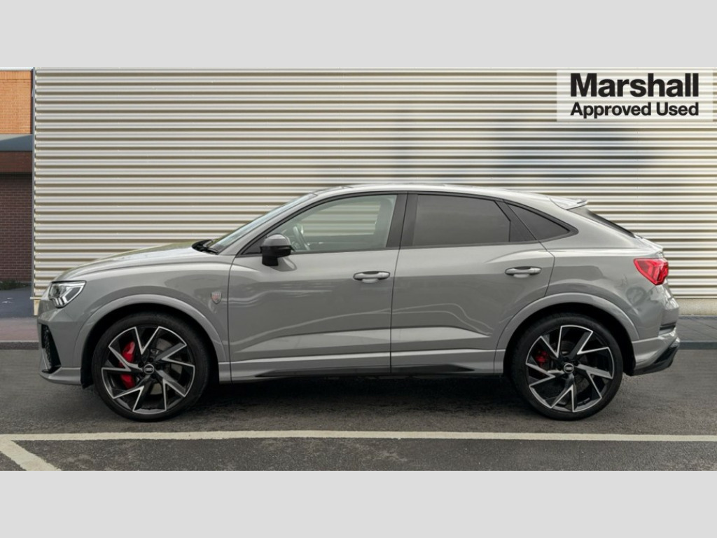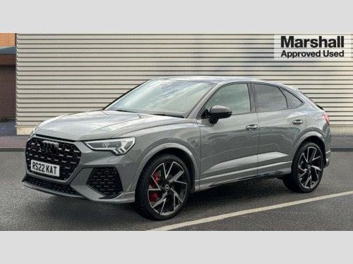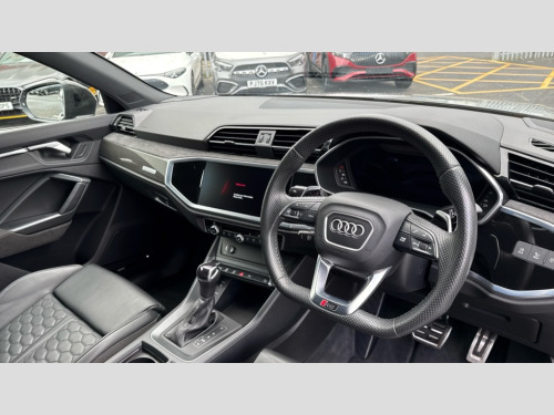 Audi RS Q3 RS Q3 TFSI Quattro Vorsprung 5dr S Tronic 360 degree parking camera, Audi drive select with new RS modes, Audi lane departure warning, Audi parking system plus with front and rear sensors, Audi phone box with wireless charging, Audi virtual cockpit plus - 12.3 inch display, Bluetooth interface, Camera based traffic sign recognition, Emergency e-call, MMI Navigation Plus with high resolution 10.1 inch touchscreen colour display, Power operated tailgate, Progressive steering, Rear cross traffic assist, Smartphone interface includes wireless Apple carplay/Android Auto, Start stop system with recuperation, Voice control system with natural language interaction, Quattro all wheel drive, RS sports suspension plus, 2 USB-C ports with charge and data functions, Bang + Olufsen 3D sound system, DAB digital radio module, Acoustic windscreen, Audi Beam uses LEDs to project the Audi Sport logo, Auto dimming door mirrors, Auto dimming frameless rear view mirror, Body colour rear spoiler with lip in gloss black, Carbon door mirror housings, Electrically folding, adjustable and heated door mirrors with integrated LED side indicators and kerb view function for passenger side, Flared wheel arches, Flat slits on single frame grille, Headlight washers, High gloss black finish B and C pillars, Honeycomb radiator grille in gloss black, Illuminated door sill trims with RS logo, LED headlights with LED daytime running lights, LED rear lights, LED third brake light, Panoramic glass sunroof, Privacy glass dark tinted rear and rear-side windows (from B-pillar backwards), Rain and light sensors, Rear side wing doors, Rear wiper, RS specific bumpers with large front air inlets in black, RS Sport exhaust system, dual branch with exhaust flap control and gloss black oval tailpipe trims, Tinted rear windows, Variable front intermittent wipers, 3 seat bench in 2nd row, 3 zone electronic climate control, 4 way electric lumbar support for driver and front passenger, Adjustable rear seat bench/backrest with centre armrest and cupholder, Black Alcantara elements - dashboard and the armrests in the front and rear doors, Black cloth headlining, Electrically adjustable front seats, Fine Nappa leather upholstery with front sports seats + honeycomb stitching and RS embossed logo, Front and rear floor mats, Front and rear head restraints, Front centre armrest, Heated front seats, ISOFIX child seat mounting for front passenger with airbag deactivation and outer rear seat including top tether attachment point for outer rear seats, Leather steering wheel (Round) in 3-spoke design with multifunction plus and shift paddles, Single front passenger seat, Stainless steel luggage compartment sill finisher, Stainless steel pedals, Black styling pack - RS Q3, Driver assistance pack with side assist - RS Q3, Multi-coloured extended ambient lighting pack - RS Q3, Non smoking pack - RS Q3, 3x3 point rear seatbelts, 6 airbags - Driver, front passenger, curtain and side windows, Audi pre-sense front with pedestrain and cyclist recognition, Electrically operated child locks on rear doors, Electromechanical parking brake, Electronic stabilisation control including ABS, ASR and EDL, Front seatbelt reminder, Hill descent control, Hill hold assist, Pre sense basic, RS brake system, Seatbelt monitoring, Tyre pressure warning, Warning triangle and first aid kit, Advanced key, Anti theft alarm, Anti theft wheel bolts, Immobiliser, Aluminium look interior elements, Carbon twill inlays, Detail dashboard around MMI touch colour display in glass look, black with surround in aluminium look, Tool kit, Tyre repair kit