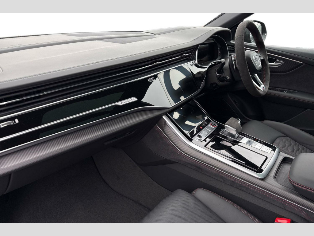 RS Design Package - Red, RS Ceramic Brakes with Brake Calipers in Red, 23in Alloy Wheels - 5-Y-Spoke - Audi Sport - Matt Contrasting Black, 360 Degree Camera, 4-Way Lumbar Support for Front Seats, 4-Zone Automatic Air Conditioning, AMI - Audi Music Interface, Adaptive Cruise Assist with Emergency Assist, Air Ioniser and Aromatization, All-Wheel Steering, Anti-Theft Alarm, Anti-Theft Wheel Bolts and Wheel Loosening Warning, Audi Connect Navigation and Infotainment (3 Year Subscription From New), Audi Connect Safety and Service - e-call, Audi Connect with Amazon Alexa Integration, Audi HD Matrix LED Headlights with Audi Laser Light, Audi Phone Box Light, Audi Pre-Sense Front, Audi Smartphone Interface, Audi Virtual Cockpit, Auto Dimming and Frameless Rear View Mirror, Bang and Olufsen 3D Premium Sound System, Black Cloth Headlining, Camera Based Traffic Sign Recognition, City Assist Pack, Comfort Front Centre Armrest, Convenience Key, DAB Digital Radio, Digital OLED Rear Combination Lamps, Door Mirrors - Electrically Adjustable - Heated - Folding - Automatically Dimming with Memory Function and Integrated LED Indicators with Kerb View Function for Passenger Side, Door Mirrors in Matt Carbon, Double Sun Visor, Driver - Front Passenger - Front Side and Curtain Airbag System, Driver and Front Passenger Memory Function for the Electrically Adjustable Front Seats, ESC - Electronic Stabilisation Control inc ABS - ASR and EDL, Electric Sunblinds for the Rear Side Windows and Manual Sunblind for the Rear Window, Electric Windows - Front, Electromechanical Active Roll Stabilisation, Electromechanical Power Steering, Extended LED Interior Lighting Package - Multi-Coloured, First Aid Kit and Warning Triangle, Front Seat Ventilation, Head-Up Display, Headlight Washers, Heated Front Seats, Hold Assist, ISOFIX Child Seat Mounting for Front Passenger, Illuminated Door Sill Trims with RS Logo, Inlays - Matt Carbon Twill, Intersection Assist, LED Entry Lights - Front and Rear, LED Projection of RS Performance Logo when Opening the Front and Rear Side Doors, Lane Departure Warning, MMI Navigation Plus including MMI Touch, Matt Carbon Black Styling Package, Natural Voice Recognition, Operating Buttons in Black - Glass Look, Panoramic Glass Sunroof, Park Assist with Parking System Plus, Parking System Plus with 360 Degree Display - Front - Rear and Side Sensors, Pedals in Stainless Steel, Power Latching for the Doors, Power Operated Tailgate, Privacy Glass - Dark-Tinted Rear and Rear-Side Windows - From B-Pillar Backwards, RS 3-Spoke Heated Leather Multi-function Sport Steering Wheel with Shift Paddles and RS Mode Button, RS Adaptive Air Suspension, RS Audi Drive Select, RS Badges on the Front Wings, RS Ceramic Brakes with Brake Calipers in Anthracite Grey, RS Coming-Leaving Home Animations in Front and Rear, RS Design Package - Grey, RS Manhattan Grey Front Spoiler Lip and Rear Diffuser Insert, RS Specific Bumpers in Full Body Colour, RS Specific Styling, RS Sport Exhaust System with Black Exhaust Tips, Rear Bench Seat Plus, Seat Belt Monitoring, Signature LED Daytime-Running Lights, Standard Pedestrian Protection Measures, Steering Column - Electrically Adjustable with Memory, Technology Pack Pro, Tool Kit, Tour Pack, Tyre Pressure Loss Indicator, Tyre Repair Kit, Upper and Lower Interior Elements in Leather, Window Trim Strips in Matt Grey with Audi Rings and Emblem in Black, Windshield with Heat Insulated Glass, quattro All-Wheel Drive with Sport Differential