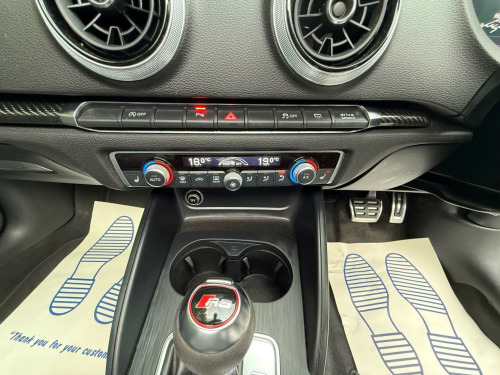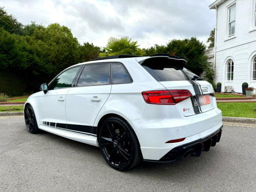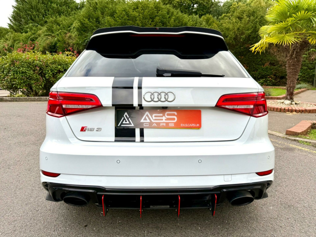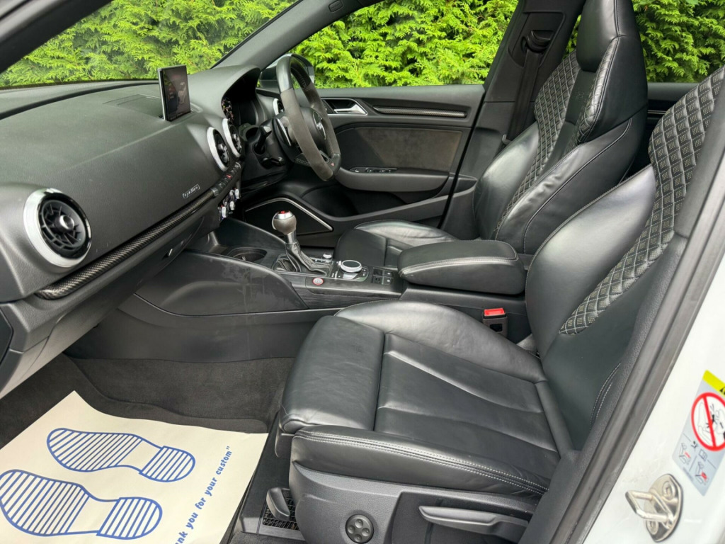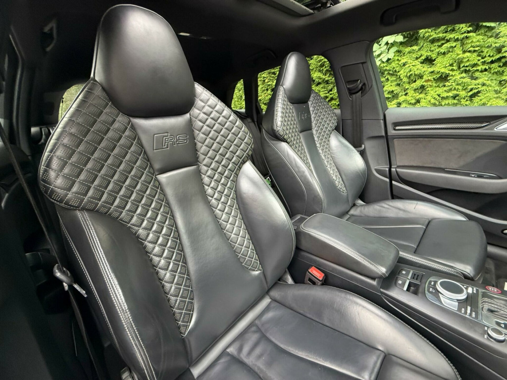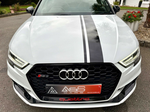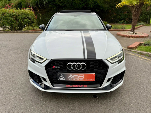 PANORAMIC SUNROOF+SUPER SPORT SEATS+BANG AND OLUFSEN SOUND+AUDI SPORT EXHAUST SYSTEM+MAXTON REAR DIFFUSER AND SPOILER+CARBON INLAYS+ LEATHER & ALCANTRA STEERING+PRIVACY GLASS+HEATED SEATS+WIRELESS CHARGING+APPLE CARPLAY+REVERSE CAMERA+PARKING SENSORS+CRUISE CONTROL+BLACK STRIPES+AUDI SPORT PACK+COMFORT & SOUND PACK - STUNNING LOOKS AND SOUND WITH FINANCE FROM 8.9% APR. - A&S CARS LIMITEDThis 2019 Audi RS3 TFSI Audi Sport Edition boasts a full service history, offering peace of mind for its next owner. Powered by a potent 2.5 litre petrol engine and featuring a sophisticated four wheel drive system, this Euro 6 compliant model delivers exhilarating performance. The Audi Sport Edition trim is enhanced with the Audi Sport Pack, a Comfort and Sound Package including keyless entry, a luxury branded sound system, and rear parking assistance with a camera. Further enhancing its appeal are LED headlights with dynamic rear indicators, a panoramic glass sunroof, and the Audi Smartphone Interface with Android Auto compatibility.Experience impressive acceleration with a 0 to 62mph time of just 4.1 seconds, a testament to the RS3's dynamic capabilities. This vehicle also offers a surprisingly large boot space, making it practical for everyday use as well as thrilling drives. The inclusion of features like the panoramic sunroof and premium sound system clearly sets this Audi RS3 apart, providing a more refined and enjoyable driving experience compared to other vehicles in its class.. 19in Alloy Wheels - 5-Arm Blade Design Audi Sport - Glossy Anthracite Black - Diamond Cut Finish, 6-Airbag System with Knee Airbag for Driver, Aluminium Interior Elements, Anti Theft Locking Wheel Bolts, Anti-Theft Alarm, Audi Beam, Audi Connect Infotainment Services (3 Month Subscription From New), Audi Drive Select, Audi Parking System Plus, Audi Phone Box with Wireless Charging, Audi Smartphone Interface, Audi Sound System, Audi Virtual Cockpit with RS Specific Display, Auto-Dimming Rear-View Mirror, Black Styling Package, Bluetooth Interface, Brake Calipers Painted in Black with RS Logo at the Front, Cruise Control, DAB Digital Radio, Door Mirrors - Black Housing, Door Mirrors - Electrically Adjustable and Heated with Integrated LED Side Indicators, Door Sill Trims - Inlays in Aluminium and Illuminated with RS3 Logo, Dual-Zone Electronic Climate Control, ESC - Electronic Stabilisation Control inc ABS - ASR and EDL, Electric Windows - Front, Email and Text Messages can be Displayed on your Vehicles MMI, First Aid Kit and Warning Triangle, Front Centre Armrest, Headlights Washers, Hill Hold Assist, ISOFIX Child Seat Mounting and Top Tether, Inlays - Carbon, Interior Light Package, LED Headlights with LED Rear Lights and Dynamic Rear Indicators, Light and Rain Sensor, MMI Navigation Plus with MMI Touch, Manual Seat Adjustment, Online Media Streaming, Panoramic Glass Sunroof, Pedals in Stainless Steel, Privacy Glass, Progressive Steering, RS Body Styling, RS Brake System, RS Flat Bottomed 3 Spoke Leather Multi-function Sport Steering Wheel with Alcantara Inserts and Gear Shift Paddles in Aluminium Look - Contrast Stitching and RS Badging, RS Gear Lever Knob in Alcantara with Leather Gaiter with Contrast Stitching, RS Sports Exhaust System, RS Sports Suspension, RS3 Badge on Grille and on Luggage Compartment Lid, Seat Belt Monitoring, Seats - Heated Front, Split Folding Rear Seat Bench - 60-40 or Fully, Storage Package, Tool Kit, Tyre Pressure Warning Light, Tyre Repair Kit, Fine Nappa Leather - RS Embossed Super Sports Seats - Lunar Silver with Granite Grey Stitching with Headlining in Rock Grey, Comfort and Sound Package, PANORAMIC SUNROOF, Audi Sport Pack, REVERSING CAMERA, B&O ADVANCED SURROUND SOUND SYSTEM, CARBON FIBRE INTERIOR, VIRTUAL COCKPIT, AUDI CONNECT, AUDI SMART PHONE INTERFACE WITH APPLE CAR PLAY, AUDI PHONE BOX WITH WIRELESS CHARGING, STYLISH BLACK STRIPE VINYL, MAXTON DIFFUSER, MAXTON SPOILER. Full service history