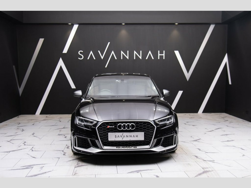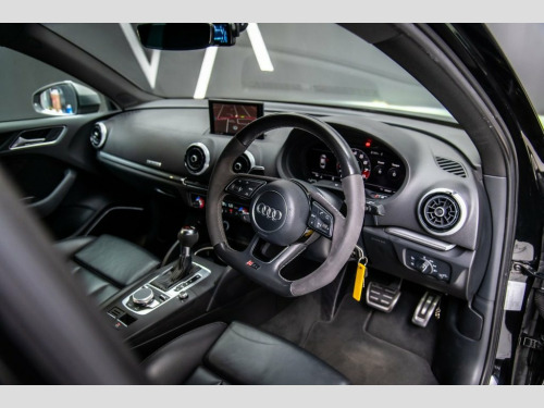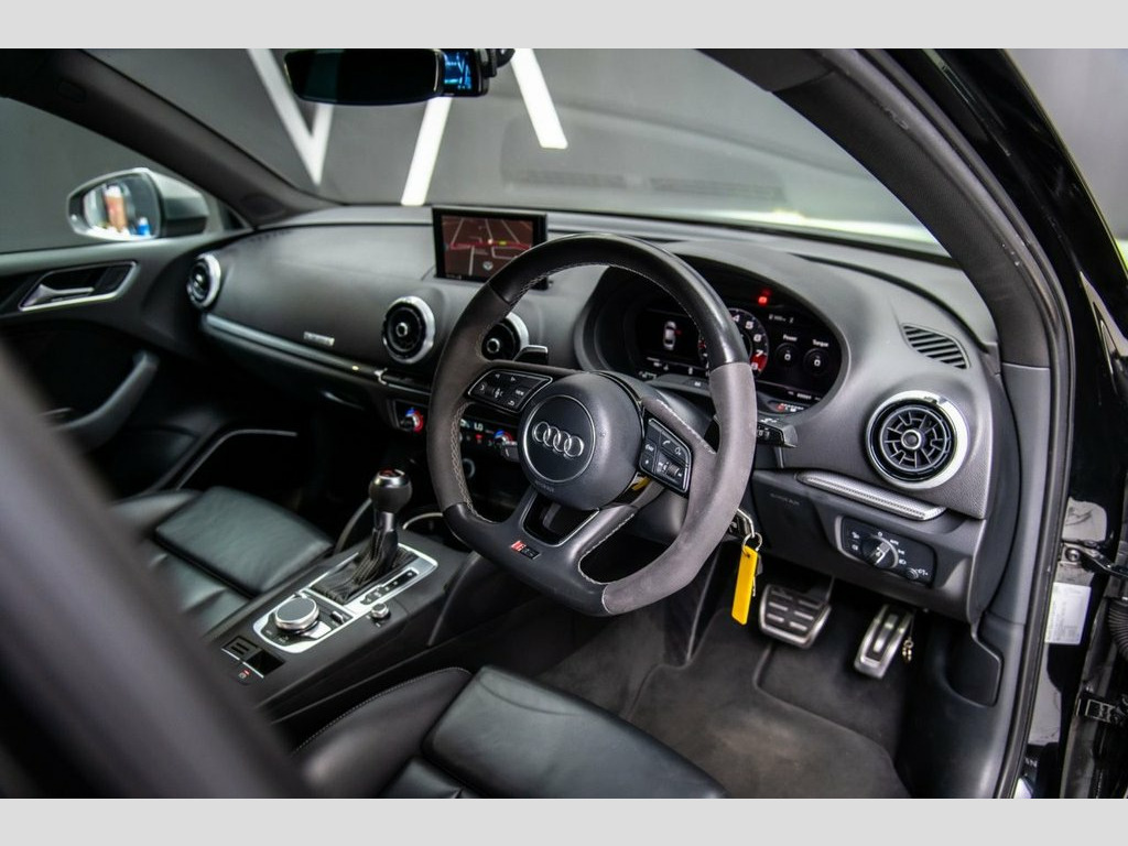 AUDI RS3 2.5 TFSI Saloon 4dr Petrol S Tronic quattro Euro 6 (s/s) (400 ps) — A breathtaking blend of aggressive performance and refined sophistication, presented in stunning Mythos Black with Matt Aluminium accents and 19" 5-Arm Blade Design alloy wheels that perfectly complement its RS body styling and red RS-branded brake calipers. This RS3 has been tastefully enhanced with an MRC Stage 2 tune featuring switchable maps, MTC intercooler, MTC intake pipe and elbow, Scorpion downpipe, and a K&N panel filter, delivering heightened performance while maintaining everyday usability. Recent maintenance includes a gearbox service, Haldex pump replacement, new plugs, coil packs (June 2025), and brand-new Brembo discs and pads with fewer than 100 miles of use, underlining its impeccable mechanical condition. The interior exudes sporting luxury with RS-embossed Fine Nappa Leather sports seats in black with Rock Grey stitching, complemented by Aluminium interior elements, brushed stainless-steel pedals, and illuminated RS door sills. A flat-bottom RS leather and Alcantara steering wheel with contrast stitching and gear shift paddles amplifies driver connection, while technology such as Audi Virtual Cockpit with RS-specific display, MMI Navigation Plus with MMI Touch, Audi Smartphone Interface, and Audi Sound System delivers a cutting-edge driving experience. Practical features include dual-zone climate control, heated front seats, LED headlights with dynamic rear indicato Comfort and Sound Package, 19in Alloy Wheels - 5-Arm Blade Design i, MRC Stage 2 with Switchable Maps (Previo, MTC Intercooler, K&N Panel, MTC Intake Pipe and Elbow, Scorpion Downpipe, PS4S Tyres, Recent Gearbox Service, Haldex Serviced & New Pump Replaceme, New Plugs and Coil Packs (June 2025), New Brembo Discs and Pads (Less than 100, Brake Calipers Painted in Red with RS Lo, Tyre Pressure Monitoring System, Fine Nappa Leather - RS Embossed Sports , Mythos Black, 19in Alloy Wheels - 5-Arm Blade Design, 2 x USB Charging Ports and 1 x AUX-IN, 6-Airbag System with Knee Airbag for Dri, Aluminium Interior Elements, Anti Theft Locking Wheel Bolts, Anti-Theft Alarm, Audi Beam, Audi Connec