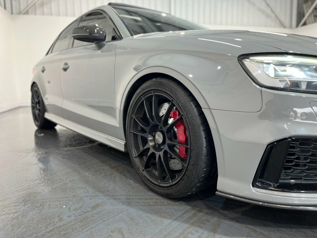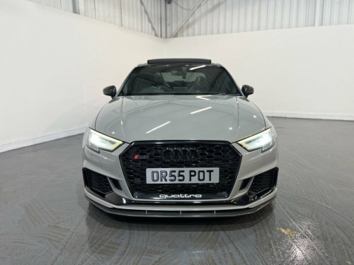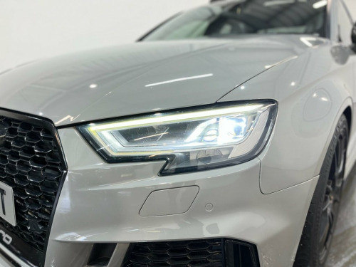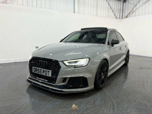 The Audi RS3 2.5 TFSI Saloon is a serious performance car that combines everyday usability with supercar-rivalling pace. Supplied with two keys, this example benefits from a full Audi main dealer service history recorded at 9, 18, 25, 44 and 61 thousand miles, along with a recent Haldex service at 61 thousand miles, offering excellent peace of mind. Powered by the iconic 2.5 TFSI five-cylinder engine producing 400 PS and paired with the S Tronic automatic gearbox and quattro all-wheel drive system, it delivers explosive acceleration and outstanding grip while remaining Euro 6 compliant. Finished in highly desirable Nardo Grey and specified with the RS Design Pack, the car features fine Nappa leather with diamond stitching, front super sport seats, red brake calipers, 19-inch alloy wheels, privacy glass and a panoramic glass sunroof. The Comfort Pack and Audi Sport Pack further enhance the driving experience, while mag ride suspension provides the perfect balance between comfort and performance. Inside, the cabin is packed with technology and premium features including a digital dashboard, Dash camera, Apple CarPlay and Android Auto, dual-zone climate control, ambient interior lighting, cruise control and keyless entry and exit. Heated front seats with three-stage heating, lumbar support and adjustable leg extensions ensure comfort on every journey. Additional security features include a Ghost immobiliser and tracker. This RS3 has been professionally modified to a high standa 19in Alloy Wheels - 5-Arm Blade Design, 2 x USB Charging Ports and 1 x AUX-IN, 6-Airbag System with Knee Airbag for Dri, Aluminium Interior Elements, Anti Theft Locking Wheel Bolts, Anti-Theft Alarm, Audi Beam, Audi Connect Infotainment Services (36 M, Audi Drive Select, Audi Hill Hold Assist, Audi Parking System Plus, Audi Smartphone Interface, Audi Sound System, Audi Virtual Cockpit with RS Specific Di, Auto-Dimming Rear-View Mirror with Light, Bluetooth Interface, Brake Calipers Painted in Black with RS , Cruise Control, DAB Digital Radio, Door Mirrors - Electrically Adjustable a, Dual-Zone Electronic Climate Control, ESC - Electronic Stabilisation Control i, Electric Windows - Front and