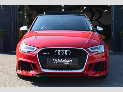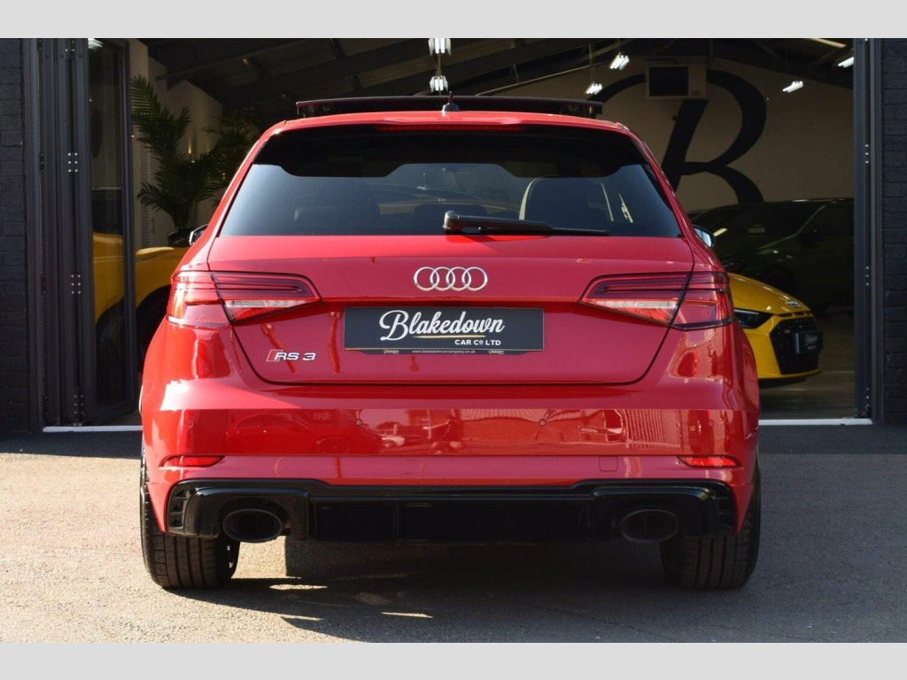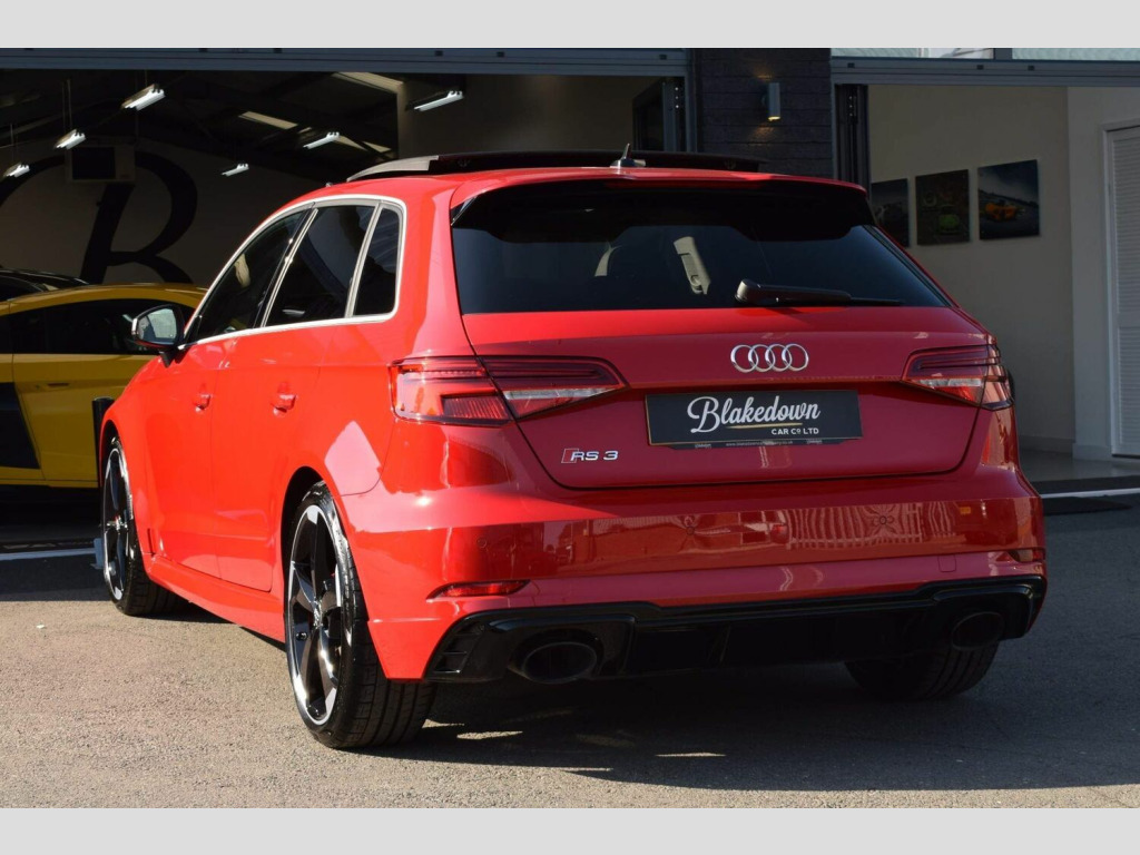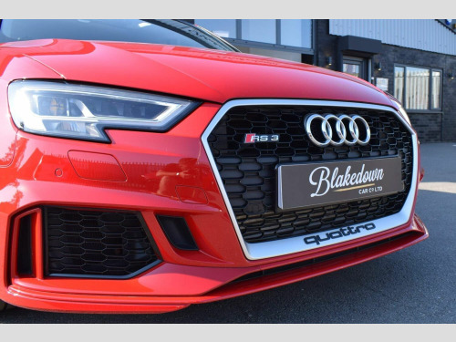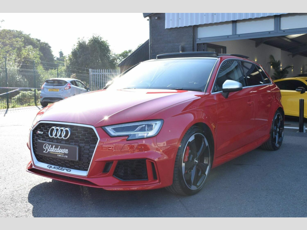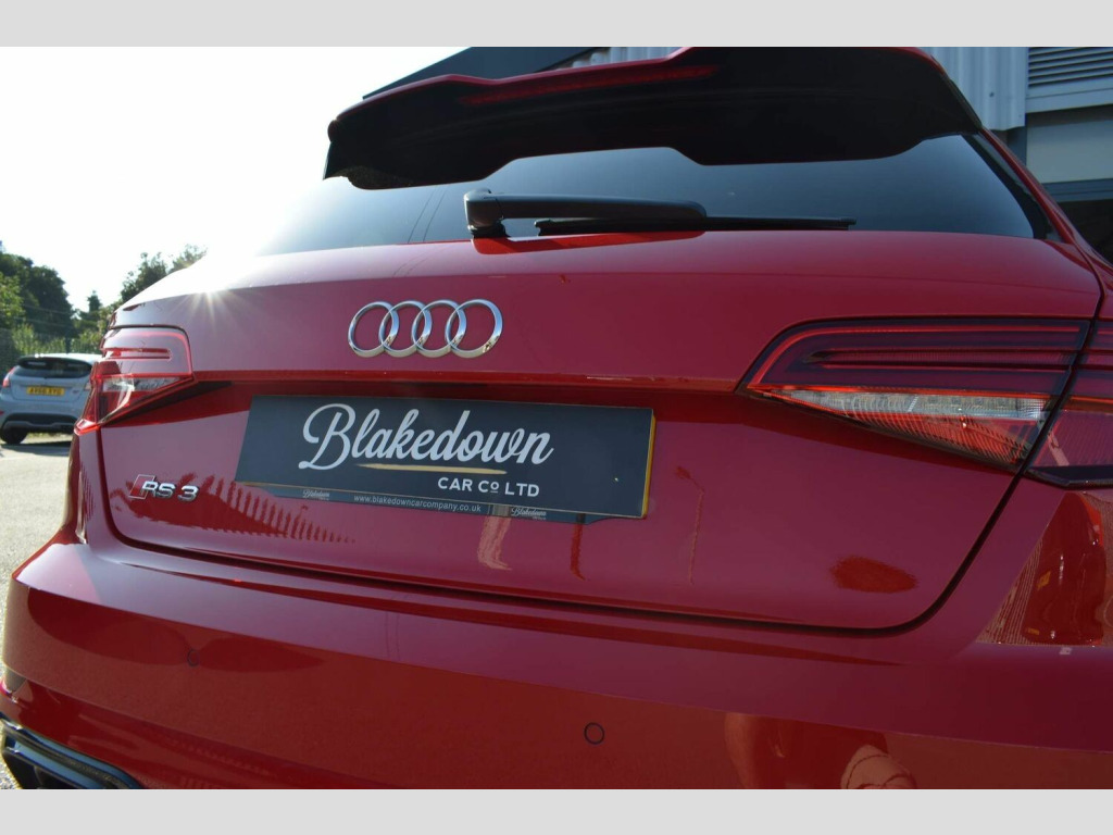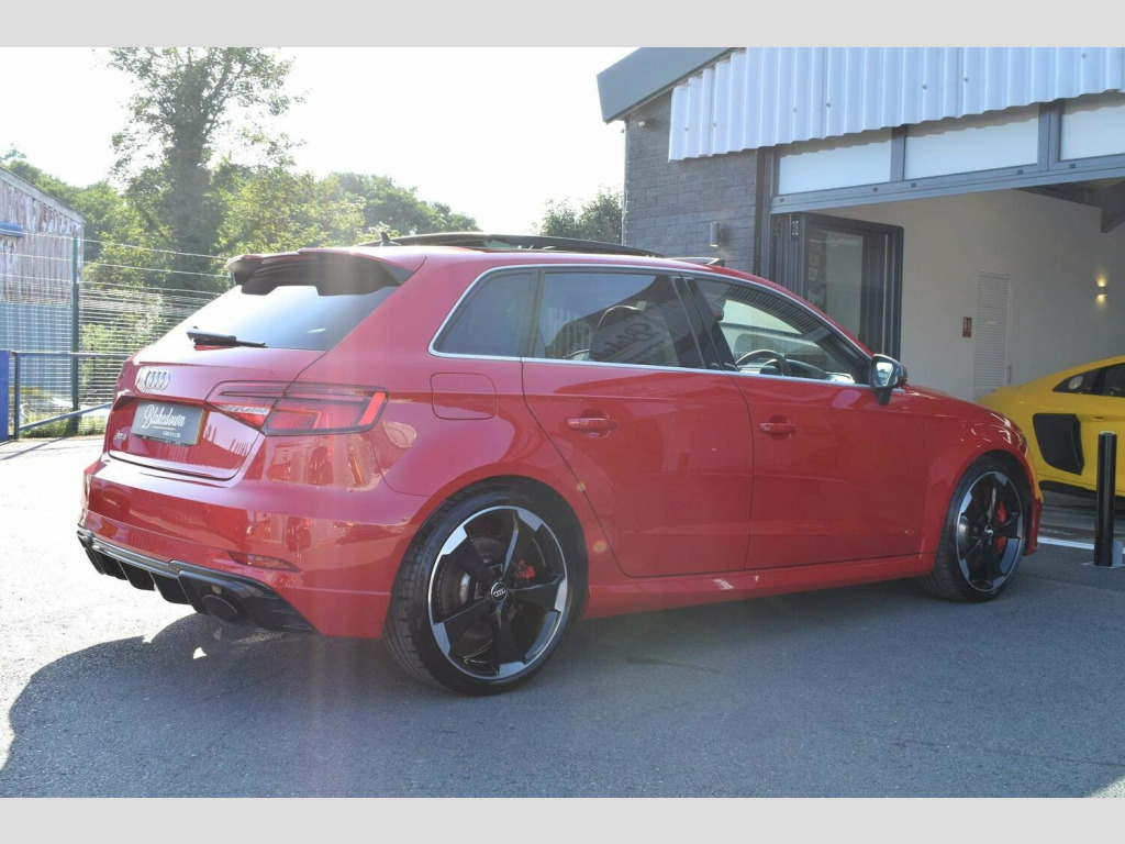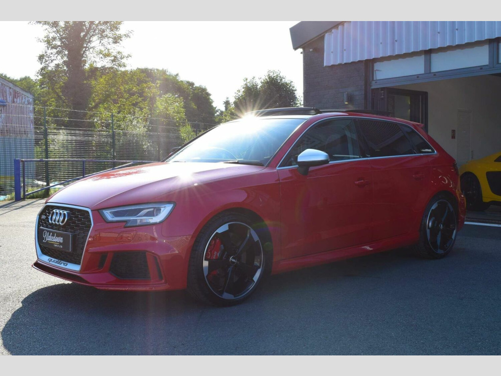 2019 19 Audi RS3 2.5 TFSI Sportback S Tronic Quattro finished in sought after Tango Red Metallic with full black Nappa leather interior and gloss black/diamond turned alloys. Just 5200 miles covered by two owners, backed up by Audi service history. Audi manufacturer warranty in place until July 2022. This RS3 is boasting a great spec with some important optional extras to include: Audi Sport Pack (Audi Sports Exhaust and Magnetic Ride), Matrix LED Headlights with LED Rear Lights and Dynamic Front and Rear Indicators, Panoramic Glass Sunroof, Brake Calipers Painted in Red with RS Logo at the Front and Tyre Pressure Monitoring System. A totally standard and unmodified car presented in excellent condition inside and out as you would expect from a low mileage, enthusiast owned RS3. 2 remote keys and all correct documentation/handbooks etc present. Other features include: 2 x USB Charging Ports and 1 x AUX-IN, Audi Parking System Plus, Audi Phone Box with Wireless Charging, Audi Smartphone Interface, Audi Virtual Cockpit with RS Specific Display, Cruise Control, DAB Digital Radio, Heated Front Seats, Interior Light Package, MMI Navigation Plus including MMI Touch, Privacy Glass, RS Flat Bottomed 3 Spoke Leather Multi-function Sport Steering Wheel with Alcantara Inserts and Gear Shift Paddles in Aluminium Look, Voice Control and more. FINANCE FROM 6.9% APR | GTECHNIQ DETAILING & CERAMIC COATINGS | XPEL PAINT PROTECTION FILM