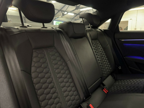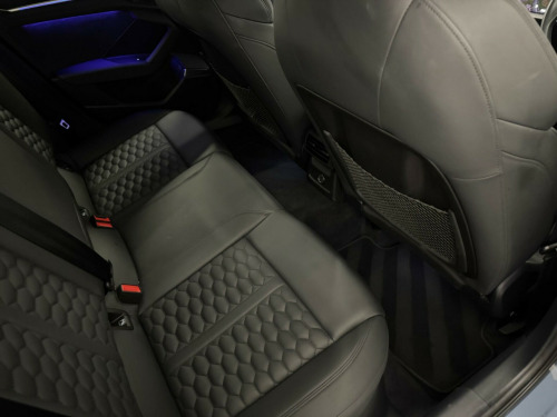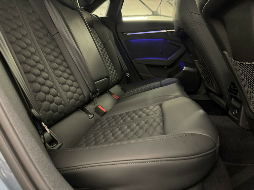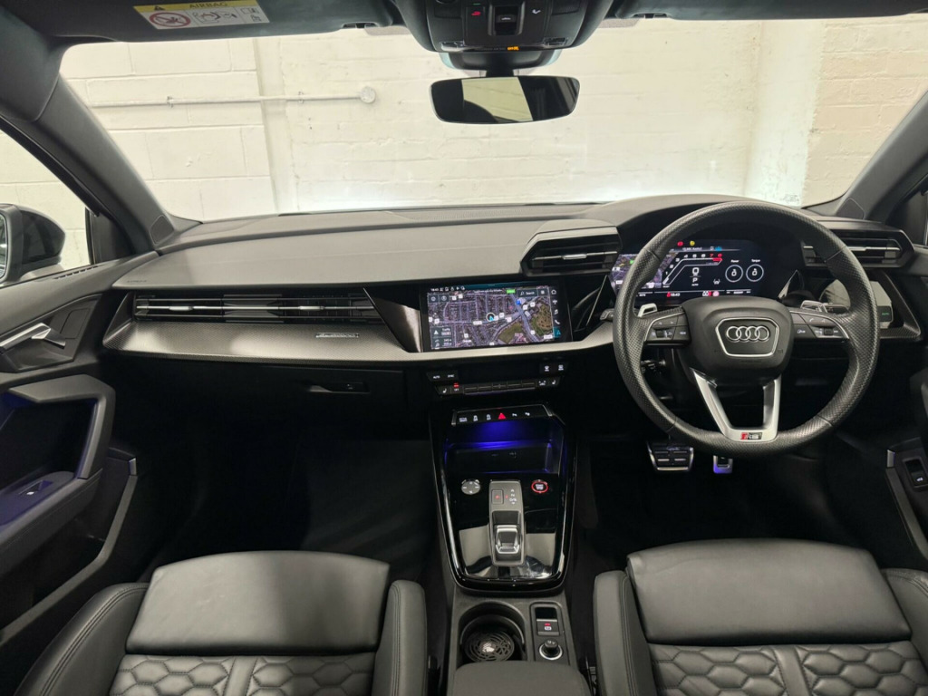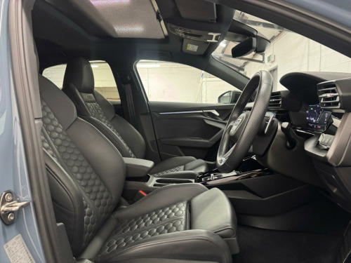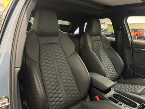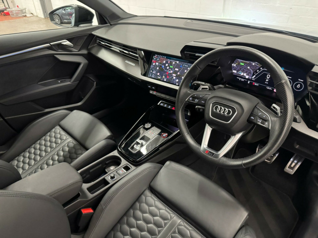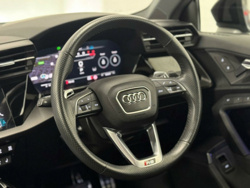 THIS STUNNING AUDI RS3 VORSPRUNG FINISHED IN KEMORA GREY MUST BE ONE OF THE CLEANEST EXAMPLES AVAILABLE. TOTALLY UNMARKED CONDITION, JUST ONE LADY OWNER FROM NEW, FULL AUDI SERVICE HISTORY, SERVICE PACK REMAINING WITH AUDI, SUPPLIED WITH BOTH ORIGINAL KEYS. UNDER MANUFACTURE WARRANTY.HUGE SPECIFICATION INCLUDING PANORAMIC GLASS SUNROOF, HEATED SUPER SPORT SEATS, ADAPTIVE CRUISE CONTROL, SPORTS EXHAUST, ADAPTIVE SUSPENSION, BANG AND OLUSFEN SOUND SYSTEM, INCREASED TOP SPEED, AUDI MATRIX LED HEADLIGHTS, APPLE CAR PLAY, SELF PARKING, ALL USUAL VORSPRUNG REFINEMENTS ne nappa leather - black, rear side airbags with head airbag system, 19in alloy wheels - 5-y-spoke-black with graphic print, 4-way lumbar support for front seats, adaptive cruise control, adaptive suspension with audi drive select, airbags - driver and front passenger with passenger airbag deactivation, aluminium interior elements, ambient lighting pack, anti theft locking wheel bolts, anti-theft alarm, audi beam, audi connect emergency call and service, audi connect infotainment services (3 month subscription from new), audi drive select, audi matrix led headlights with led rear lights - dynamic front and rear indicators - headlight cleaning system, audi pre-sense front, audi smartphone interface, audi virtual cockpit with rs specific display, auto-dimming rear-view mirror, black styling pack, bluetooth interface, brake calipers painted in black with rs logo at the front, camera based traffic sign recognition, cloth headlining in black, collision avoidance assistant, comfort and sound package, dab digital radio, door mirrors - electrically adjustable - heated - folding - automatically dimming with memory function and integrated led indicators with kerb view function for passenger side, door sill trims - inlays in aluminium and illuminated with rs3 logo, driver assistance package, dual-zone electronic climate control, esc - electronic stabilisation control inc abs - asr and edl, electric windows - front, electrically adjustable front seats with memory function for drivers side, electronically operated child locks, first aid kit and warning triangle, front centre armrest, front side airbags with head airbags and interaction airbag, front and rear floor mats, head-up display, headlights washers, heated front seats, hill hold assist, i-size and top tether child seat mounting for the outer rear seats, interior inlays - full decorative carbon trim, lane departure warning, legal emergency call - e-call, light and rain sensor, mmi navigation plus with mmi touch, manual boot compartment lid, matt aluminium look door mirrors, matt aluminium look window trims, parking assist with parking system plus, pedals in stainless steel and footrest in black, power operated tailgate, privacy glass, progressive steering, rs body styling, rs emblem, rs exterior features in gloss black, rs sport exhaust system, rear suspension, remote central locking, reversing camera, roof colour in bodycolour, seat belt reminder with passenger presence detection in rear, side skirts in black, split folding rear seat bench - 60-40 or fully, steering wheel - 3-spoke leather-multi-function, storage package, tool kit, tyre pressure loss indicator, tyre repair kit, windscreen with acoustic glazing, windshield with heat insulated glass
