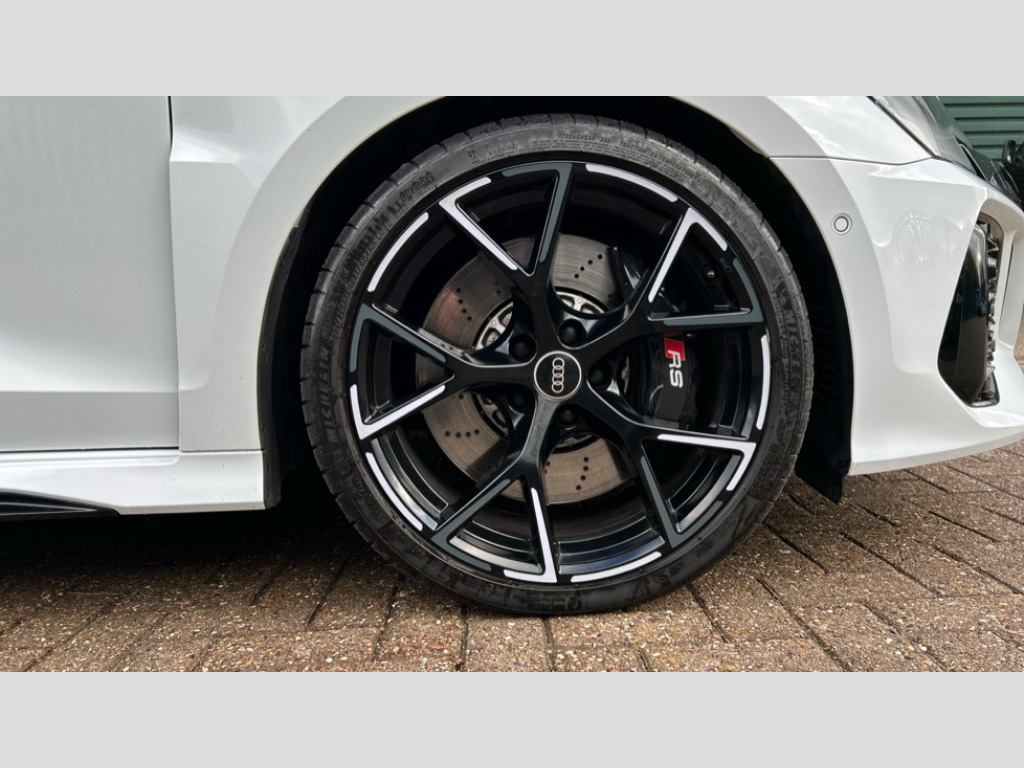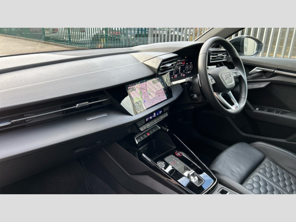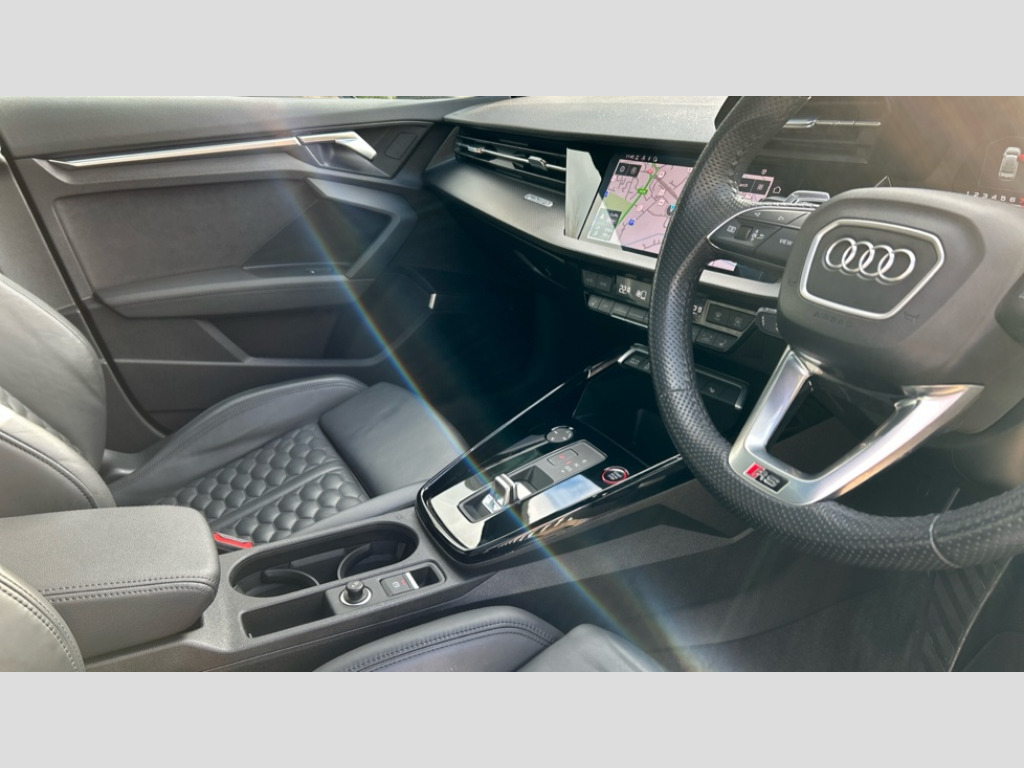 Audi RS3 RS 3 TFSI Quattro Vorsprung 4dr S Tronic Audi smartphone interface, Audi virtual cockpit with RS specific display 12.3" full colour digital instrument cluster, Automatic start/stop system with recuperation, Bluetooth interface, Collision avoidance assistant, Emergency e-call, Head up Display, Lane departure warning system, Legal emergency call, Parking assist with parking system plus, Power operated tailgate - Luggage compartment lid opens electrically, Progressive power assisted steering, Reversing camera, Quattro permanent four wheel drive, Rear suspension, DAB Digital radio, 3rd brake light, Acoustic glass windscreen, Audi beam uses LEDs to project the Audi sport logo onto the ground as you exit your RS 3, Audi matrix LED headlights, LED rear lights, dynamic front and rear indicators and headlight cleaning system, Auto dimming rear view mirror, Black side skirts, Body colour roof, Carbon fibre engine cover, Electric adj heated/folding + auto dimming exterior mirrors with memory + LED indicator + auto kerb side function for passenger side exterior mirror, Front spoiler in high gloss black, Heat insulating glass windscreen, LED daytime running lights, Light and rain sensors, Panoramic glass sunroof, Privacy glass - dark tinted rear and rear side windows from B-pillar backwards, Rear boot, Rear side wing doors, RS exterior features in gloss black, RS sports exhaust system, 3 seat bench in 2nd row, 3 spoke leather multifunction steering wheel with gear shift paddles, 4 way lumbar support for front seats, 40/20/40 split folding rear seat bench, Black cloth headlining, Dual zone electronic climate control, Electrically adjustable front seats with memory function for driver's side, Front and rear headrests, Front centre armrest, Front sports seats RS embossed logo, Front/rear floor mats, Heated front seats, Honeycomb stitching and RS embossing, Illuminated door sill trims inlays in aluminium with RS 3 logo, RS emblems, Single front passenger seat, Stainless steel pedals and front footrest in black, Aluminium interior elements pack - RS3, Ambient lighting pack - RS3, Comfort and sound pack - RS3, Driver assistance pack with 3 spoke leather multi function steering wheel - RS3, MMI navigation plus with MMI touch - RS3, RS bodystyling - RS3, Storage Pack - RS3, 3x3 point rear seat belts, ABS/EBD, ASR, Audi pre sense front, Driver/Front Passenger airbags, EDL, ESC - Electronic Stability Control + traction control, Front passenger airbag deactivation, Front side airbags with head airbags and interaction airbag, Hill hold assist, Seat belt reminder with passenger presence detection in rear, Tyre pressure loss indicator, Warning triangle and first aid kit, Anti theft alarm, Anti-theft wheel bolts, Electronically operated child lock, Remote control central locking, Full decorative carbon trim, 19" 5 Y spoke black with graphic print alloy wheels, Tool kit, Tyre repair kit