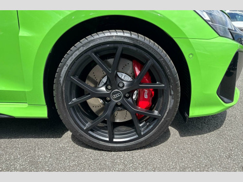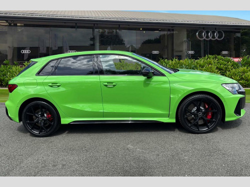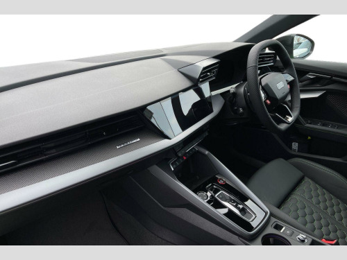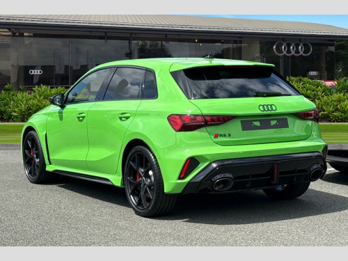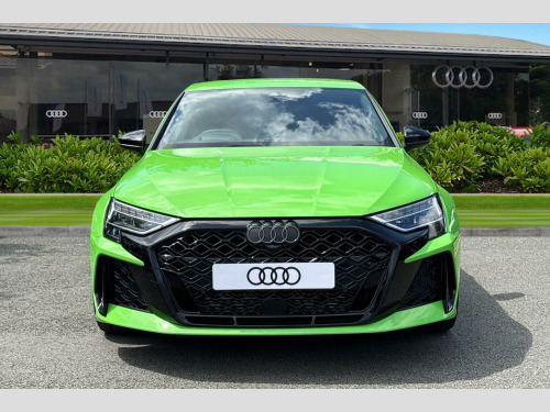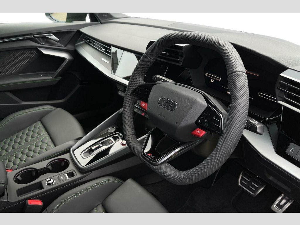 Price shown includes a deposit contribution of £3475 when purchased on finance by 31/12/25. Solutions Personal Contract Plan. 8.9% APR Representative. Audi Financial Services. Terms and Conditions apply. Brake Calipers - Red, Fine Nappa Leather - RS Embossed Sports Seats - Honeycomb Pattern - Black with Micrommata Green Contrast Stitching, 12v Socket and Storage Compartment in Front Centre Console, 19in Alloy Wheels - 5-Y-Spoke-Matt Black, 3-Zone Deluxe Automatic Air Conditioning, 4-Way Lumbar Support for Front Seats, Airbags - Driver and Front Passenger with Passenger Airbag Deactivation, Ambient Lighting Package Pro, Anti Theft Locking Wheel Bolts, Anti-Theft Alarm, Audi App Store and Smartphone Interface, Audi Beam, Audi Connect Navigation and Infotainment Services Plus (3 Year Subscription From New), Audi Drive Select, Audi Phone Box with Wireless Charging, Audi Pre-Sense Front, Audi Virtual Cockpit with RS Specific Design and 12.3in Display, Auto Dimming and Frameless Rear View Mirror, Automatic Start-Stop System with Recuperation, Black Styling Pack Plus, Camera Based Traffic Sign Recognition, Cloth Headlining in Black, Collision Avoidance Assistant, DAB Digital Radio, Distraction and Fatigue Warning, Door Mirrors - Electrically Adjustable - Heated - Folding - Automatically Dimming with Integrated LED Indicators and Kerb View Function for Passenger Side, Door Sill Trims with RS3 Logo, ESC - Electronic Stabilisation Control inc ABS - ASR and EDL, Electronically Operated Child Locks, Emergency Call - E-Call, First Aid Kit and Warning Triangle and 2 Safety Vests, Front Centre Armrest, Front Side Airbags with Head Airbags and Interaction Airbag, Front Sports Seats, Front and Rear Floor Mats, Heated Front Seats, Hill Hold Assist, I-Size and Top Tether Child Seat Mounting for the Outer Rear Seats, Inlays - Dynamica Microfibre - Black, Interior Accents in Vanadium Look, LED Headlights with LED Rear Lights and Dynamic Rear Indicators, Lane Departure Warning, Light and Rain Sensor, MMI Navigation Plus with High Resolution 10.1in Touchscreen Colour Display, Manual Boot Compartment Lid, Model Badging - Exterior, Parking Assist with Parking System Plus, Pedals in Stainless Steel and Footrest in Black, Privacy Glass, Progressive Steering, RS Exterior Styling, RS Sport Exhaust System, RS Sports Suspension, RS Steel Brakes with Black Calipers with RS Logo, Remote Central Locking with Safelock, Roof Spoiler in Body Colour, Seat Belt Monitoring, Speed Limiter - Adjustable, Split Folding Rear Seat Bench - 60-40 or Fully, Steering Wheel - Flat Top and Bottomed 3-Spoke Black Leather Multifunction with Shift Paddles in Vanadium Look - Rhombus RS Logo, Storage Package, Technology Pack, Tool Kit, Tyre Pressure Loss Indicator, Tyre Repair Kit, USB Ports with Charging Function in Rear
