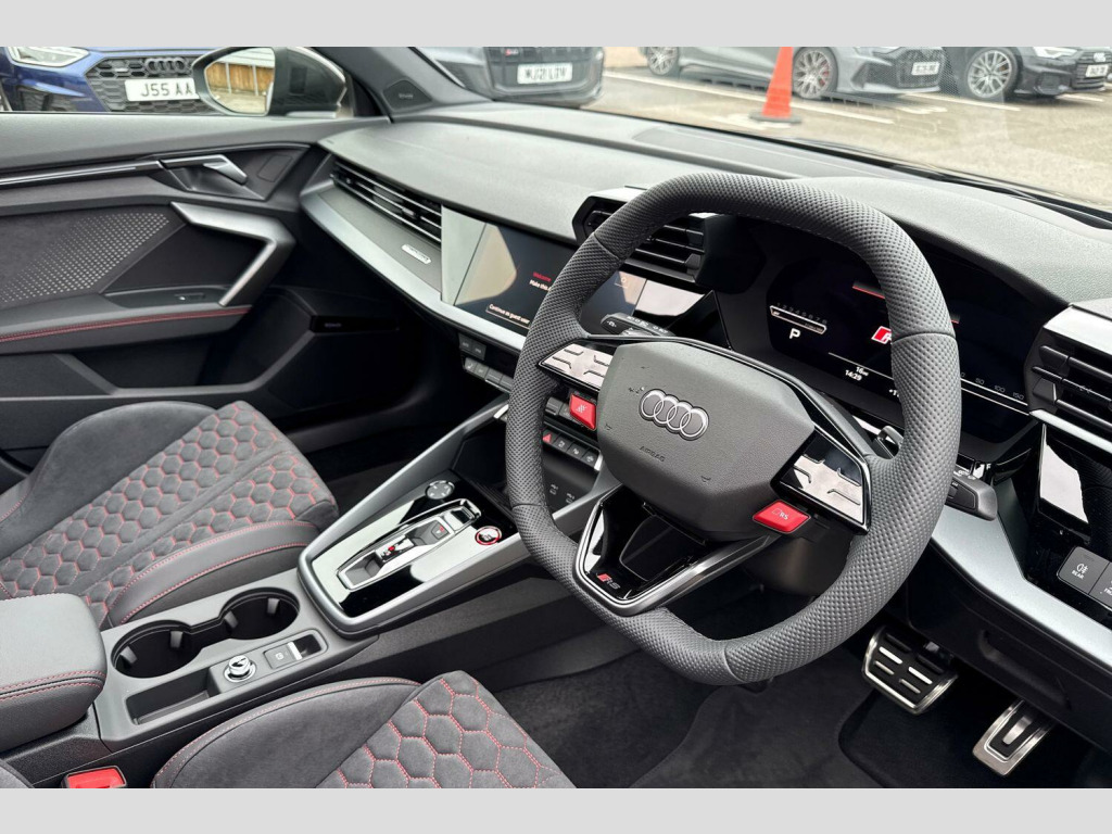 Brake Calipers - Red, 19in Alloy Wheels - 10-Cross-Spoke Silk Matt Grey, Dinamica Microfibre-Leather - RS Bucket Seats - Honeycomb Pattern - Black with Express Red Contrast Stitching, 12v Socket and Storage Compartment in Front Centre Console, 19in Alloy Wheels - 10-Cross-Spoke Black Metallic, 3-Zone Deluxe Automatic Air Conditioning, 4-Way Lumbar Support for Front Seats, Adaptive Suspension with Audi Drive Select, Airbags - Driver and Front Passenger with Passenger Airbag Deactivation, Ambient Lighting Package Pro, Anti Theft Locking Wheel Bolts, Anti-Theft Alarm, Audi App Store and Smartphone Interface, Audi Beam, Audi Connect Navigation and Infotainment Services Plus (3 Year Subscription From New), Audi Phone Box with Wireless Charging, Audi Pre-Sense Front, Audi Virtual Cockpit with RS Specific Design and 12.3in Display, Auto Dimming and Frameless Rear View Mirror, Automatic Start-Stop System with Recuperation, Black Styling Pack Plus, Camera Based Traffic Sign Recognition, Carbon Door Mirrors, Carbon Tailgate Spoiler, Cloth Headlining in Black, Collision Avoidance Assistant, DAB Digital Radio, Distraction and Fatigue Warning, Door Mirrors - Electrically Adjustable - Heated - Folding - Automatically Dimming with Memory Function and Integrated LED Indicators with Kerb View Function for Passenger Side, Door Sill Trims with RS3 Logo, ESC - Electronic Stabilisation Control inc ABS - ASR and EDL, Electrically Adjustable Front Seats with Memory Function for Drivers Side, Electronically Operated Child Locks, Emergency Call - E-Call, Engine Compartment Cover with Carbon Trim, First Aid Kit and Warning Triangle and 2 Safety Vests, Front Centre Armrest, Front Side Airbags with Head Airbags and Interaction Airbag, Front Sports Seats, Front and Rear Floor Mats, Heated Front Seats, Hill Hold Assist, I-Size and Top Tether Child Seat Mounting for the Outer Rear Seats, Inlays - Carbon Atlas Structure, Interior Accents in Vanadium Look, Lane Departure Warning, Light and Rain Sensor, MMI Navigation Plus with High Resolution 10.1in Touchscreen Colour Display, Manual Boot Compartment Lid, Model Badging - Exterior, Panoramic Sunroof, Parking Assist with Parking System Plus, Pedals in Stainless Steel and Footrest in Black, Privacy Glass, Progressive Steering, RS Exterior Features in Carbon - Gloss Black, RS Sport Exhaust System, RS Steel Brakes with Black Calipers with RS Logo, Remote Central Locking with Safelock, Seat Belt Monitoring, Speed Limiter - Adjustable, Split Folding Rear Seat Bench - 60-40 or Fully, Steering Wheel - Flat Top and Bottomed 3-Spoke Black Leather Multifunction with Shift Paddles in Vanadium Look - Rhombus RS Logo, Storage Package, Technology Pack, Technology Pack Pro, Tool Kit, Top Speed Restriction Increase to 174mph, Tyre Pressure Loss Indicator, Tyre Repair Kit, USB Ports with Charging Function in Rear