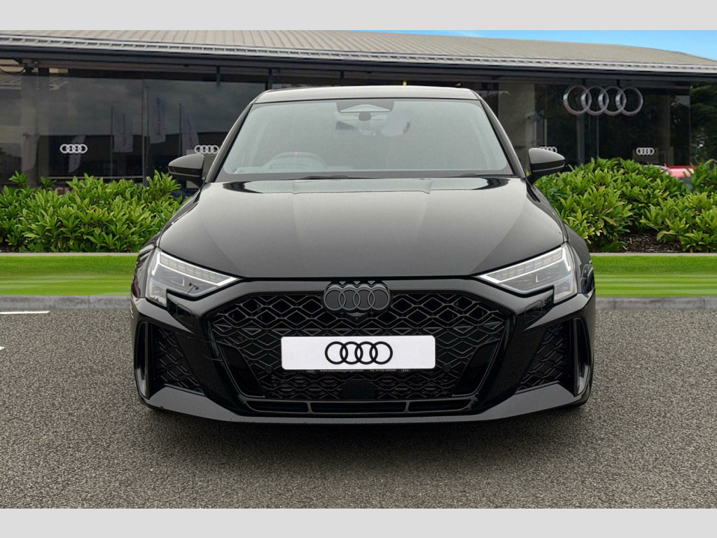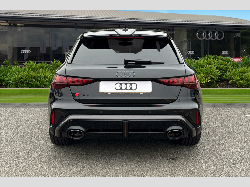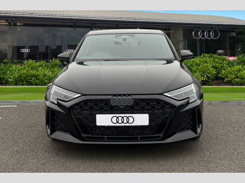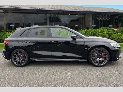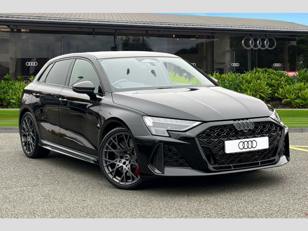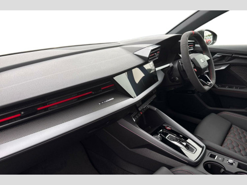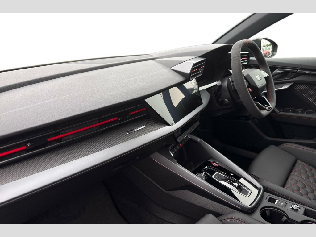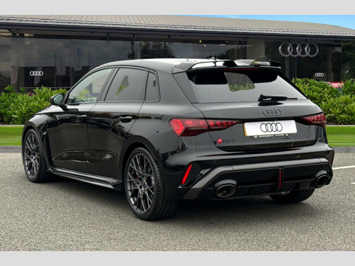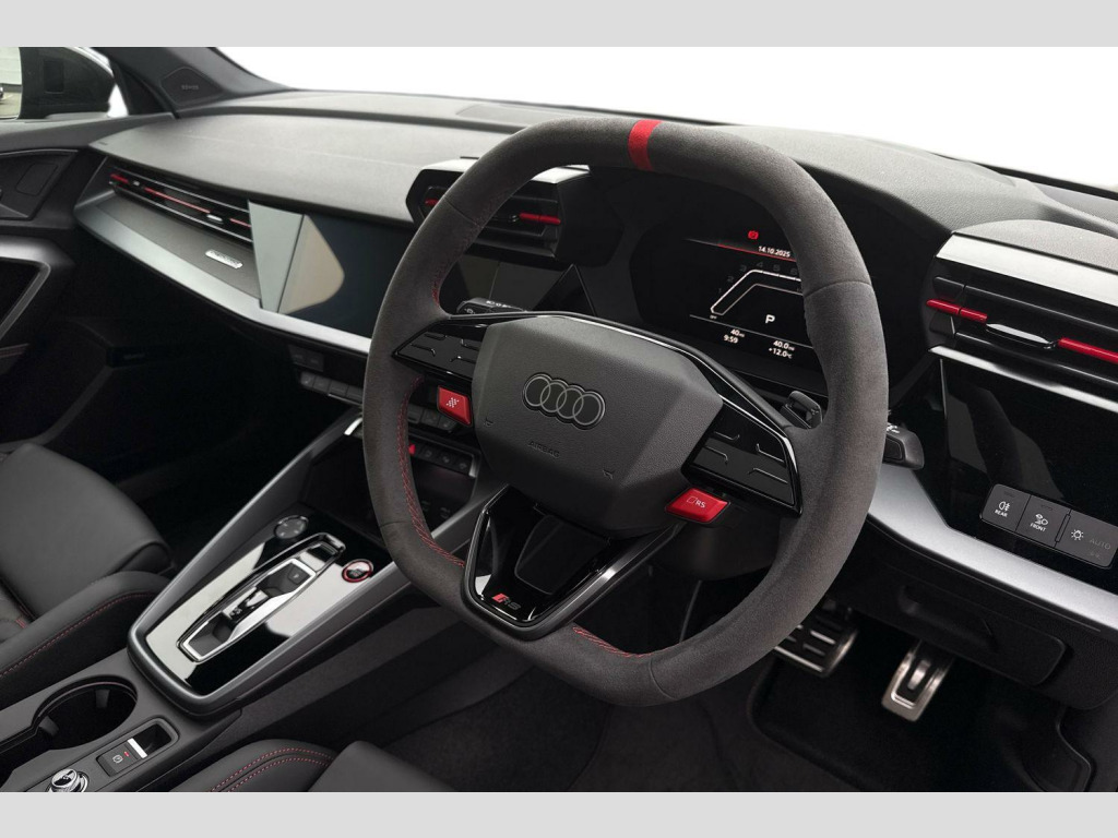 Price shown includes a deposit contribution of £3475 when purchased on finance by 31/12/25. Solutions Personal Contract Plan. 8.9% APR Representative. Audi Financial Services. Terms and Conditions apply. RS Design Pack Plus - Red, Brake Calipers - Red, 19in Alloy Wheels - 10-Cross-Spoke Silk Matt Grey, 12v Socket and Storage Compartment in Front Centre Console, 19in Alloy Wheels - 10-Cross-Spoke Black Metallic, 3-Zone Deluxe Automatic Air Conditioning, 4-Way Lumbar Support for Front Seats, Adaptive Suspension with Audi Drive Select, Airbags - Driver and Front Passenger with Passenger Airbag Deactivation, Ambient Lighting Package Pro, Anti Theft Locking Wheel Bolts, Anti-Theft Alarm, Audi App Store and Smartphone Interface, Audi Beam, Audi Connect Navigation and Infotainment Services Plus (3 Year Subscription From New), Audi Phone Box with Wireless Charging, Audi Pre-Sense Front, Audi Virtual Cockpit with RS Specific Design and 12.3in Display, Auto Dimming and Frameless Rear View Mirror, Automatic Start-Stop System with Recuperation, Black Styling Pack Plus, Camera Based Traffic Sign Recognition, Carbon Door Mirrors, Carbon Roof Spoiler, Cloth Headlining in Black, Collision Avoidance Assistant, DAB Digital Radio, Distraction and Fatigue Warning, Door Mirrors - Electrically Adjustable - Heated - Folding - Automatically Dimming with Memory Function and Integrated LED Indicators with Kerb View Function for Passenger Side, Door Sill Trims with RS3 Logo, ESC - Electronic Stabilisation Control inc ABS - ASR and EDL, Electrically Adjustable Front Seats with Memory Function for Drivers Side, Electronically Operated Child Locks, Emergency Call - E-Call, Engine Compartment Cover with Carbon Trim, First Aid Kit and Warning Triangle and 2 Safety Vests, Front Centre Armrest, Front Side Airbags with Head Airbags and Interaction Airbag, Front Sports Seats, Front and Rear Floor Mats, Heated Front Seats, Hill Hold Assist, I-Size and Top Tether Child Seat Mounting for the Outer Rear Seats, Inlays - Carbon Atlas Structure, Interior Accents in Vanadium Look, Lane Departure Warning, Light and Rain Sensor, MMI Navigation Plus with High Resolution 10.1in Touchscreen Colour Display, Manual Boot Compartment Lid, Model Badging - Exterior, Panoramic Sunroof, Parking Assist with Parking System Plus, Pedals in Stainless Steel and Footrest in Black, Privacy Glass, Progressive Steering, RS Exterior Features in Carbon - Gloss Black, RS Sport Exhaust System, RS Steel Brakes with Black Calipers with RS Logo, Remote Central Locking with Safelock, Seat Belt Monitoring, Speed Limiter - Adjustable, Split Folding Rear Seat Bench - 60-40 or Fully, Steering Wheel - Flat Top and Bottomed 3-Spoke Black Leather Multifunction with Shift Paddles in Vanadium Look - Rhombus RS Logo, Storage Package, Technology Pack, Technology Pack Pro, Tool Kit, Top Speed Restriction Increase to 174mph, Tyre Pressure Loss Indicator, Tyre Repair Kit, USB Ports with Charging Function in Rear