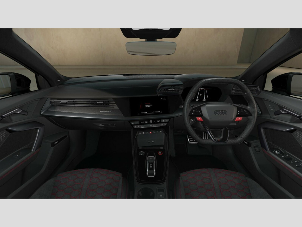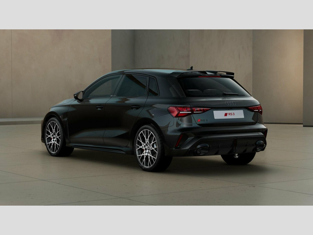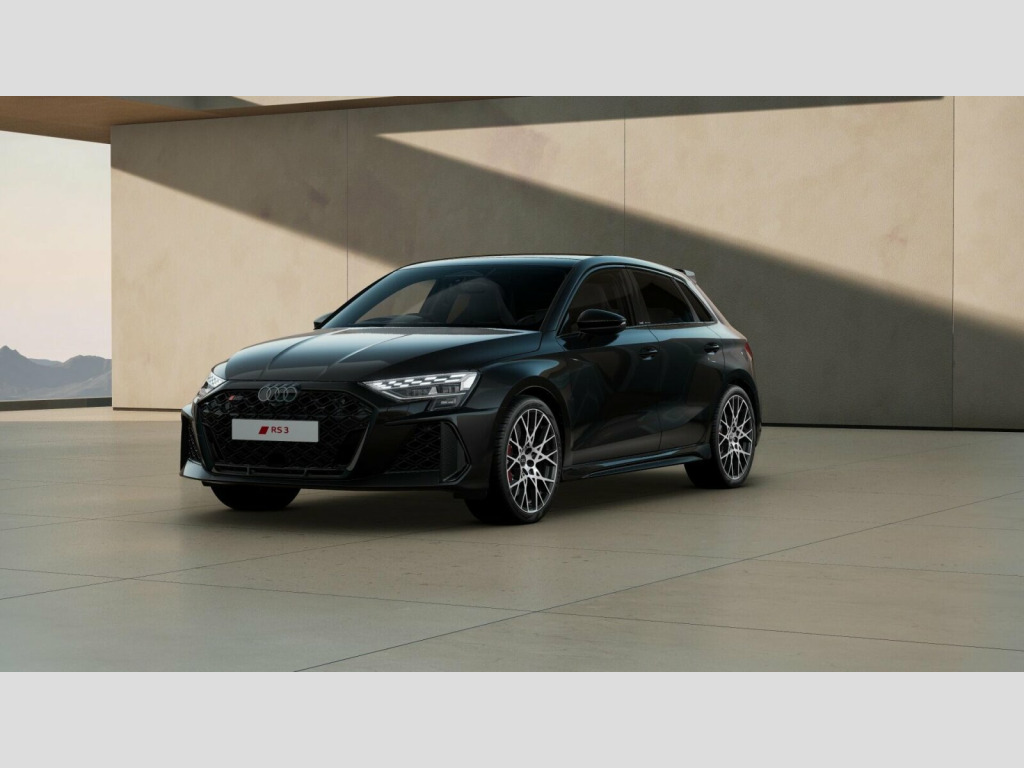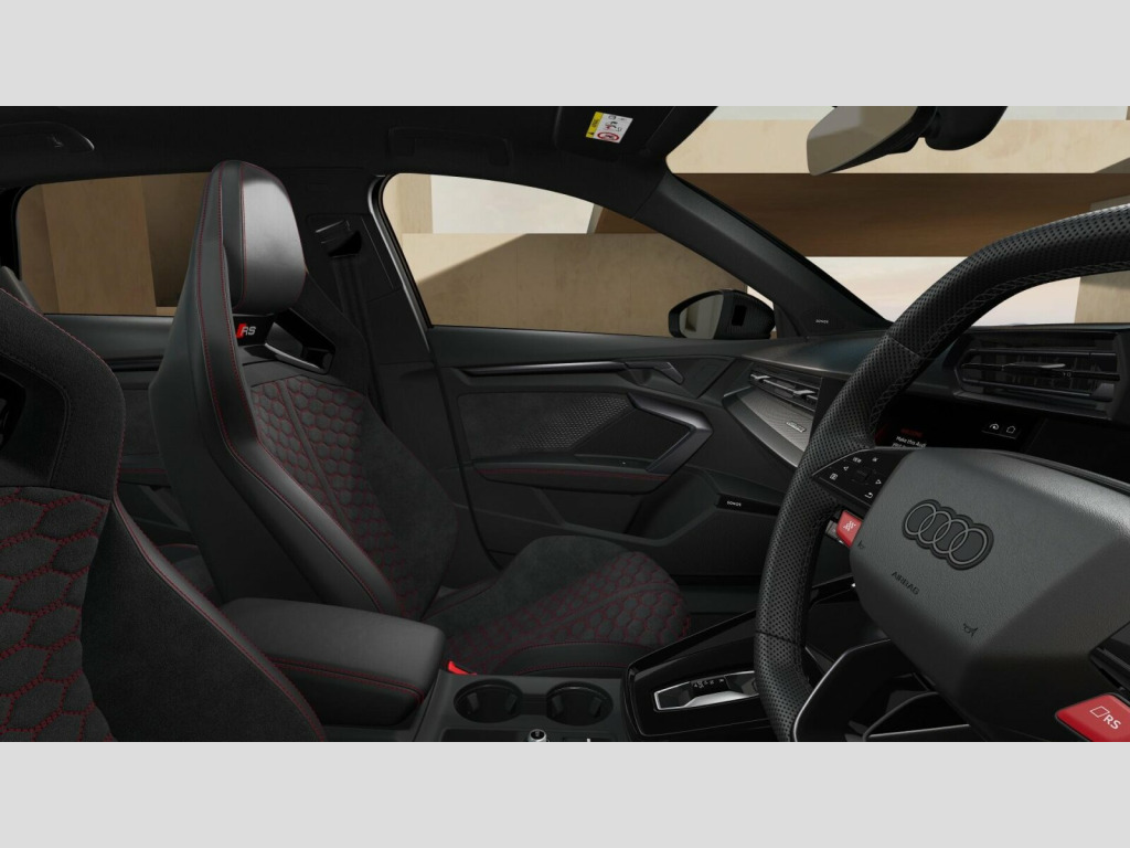Price shown includes a deposit contribution of £3475 when purchased on finance by 31/12/25. Solutions Personal Contract Plan. 8.9% APR Representative. Audi Financial Services. Terms and Conditions apply. Brake Calipers - Red, Dinamica Microfibre-Leather - RS Bucket Seats - Honeycomb Pattern - Black with Express Red Contrast Stitching, 12v Socket and Storage Compartment in Front Centre Console, 19in Alloy Wheels - 10-Cross-Spoke Black Metallic, 3-Zone Deluxe Automatic Air Conditioning, 4-Way Lumbar Support for Front Seats, Adaptive Suspension with Audi Drive Select, Airbags - Driver and Front Passenger with Passenger Airbag Deactivation, Ambient Lighting Package Pro, Anti Theft Locking Wheel Bolts, Anti-Theft Alarm, Audi App Store and Smartphone Interface, Audi Beam, Audi Connect Navigation and Infotainment Services Plus (3 Year Subscription From New), Audi Phone Box with Wireless Charging, Audi Pre-Sense Front, Audi Virtual Cockpit with RS Specific Design and 12.3in Display, Auto Dimming and Frameless Rear View Mirror, Automatic Start-Stop System with Recuperation, Black Styling Pack Plus, Camera Based Traffic Sign Recognition, Carbon Door Mirrors, Carbon Roof Spoiler, Cloth Headlining in Black, Collision Avoidance Assistant, DAB Digital Radio, Distraction and Fatigue Warning, Door Mirrors - Electrically Adjustable - Heated - Folding - Automatically Dimming with Memory Function and Integrated LED Indicators with Kerb View Function for Passenger Side, Door Sill Trims with RS3 Logo, ESC - Electronic Stabilisation Control inc ABS - ASR and EDL, Electrically Adjustable Front Seats with Memory Function for Drivers Side, Electronically Operated Child Locks, Emergency Call - E-Call, Engine Compartment Cover with Carbon Trim, First Aid Kit and Warning Triangle and 2 Safety Vests, Front Centre Armrest, Front Side Airbags with Head Airbags and Interaction Airbag, Front Sports Seats, Front and Rear Floor Mats, Heated Front Seats, Hill Hold Assist, I-Size and Top Tether Child Seat Mounting for the Outer Rear Seats, Inlays - Carbon Atlas Structure, Interior Accents in Vanadium Look, Lane Departure Warning, Light and Rain Sensor, MMI Navigation Plus with High Resolution 10.1in Touchscreen Colour Display, Manual Boot Compartment Lid, Model Badging - Exterior, Panoramic Sunroof, Parking Assist with Parking System Plus, Pedals in Stainless Steel and Footrest in Black, Privacy Glass, Progressive Steering, RS Exterior Features in Carbon - Gloss Black, RS Sport Exhaust System, RS Steel Brakes with Black Calipers with RS Logo, Remote Central Locking with Safelock, Seat Belt Monitoring, Speed Limiter - Adjustable, Split Folding Rear Seat Bench - 60-40 or Fully, Steering Wheel - Flat Top and Bottomed 3-Spoke Black Leather Multifunction with Shift Paddles in Vanadium Look - Rhombus RS Logo, Storage Package, Technology Pack, Technology Pack Pro, Tool Kit, Top Speed Restriction Increase to 174mph, Tyre Pressure Loss Indicator, Tyre Repair Kit, USB Ports with Charging Function in Rear