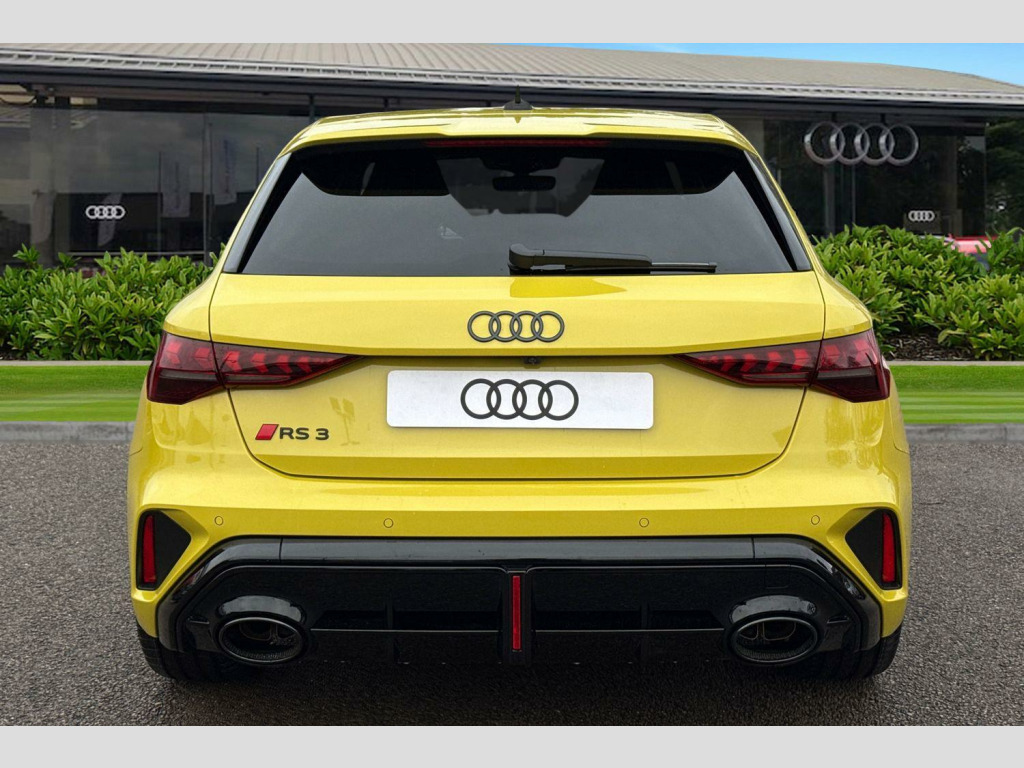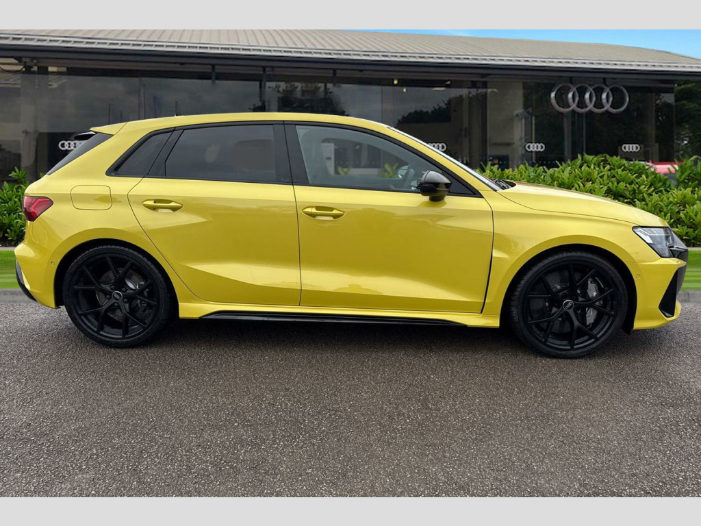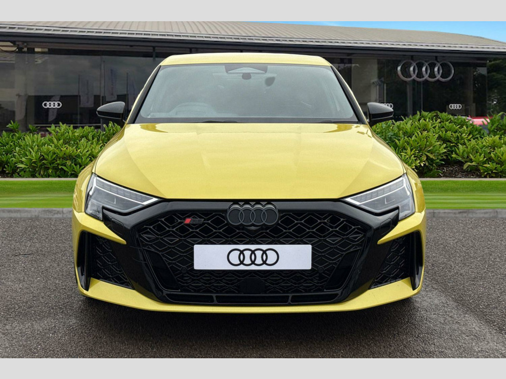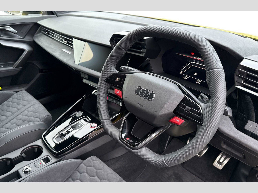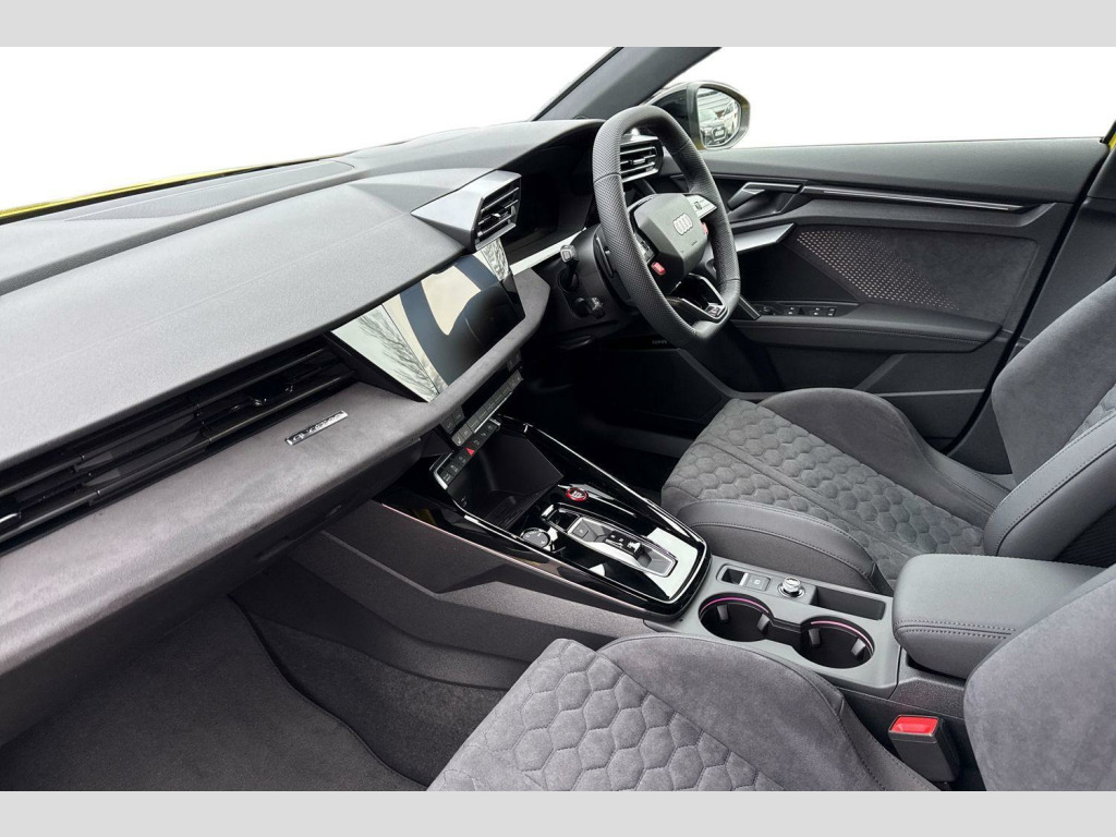 Dinamica Microfibre-Leather - RS Bucket Seats - Honeycomb Pattern - Black with Black Contrast Stitching, RS Ceramic Brakes with Brake Calipers in Anthracite Grey, 12v Socket and Storage Compartment in Front Centre Console, 19in Alloy Wheels - 5-Y-Spoke-Matt Black, 3-Zone Deluxe Automatic Air Conditioning, 4-Way Lumbar Support for Front Seats, Airbags - Driver and Front Passenger with Passenger Airbag Deactivation, Ambient Lighting Package Pro, Anti Theft Locking Wheel Bolts, Anti-Theft Alarm, Audi App Store and Smartphone Interface, Audi Beam, Audi Connect Navigation and Infotainment Services Plus (3 Year Subscription From New), Audi Drive Select, Audi Phone Box with Wireless Charging, Audi Pre-Sense Front, Audi Virtual Cockpit with RS Specific Design and 12.3in Display, Auto Dimming and Frameless Rear View Mirror, Automatic Start-Stop System with Recuperation, Black Styling Pack Plus, Camera Based Traffic Sign Recognition, Cloth Headlining in Black, Collision Avoidance Assistant, DAB Digital Radio, Distraction and Fatigue Warning, Door Mirrors - Electrically Adjustable - Heated - Folding - Automatically Dimming with Integrated LED Indicators and Kerb View Function for Passenger Side, Door Sill Trims with RS3 Logo, ESC - Electronic Stabilisation Control inc ABS - ASR and EDL, Electronically Operated Child Locks, Emergency Call - E-Call, First Aid Kit and Warning Triangle and 2 Safety Vests, Front Centre Armrest, Front Side Airbags with Head Airbags and Interaction Airbag, Front Sports Seats, Front and Rear Floor Mats, Heated Front Seats, Hill Hold Assist, I-Size and Top Tether Child Seat Mounting for the Outer Rear Seats, Inlays - Dynamica Microfibre - Black, Interior Accents in Vanadium Look, LED Headlights with LED Rear Lights and Dynamic Rear Indicators, Lane Departure Warning, Light and Rain Sensor, MMI Navigation Plus with High Resolution 10.1in Touchscreen Colour Display, Manual Boot Compartment Lid, Model Badging - Exterior, Parking Assist with Parking System Plus, Pedals in Stainless Steel and Footrest in Black, Privacy Glass, Progressive Steering, RS Exterior Styling, RS Sport Exhaust System, RS Sports Suspension, RS Steel Brakes with Black Calipers with RS Logo, Remote Central Locking with Safelock, Roof Spoiler in Body Colour, Seat Belt Monitoring, Speed Limiter - Adjustable, Split Folding Rear Seat Bench - 60-40 or Fully, Steering Wheel - Flat Top and Bottomed 3-Spoke Black Leather Multifunction with Shift Paddles in Vanadium Look - Rhombus RS Logo, Storage Package, Technology Pack, Tool Kit, Tyre Pressure Loss Indicator, Tyre Repair Kit, USB Ports with Charging Function in Rear