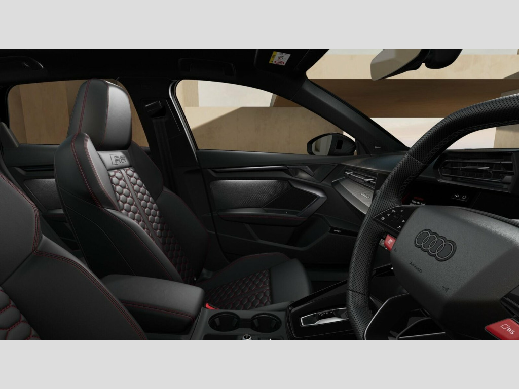 Price shown includes a deposit contribution of £4000 when purchased on finance by 31/03/26. Solutions Personal Contract Plan. 7.9% APR Representative. Audi Financial Services. Terms and Conditions apply. 19in Alloy Wheels - 10-Cross-Spoke Silk Matt Grey, Brake Calipers - Red, Fine Nappa Leather - RS Embossed Sports Seats - Honeycomb Pattern - Black with Express Red Contrast Stitching, 12v Socket and Storage Compartment in Front Centre Console, 19in Alloy Wheels - 10-Cross-Spoke Black Metallic, 3-Zone Deluxe Automatic Air Conditioning, 4-Way Lumbar Support for Front Seats, Adaptive Suspension with Audi Drive Select, Airbags - Driver and Front Passenger with Passenger Airbag Deactivation, Ambient Lighting Package Pro, Anti Theft Locking Wheel Bolts, Anti-Theft Alarm, Audi App Store and Smartphone Interface, Audi Beam, Audi Connect Navigation and Infotainment Services Plus (3 Year Subscription From New), Audi Phone Box with Wireless Charging, Audi Pre-Sense Front, Audi Virtual Cockpit with RS Specific Design and 12.3in Display, Auto Dimming and Frameless Rear View Mirror, Automatic Start-Stop System with Recuperation, Black Styling Pack Plus, Camera Based Traffic Sign Recognition, Carbon Door Mirrors, Carbon Roof Spoiler, Cloth Headlining in Black, Collision Avoidance Assistant, DAB Digital Radio, Distraction and Fatigue Warning, Door Mirrors - Electrically Adjustable - Heated - Folding - Automatically Dimming with Memory Function and Integrated LED Indicators with Kerb View Function for Passenger Side, Door Sill Trims with RS3 Logo, ESC - Electronic Stabilisation Control inc ABS - ASR and EDL, Electrically Adjustable Front Seats with Memory Function for Drivers Side, Electronically Operated Child Locks, Emergency Call - E-Call, Engine Compartment Cover with Carbon Trim, First Aid Kit and Warning Triangle and 2 Safety Vests, Front Centre Armrest, Front Side Airbags with Head Airbags and Interaction Airbag, Front Sports Seats, Front and Rear Floor Mats, Heated Front Seats, Hill Hold Assist, I-Size and Top Tether Child Seat Mounting for the Outer Rear Seats, Inlays - Carbon Atlas Structure, Interior Accents in Vanadium Look, Lane Departure Warning, Light and Rain Sensor, MMI Navigation Plus with High Resolution 10.1in Touchscreen Colour Display, Manual Boot Compartment Lid, Model Badging - Exterior, Panoramic Sunroof, Parking Assist with Parking System Plus, Pedals in Stainless Steel and Footrest in Black, Privacy Glass, Progressive Steering, RS Exterior Features in Carbon - Gloss Black, RS Sport Exhaust System, RS Steel Brakes with Black Calipers with RS Logo, Remote Central Locking with Safelock, Seat Belt Monitoring, Speed Limiter - Adjustable, Split Folding Rear Seat Bench - 60-40 or Fully, Steering Wheel - Flat Top and Bottomed 3-Spoke Black Leather Multifunction with Shift Paddles in Vanadium Look - Rhombus RS Logo, Storage Package, Technology Pack, Technology Pack Pro, Tool Kit, Top Speed Restriction Increase to 174mph, Tyre Pressure Loss Indicator, Tyre Repair Kit, USB Ports with Charging Function in Rear