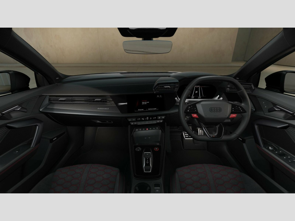 Price shown includes a deposit contribution of £4000 when purchased on finance by 31/03/26. Solutions Personal Contract Plan. 7.9% APR Representative. Audi Financial Services. Terms and Conditions apply. Brake Calipers - Red, Dinamica Microfibre-Leather - RS Bucket Seats - Honeycomb Pattern - Black with Express Red Contrast Stitching, 12v Socket and Storage Compartment in Front Centre Console, 19in Alloy Wheels - 10-Cross-Spoke Silk Matt Grey, 3-Zone Deluxe Automatic Air Conditioning, 4-Way Lumbar Support for Front Seats, Airbags - Driver and Front Passenger with Passenger Airbag Deactivation, Ambient Lighting Package Pro, Anti Theft Locking Wheel Bolts, Anti-Theft Alarm, Audi App Store and Smartphone Interface, Audi Beam, Audi Connect Navigation and Infotainment Services Plus (3 Year Subscription From New), Audi Drive Select, Audi Matrix LED Headlights with LED Rear Lights - Dynamic Front and Rear Indicators - Headlight Cleaning System, Audi Phone Box with Wireless Charging, Audi Pre-Sense Front, Audi Virtual Cockpit with RS Specific Design and 12.3in Display, Auto Dimming and Frameless Rear View Mirror, Automatic Start-Stop System with Recuperation, Black Styling Pack Plus, Camera Based Traffic Sign Recognition, Carbon Door Mirrors, Carbon Roof Spoiler, Cloth Headlining in Black, Collision Avoidance Assistant, DAB Digital Radio, Distraction and Fatigue Warning, Door Mirrors - Electrically Adjustable - Heated - Folding - Automatically Dimming with Integrated LED Indicators and Kerb View Function for Passenger Side, Door Sill Trims with RS3 Logo, ESC - Electronic Stabilisation Control inc ABS - ASR and EDL, Electronically Operated Child Locks, Emergency Call - E-Call, Engine Compartment Cover with Carbon Trim, First Aid Kit and Warning Triangle and 2 Safety Vests, Front Centre Armrest, Front Side Airbags with Head Airbags and Interaction Airbag, Front Sports Seats, Front and Rear Floor Mats, Heated Front Seats, Hill Hold Assist, I-Size and Top Tether Child Seat Mounting for the Outer Rear Seats, Inlays - Carbon Atlas Structure, Interior Accents in Vanadium Look, Lane Departure Warning, Light and Rain Sensor, MMI Navigation Plus with High Resolution 10.1in Touchscreen Colour Display, Manual Boot Compartment Lid, Model Badging - Exterior, Parking Assist with Parking System Plus, Pedals in Stainless Steel and Footrest in Black, Privacy Glass, Progressive Steering, RS Exterior Features in Carbon - Gloss Black, RS Sport Exhaust System, RS Sports Suspension, RS Steel Brakes with Black Calipers with RS Logo, Remote Central Locking with Safelock, Seat Belt Monitoring, Speed Limiter - Adjustable, Split Folding Rear Seat Bench - 60-40 or Fully, Steering Wheel - Flat Top and Bottomed 3-Spoke Black Leather Multifunction with Shift Paddles in Vanadium Look - Rhombus RS Logo, Storage Package, Technology Pack, Tool Kit, Tyre Pressure Loss Indicator, Tyre Repair Kit, USB Ports with Charging Function in Rear