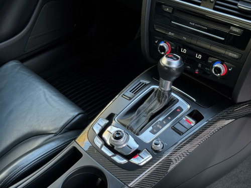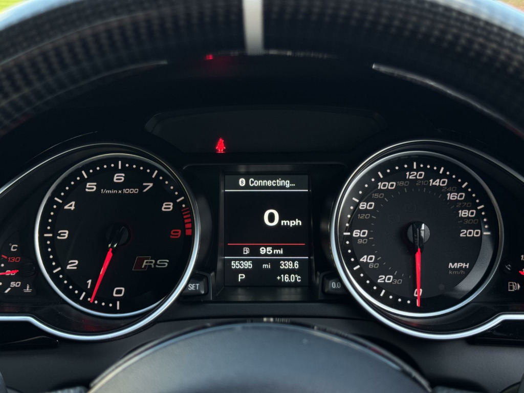 Optional equipment includes the Driver Assistance Package, Advanced Key, Audi Parking System Advanced with camera, Carbon Design Package for engine bay, Black Styling Package, Sports Package with RS sports differential, and rare Audi Exclusive flat-bottom steering wheel. Factory 20-inch 5-Arm Rotor alloys finished in matt black with red rim detailing, presented exactly as Audi intended and in excellent condition. The cabin features RS embossed bucket seats in Fine Nappa leather with Rock Grey stitching, complemented by carbon fibre inlays and three-zone climate control.