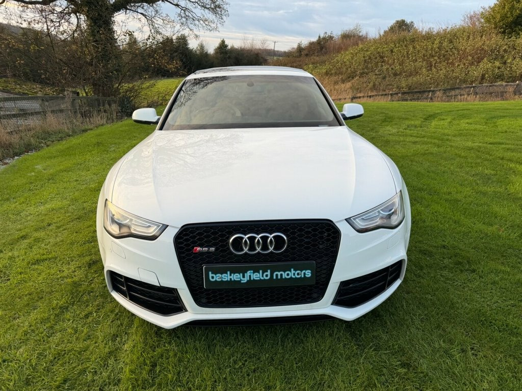 AUDI RS5 V8 COUPE FINISHED IN IBIS WHITE, Complete with quilted leather RS embossed bucket seats with contrast stitching (£1735), 20" 5 arm rotor design alloy wheels in gloss black and silver, Navigation system with DVD, Bluetooth phone connectivity, Climate control, BC racing coil overs (£1000), HMS sports exhaust (£3300), Electric tilt panoramic glass sunroof (£870), Privacy glass (£330), Front and rear parking sensors, Multi function flat bottom steering wheel, Heated seats for driver and passenger (£500), Electronic lumbar and bolster support, Ceramic brakes - front (£5250), Bang and Olufsen sound system, Sports package (£2250), Dynamic Steering (£725), Audi exclusive controls pack (£615), Sound package (£600), Audi exclusive floor mats (£440), Black styling package (£365), Leather armrests (£255), Door mirrors electrically folding (£180), 20in Alloy Wheels - 5-Arm Rotor Design, Audi exclusive controls pack, Black styling package, Ceramic Brakes - Front, Door Mirrors - Electrically Folding, Dynamic Steering, Electric Panoramic Sunroof - Tilt, Floor Mats - Audi Exclusive with Leather, Heated Front Seats, Ibis White, Leather armrest, Privacy Glass, RS embossed buckets seats, Sound package, Sports Package