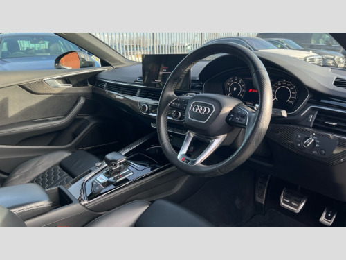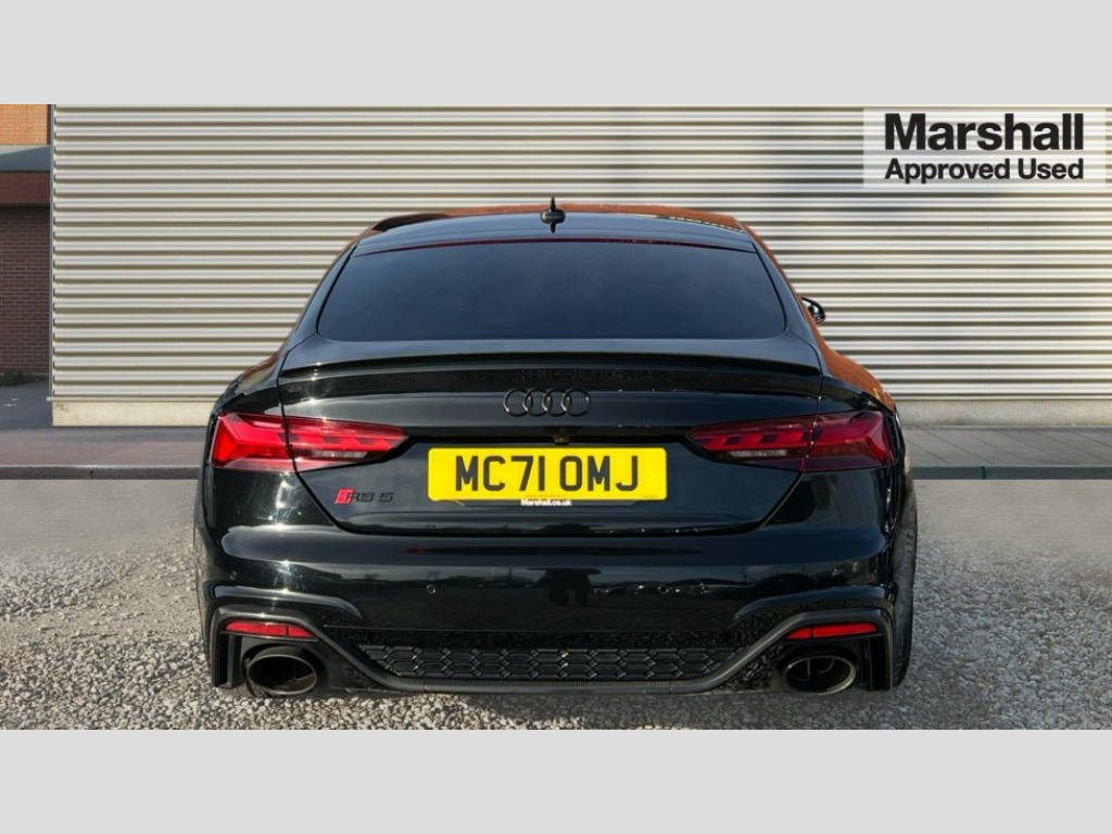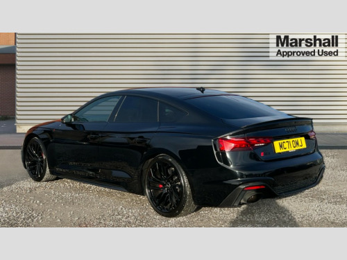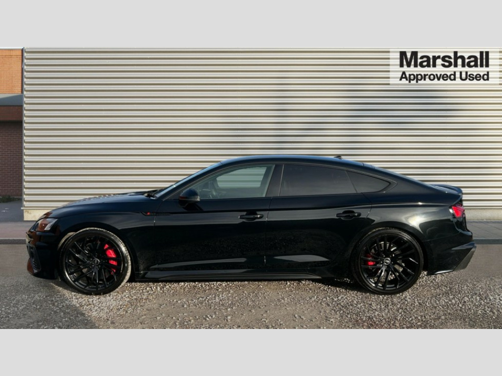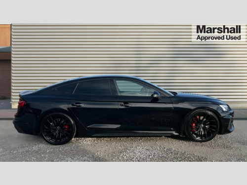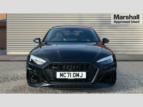 Audi RS5 RS 5 TFSI Quattro Carbon Black 5dr Tiptronic Audi connect safety and service (e-call), Audi connect with Amazon Alexa Integration, Audi parking system plus with front and rear sensors, Audi side assist, Audi smartphone interface, Audi Virtual Cockpit with RS specific design and 12.3" display, Automatic start-stop system with coasting functionality and efficiency programme, Bluetooth interface, Electromechanical power steering, Email, calendar and text messages displayed via MMI, MMI Navigation plus with MMI touch includes 10.1" high resolution colour MMI display, 3D map, Rear view camera, RS Audi drive select, RS drive modes on steering wheel, Service interval indicator, Voice control system, Quattro sports differential, 2 x USB charging port with aux input socket, Audi sound system, DAB digital radio reception, Audi Beam uses LEDs to project the RS logo, Audi matrix LED headlights with LED rear lights + dynamic front and rear indicators, Audi rings and lettering glossy black, Auto dimming rear view mirror, Body colour door handles, Electric front windows, Electric rear windows, Electrically folding, adjustable and heated door mirrors with integrated LED side indicators and kerb view function for passenger side, Exterior mirror housing in high gloss black, High beam assistant, Larger singleframe grill, LED daytime running lights, Privacy glass with rear acoustic glazing, Rain and light sensors, RS bumper with quattro lettering, RS5 badges on grille, the front wing panels and rear, RS5 dual branch chrome tailpipes with left and right oval pipes, Windscreen with acoustic glazing, 3 spoke leather heated multi-function plus steering wheel with RS badging, 40/20/40 split folding 3 seater rear bench seat, Aluminium shift paddles, Black cloth headlining, Deluxe 3 zone electronic climate control, Electrically adjustable front seats, Fine Nappa leather upholstery, Front centre armrest, Front head restraints, Front/rear floor mats, Heated front seats, Illuminated door sill trims with RS5 logo, ISOFIX child seat mounting and top tether, Leather door armrests and knee pad, Pneumatic massage function, Rear head restraints, RS Specific perforated leather gear lever knob with contrast stitching, RS Super Sports seats with contrast honeycomb stitching, Stainless steel pedals, Carbon black styling pack - RS5, LED Interior light pack - RS5, 3x3 point rear seatbelts, 6 airbags - Driver, front passenger, curtain and side airbags, Child locks on rear doors, Electromechanical parking brake, Electronic Stabilisation Control (ESC) including ABS, ASR and EDL, Front passenger airbag deactivation, Height adjustable front seatbelts, Hill hold assist, Multi collision brake assist, Pop-up bonnet for pedestrian protection, Pre sense city, RS Model enhanced braking system, Seatbelt monitoring, Tyre pressure warning, Warning triangle and first aid kit, Anti theft alarm system, Anti theft wheel bolts, Immobiliser, Keyless Go, Remote control key with RS emblem, Carbon twill inlays, 20" 5 Segment spoke Evo style design audi sport alloy wheels in glossy black, Tool kit, Tyre repair kit
