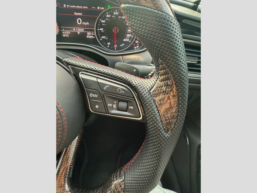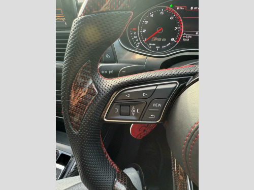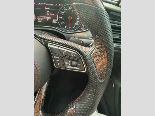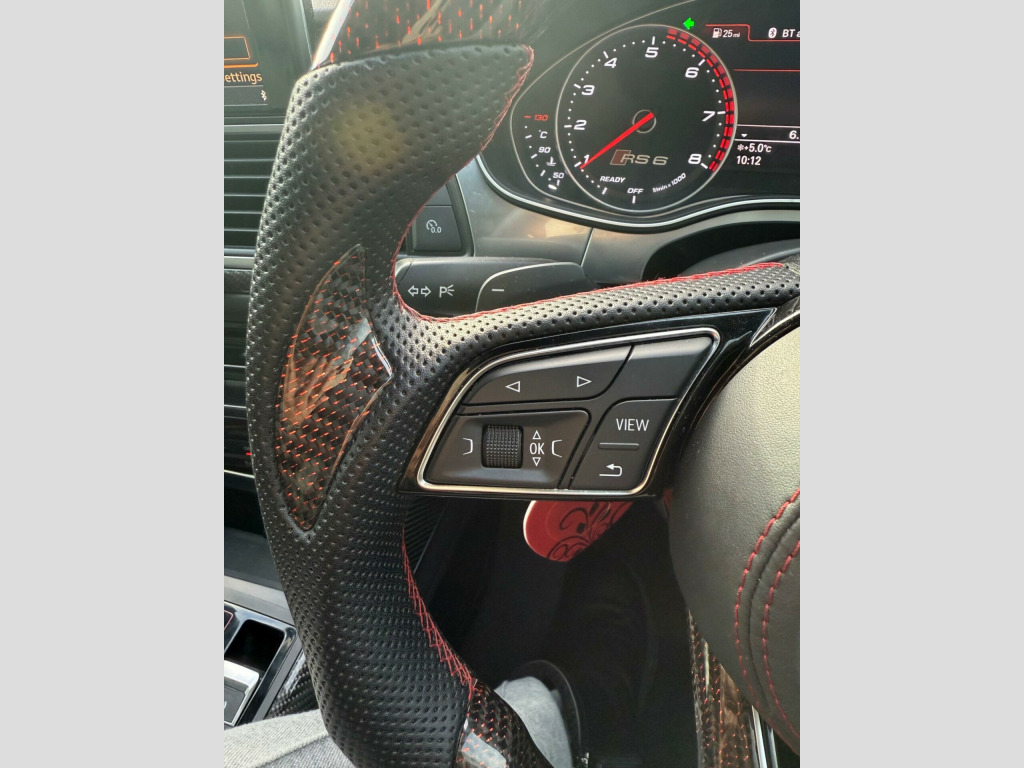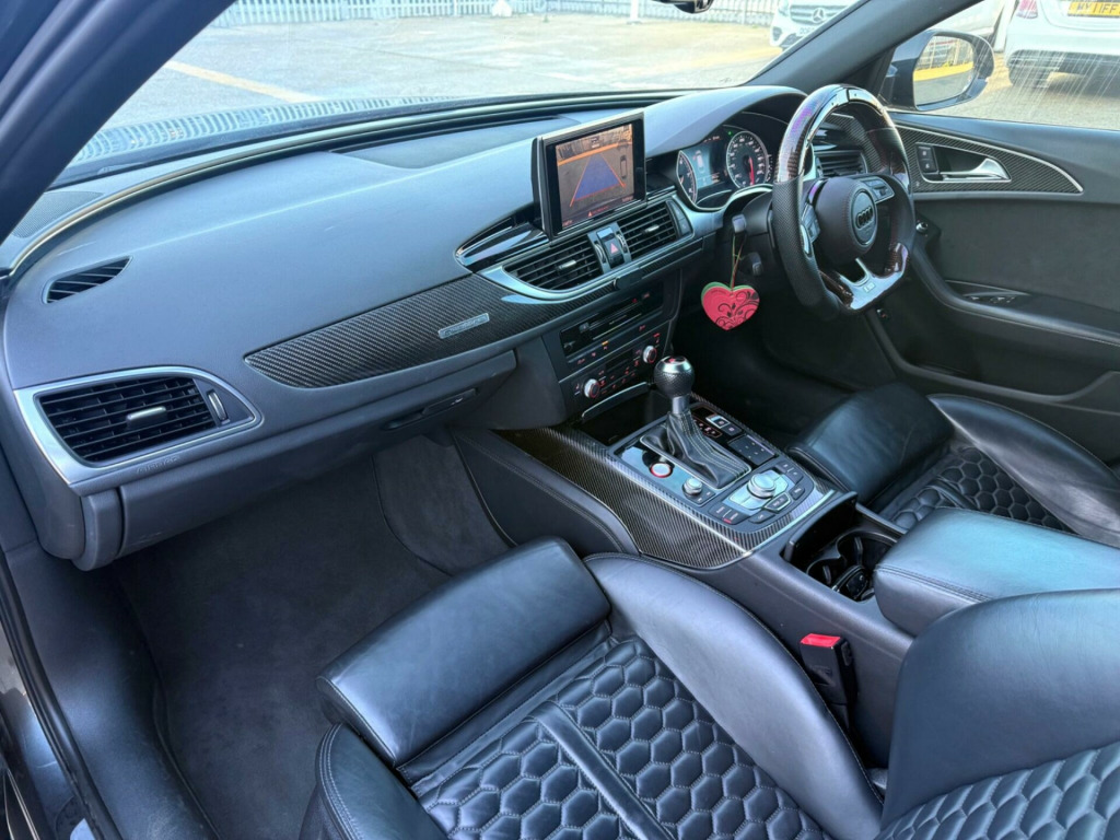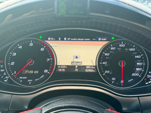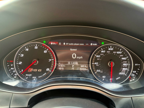 This 2016 Audi RS6 Avant TFSI V8 boasts exceptionally low mileage for its age, having covered just 60,000 miles. This performance estate is equipped with a powerful 4.0L petrol engine and a four wheel drive drivetrain, ensuring excellent traction and handling. It meets Euro 6 emission standards. Notable features include a panoramic glass sunroof, driver's seat memory function, rear parking sensors for added convenience, and striking Audi Matrix LED headlights. For an enhanced audio experience, it comes fitted with a BOSE surround sound system.The RS6 Avant offers impressive performance, accelerating from 0 to 60mph in a remarkable 3.8 seconds, a figure that sets it apart from many other vehicles in its class. Its spacious boot provides ample room for luggage or shopping, making it a practical choice for families and those with active lifestyles. The combination of its potent engine, advanced technology, and generous interior space makes this Audi RS6 Avant a compelling proposition. noramic glass sunroof, privacy glass, valcona leather - comfort seats - black, 12v power socket, 12v power socket - rear x2, 2 x sdxc card readers, 20in alloy wheels - 7-twin-spoke design, abs - anti-lock braking system, ami - audi music interface, asr - anti slip regulation, aux-in socket, active door reflectors - internal, airbags - curtain, airbags - driver, airbags - front passenger, airbags - front side, alarm - thatcham category 1, aluminium-look pedals and footrest, ambient lighting - centre console, ambient lighting package - interior and exterior, amplifier - 12-channel, anti theft locking wheel bolts, anti-glare illumination for passenger compartment, armrest doors - leather, audi drive select, audi hill hold assist, audi matrix led headlights, audi parking system plus, audio output - 600 watts, audiopilot for noise compensating volume adjustment, auto-dimming rear-view mirror, automatic wipers with rain sensor, bose surround sound system, brake calipers - high-gloss black with rs logo, cables x2 - mp3 connection including ipod, car jack, carpet - black, climate control - electronic deluxe 4-zone, cloth headlining in black, cornering light function, cruise control, cup holders in rear armrest x2, cupholders, dab digital radio, dis - drivers information system with display screen colour - 7in, dashboard - black, display screen colour 8in, door mirrors - auto dimming, door mirrors - automatic kerb view dipping function when reversing, door mirrors - heated-electrically adjustable-folding, door mirrors - matt aluminium look housings, door mirrors - memory function, door sill trims - aluminium with rs6 logo, door trim inserts - alcantara, dynamic led indicators - front, dynamic led indicators - rear, dynamic route guidance - tmc, edl - electronic differential lock, esc - electronic stabilisation control, electric windows - front and rear, electrically adjustable 4-way lumbar support, electromechanical parking brake, electromechanical power steering, emergency braking function, entrance lighting, exhaust tailpipe - dual-branch oval twin, first aid kit, flared front and rear wheel arches, front bumper with enlarged air inlets, front centre armrest, front fog lights, front passenger airbag deactivation switch, front and rear floor mats, front and rear reading lights, gear lever knob in black perforated leather, glovebox - illuminated, hard drive - 10gb, headlights - coming-leaving home function, headlights - high-beam assist, headlights - light sensor, headlights washers, heated front seats, high performance braking system - rs models, isofix child seat mounting for front passenger, isofix child seat preparation for rear seats with top tether, inlays - carbon, keyless go, led daytime running lights, led rear lights - darkened, lighting - door handles led for easy entry in the dark, lighting - door pockets/footwells/inside door handles, lighting - under the door handles, luggage compartment - net, luggage compartment system, mmi navigation plus, mmi radio plus, mmi touch, mpeg4-compatible dvd player, mobile telephone preparation - bluetooth interface, non-smoking package, outside temperature display, pollen filter, power operated tailgate, quattro sports differential, rs adaptive air suspension, rs body styling, rs instrument dials, radiator grille - honeycomb design, radiator grille frame - matt aluminium look, rear diffuser, rear parking sensors, remote boot release, remote central locking, rest recommendation system, roof rails in matt aluminium, seat belt monitoring, seats - 12-way front electric adjustment, seats - drivers memory function, seats - front electric adjustment, seats - front electric height adjustment, seats - rs super sports, sill extensions, speakers x14, split-folding rear seats, spoiler - front lip - matt aluminium finish, spoiler - roof - rs models - body coloured, steering column - automatic easy entry and exit function, steering column - electrically adjustable with memory, steering wheel - aluminium look paddle shift, steering wheel - multi-function, steering wheel - rs 3-spoke leather contrast stitching-flat bottomed-rs badge, storage package, subwoofer, tool kit, towbar preparation, tracking system preparation, tyre mobility system, tyre pressure monitoring system, usb connection x2, vanity mirrors, warning triangle, window surrounds - aluminium, ipod connection