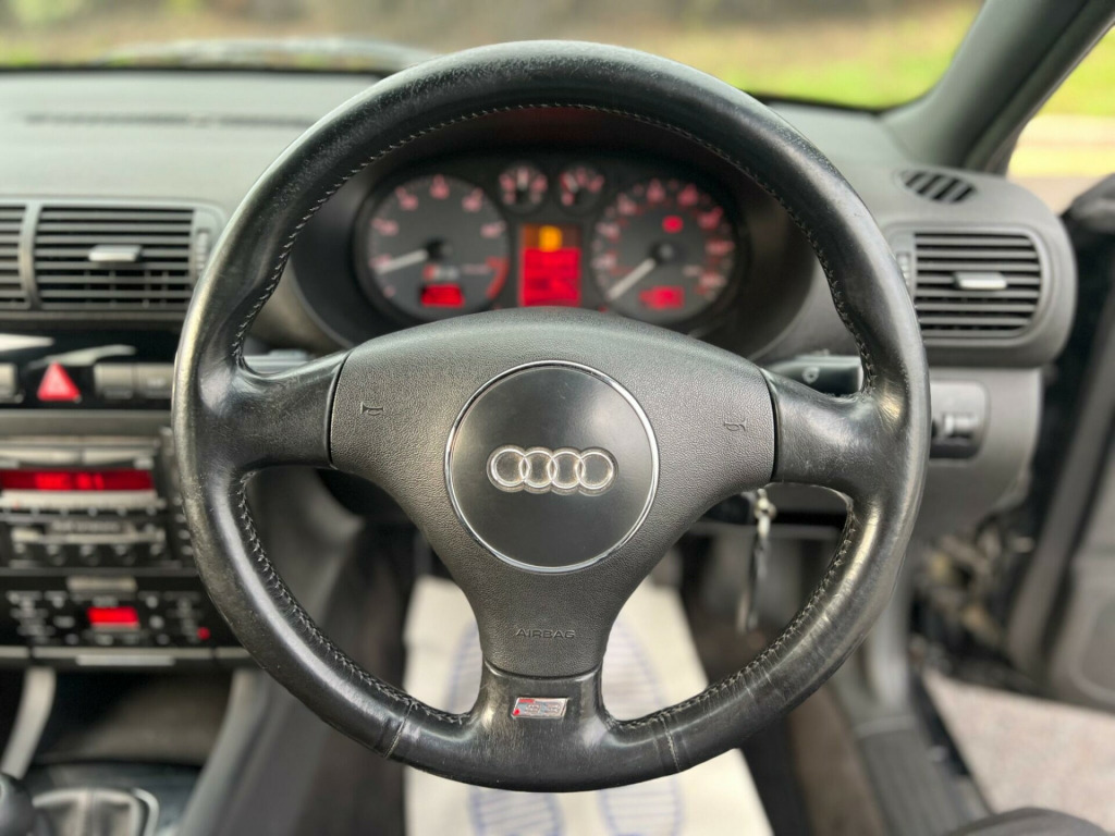 2001 Audi S3 Quattro 1.8 finished in black. 178,000 warranted miles on the clock. MOT til 3rd June 2026. Full service history available; 16 services, 1 Main dealer. Cambelt + waterpump replaced on 13/04/2018 at 148,617 miles. Car drives well with no mechanical faults. Full V5 available. Comes with a top spec including; alloy wheels, leather steering wheel, Radio/CD, electric windows, central locking, AC/Climate control, Recaro bucket seats, electric seats, TPMS, cup holders and many more. Nationwide delivery. P/X welcome. HPI clear. 2 keys. Any questions do not hesitate to contact us on 07443456706 justable steering column/wheel, air bag driver, air bag passenger, air bag side, alarm, alloy wheels (17in), anti-lock brakes, body coloured bumpers, central door locking, centre rear seat belt, climate control, computer, electric windows (front), front fog lights, head restraints, immobiliser, in car entertainment (radio/cassette), mirrors external, power-assisted steering, seat height adjustment, seat lumbar support, side protection mouldings, spare wheel (space saver), traction control system