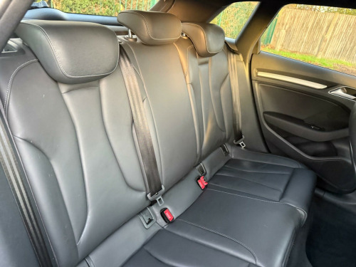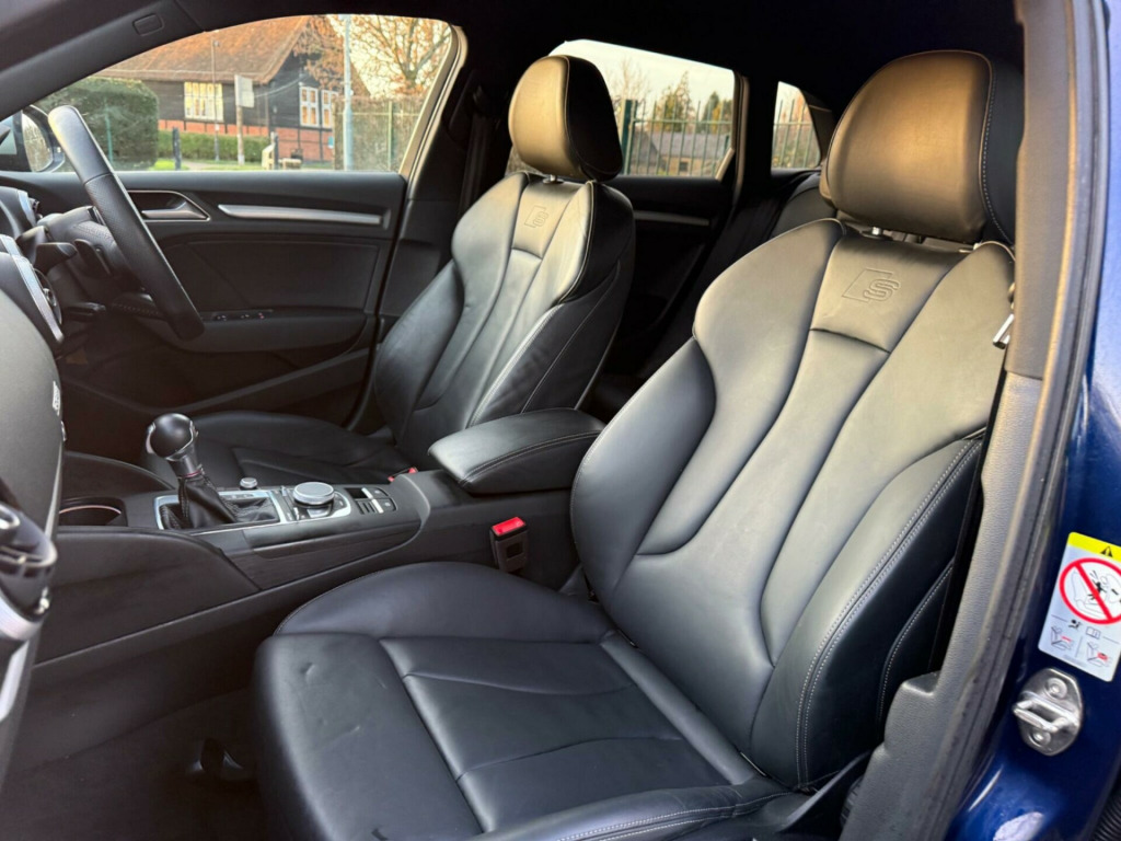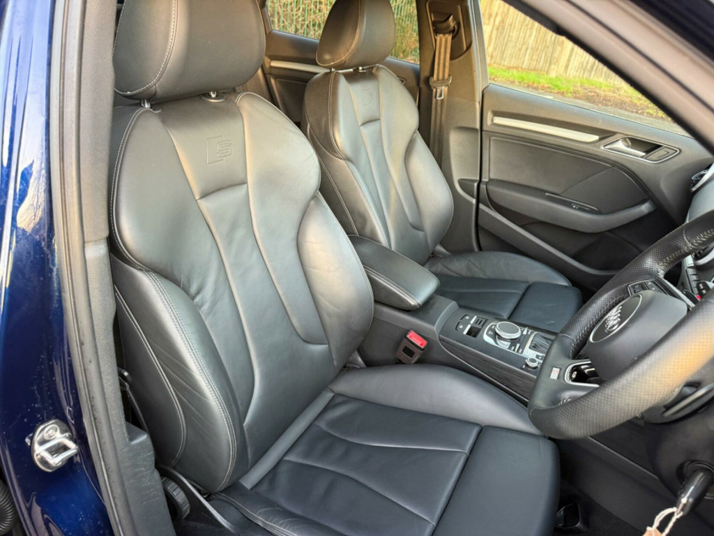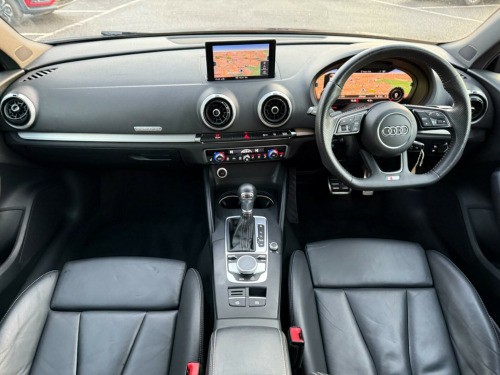 . 18in Alloy Wheels - 5 Twin Spoke Star Design in Contrast Grey with Diamond Cut Finish, 2 x USB Charging Ports and 1 x AUX-IN, 6-Airbag System with Knee Airbag for Driver, Aluminium Interior Elements, Aluminium Window Trims, Aluminium-Effect Door Mirror Housings, Anti Theft Locking Wheel Bolts, Anti-Theft Alarm, Audi Beam, Audi Connect, Audi Connect Infotainment Services - 3 Month Trial, Audi Drive Select, Audi Smartphone Interface, Audi Sound System, Auto-Dimming Rear-View Mirror with Light and Rain Sensor, Bluetooth Interface, Brake Calipers Painted in Black with S3 Logo at the Front, CD Drive, Cloth Headlining, Colour Drivers Information System - DIS, Cruise Control, DAB Digital Radio, Door Mirrors - Electrically Adjustable and Heated with Integrated LED Side Indicators, Dual-Zone Electronic Climate Control, ESC - Electronic Stabilisation Control inc ABS - ASR and EDL, Electric Windows - Front and Rear, Electromechanical Parking Brake, Exhaust Tailpipe - Dual-Branch Oval Twin with Chrome Finish, First Aid Kit and Warning Triangle, Front Centre Armrest, Front and Rear Floor Mats, Headlights Washers, Heated Front Seats, Heated Windscreen Washer Jets, Hill Hold Assist, ISOFIX Child Seat Mounting and Top Tether, Illuminated Door Sill Trims with S Logo, Inlays - Matt Brushed Aluminium, Instrument Dials with S3 Logo, LED Headlights with LED Rear Lights and Dynamic Rear Indicators, LED Interior Light Package, Lashing Points in Luggage Compartment, MMI Navigation - SD Card Based, MMI Radio Plus with 7in Electrically Retractable Colour MMI Screen, Manual Seat Adjustment, Non-Smoking Package, Pedals in Stainless Steel, Platinum Grey S Grille with Chrome Plated Dual Struts and S3 Logo, Progressive Steering, Rear Parking Sensors, Remote Central Locking with 2 Fold Away Keys, S Design Body Styling, S Sport Suspension, Seat Belt Monitoring, Split Folding Rear Seat Bench - 60-40 or Fully, Steering Wheel - 3-Spoke Leather-Multifunction-Flat Bottomed-Shift Paddles, Storage Compartments in the Door Side Trims-Centre Console-Under Drivers Seat, Storage Package, Tool Kit, Tyre Pressure Warning Light, Tyre Repair Kit, Technology Package, Fine Nappa Leather - S Embossed Super Sports Seats - Black with Rock Grey Stitching.