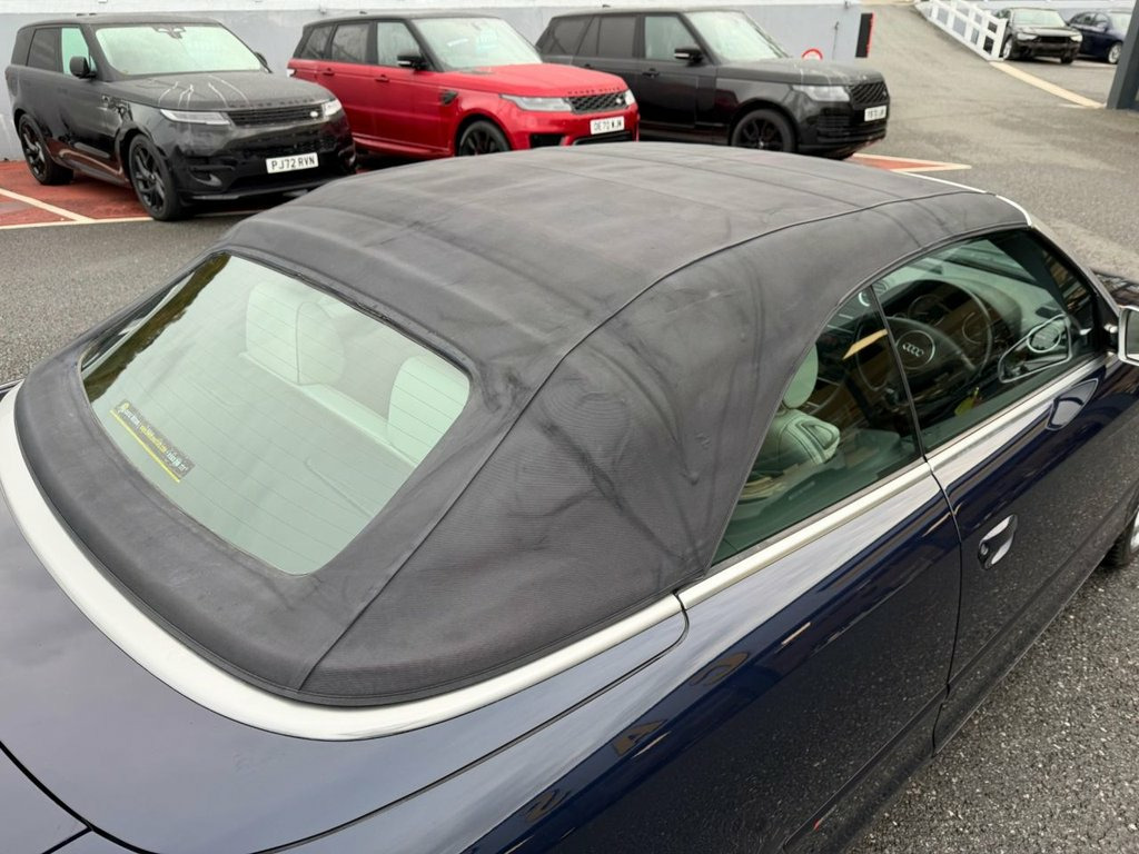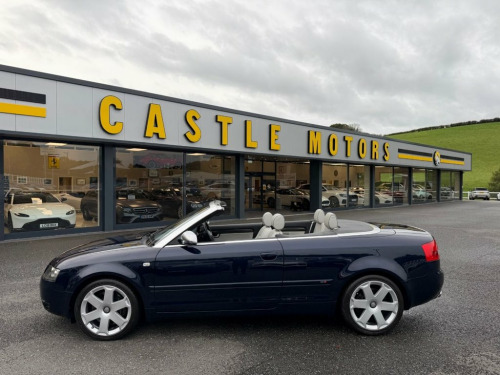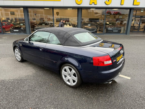 S4 Cabriolet 4.2 V8 Manual. Midnight Blue Metallic with Light Grey Nappa leather, 18 inch flat spoke wheels with S Calipers, Carbon Fibre interior trim, Audi Concert HiFi, ESP, dual climate control, electric adjustable seats, removable wind deflector, car cover, armrest and much more. Very rare Manual V8 convertible that is difficult to obtain in this condition having covered under 82,000 miles with service file and freshly serviced before sale by ourselves. Must be seen to be appreciated  Adjustable Steering Column/Wheel, Air Bag Driver, Air Bag Passenger, Air Bag Side, Air-Conditioning (Automatic), Alarm, Alloy Wheels (18in), Anti-Lock Brakes, Body Coloured Bumpers, Central Door Locking, Climate Control, Computer (Driver Information System), Electric Windows (Front/Rear), Electronic Stability Programme, Head Air Bags, Head Restraints, Immobiliser, In Car Entertainment (Radio/CD), Mirrors External, Power Socket, Power-Assisted Steering, Seat Lumbar Support (Driver/Passenger El, Seats Electric (Driver/Passenger), Side Protection Mouldings, Spare Wheel (Full Size), Speakers, Steering Wheel Mounted Controls, Upholstery Cloth/Leather, Upholstery Leather