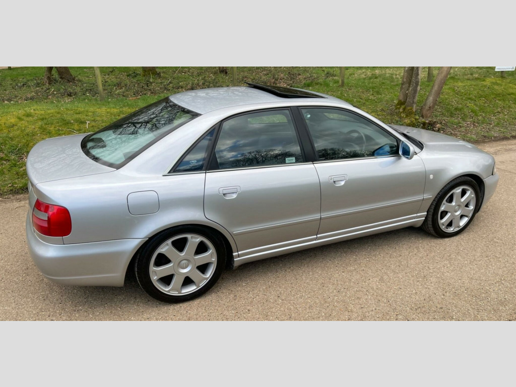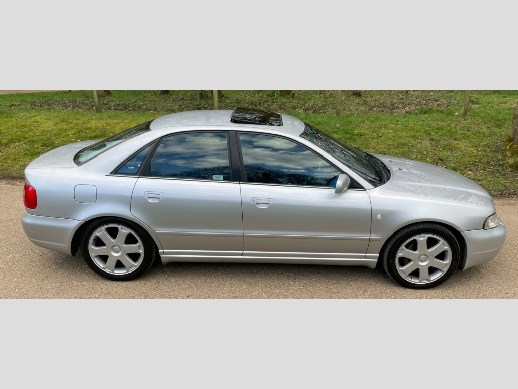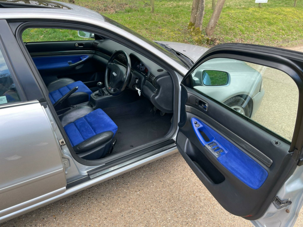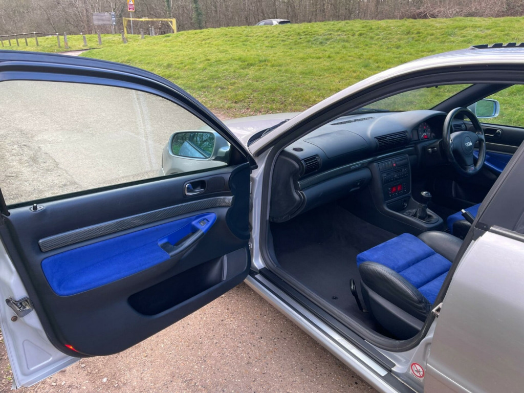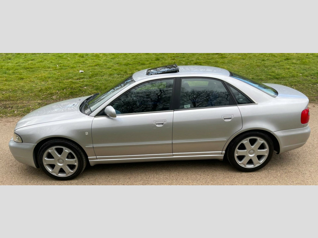 AUDI S4 B5 2.7 BI-TURBO V6, 1998 ''S REG'' SALOON, 6 SPEED MANUAL, 4WD, FINISHED IN METALLIC SILVER, BOSTS A HUGE SERVICE HISTORY INCLUDING SERVICE BOOKS, SERVICE BILLS OLD MOT'S, ORIGINAL PURCHASE INVOICE FROM NEW, 2 KEYS AND A CURRENT MOT UNTIL NOV 2026, THIS PARTICULAR VEHICLE HAS A FACTORY MTM TUNE TO 305BHP AND LOWERING SPRINGS, ALSO HAS THE UPGRADED HALF SUEDE NOGARO BLUE INTERIOR AND ELECTRIC TILT/SLIDE SUNROOF, WITH THE CARBON INTERIOR TRIM, IN BEAUTIFUL CONDITION BOTH INSIDE AND OUT FOR ITS AGE, COMPLETELY STANDARD AND UNTOUCHED EXAMPLE EVEN DOWN TO THE ORIGINAL STEREO, A UNIQUE EXAMPLE TO FIND A TRUE FUTURE CLASSIC WHICH HAS BECOME EXTREMELY RARE AND WILL BE A GREAT INVESTMENT, ONLY SERIOUS INQUIRIES FIRST TO SEE WILL BUY, PLEASE CALL TO ARRANGE A VIEWING OR FOR MORE INFORMATION. ectric slide/tilt glass sunroof with pre-select, cassette box holder, adjustable steering column/wheel, air bag driver, air bag passenger, air bag side, alloy wheels (17in), anti-lock brakes, body coloured bumpers, electric windows (front/rear), front fog lights, head restraints, immobiliser, in car entertainment (radio/cassette), mirrors external, power-assisted steering, seat lumbar support, side protection mouldings, speakers, traction control system