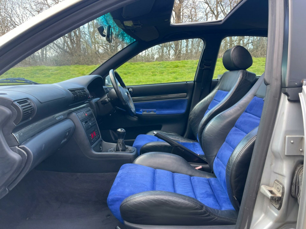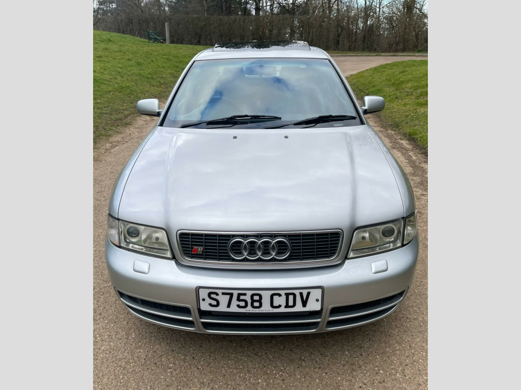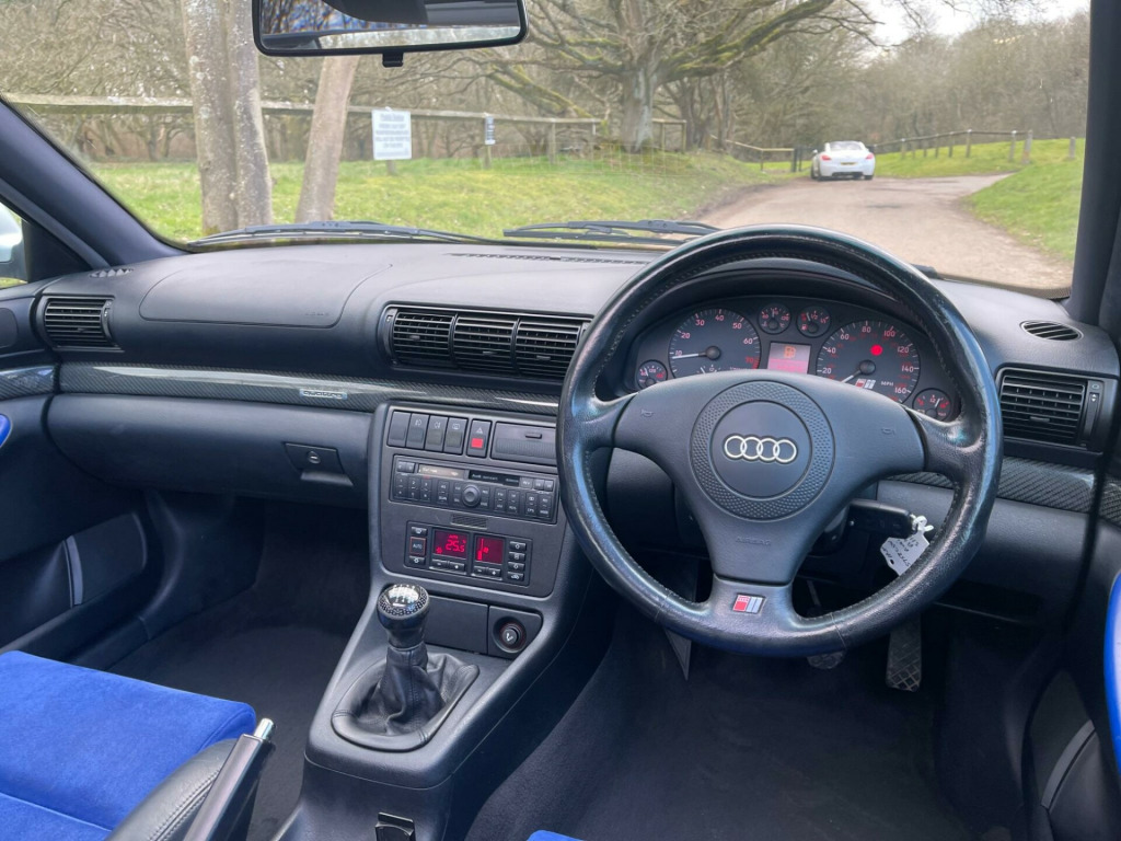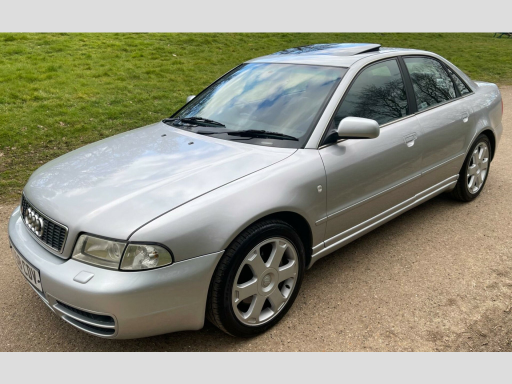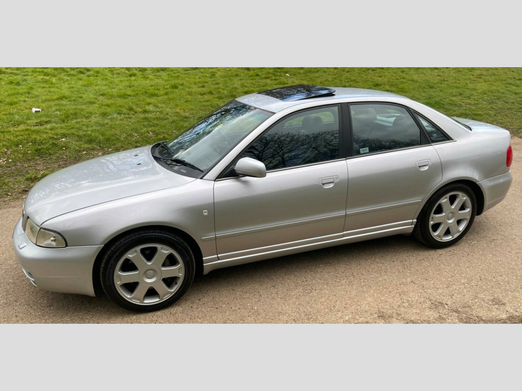AUDI S4 B5 2.7 BI-TURBO V6, 1998 ''S REG'' SALOON, 6 SPEED MANUAL, 4WD, FINISHED IN METALLIC SILVER, BOSTS A HUGE SERVICE HISTORY INCLUDING SERVICE BOOKS, SERVICE BILLS OLD MOT'S, ORIGINAL PURCHASE INVOICE FROM NEW, 2 KEYS AND A CURRENT MOT UNTIL NOV 2026, THIS PARTICULAR VEHICLE HAS A FACTORY MTM TUNE TO 305BHP AND LOWERING SPRINGS, ALSO HAS THE UPGRADED HALF SUEDE NOGARO BLUE INTERIOR AND ELECTRIC TILT/SLIDE SUNROOF, WITH THE CARBON INTERIOR TRIM, IN BEAUTIFUL CONDITION BOTH INSIDE AND OUT FOR ITS AGE, COMPLETELY STANDARD AND UNTOUCHED EXAMPLE EVEN DOWN TO THE ORIGINAL STEREO, A UNIQUE EXAMPLE TO FIND A TRUE FUTURE CLASSIC WHICH HAS BECOME EXTREMELY RARE AND WILL BE A GREAT INVESTMENT, ONLY SERIOUS INQUIRIES FIRST TO SEE WILL BUY, PLEASE CALL TO ARRANGE A VIEWING OR FOR MORE INFORMATION. ectric slide/tilt glass sunroof with pre-select, cassette box holder, adjustable steering column/wheel, air bag driver, air bag passenger, air bag side, alloy wheels (17in), anti-lock brakes, body coloured bumpers, electric windows (front/rear), front fog lights, head restraints, immobiliser, in car entertainment (radio/cassette), mirrors external, power-assisted steering, seat lumbar support, side protection mouldings, speakers, traction control system