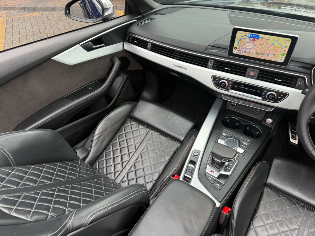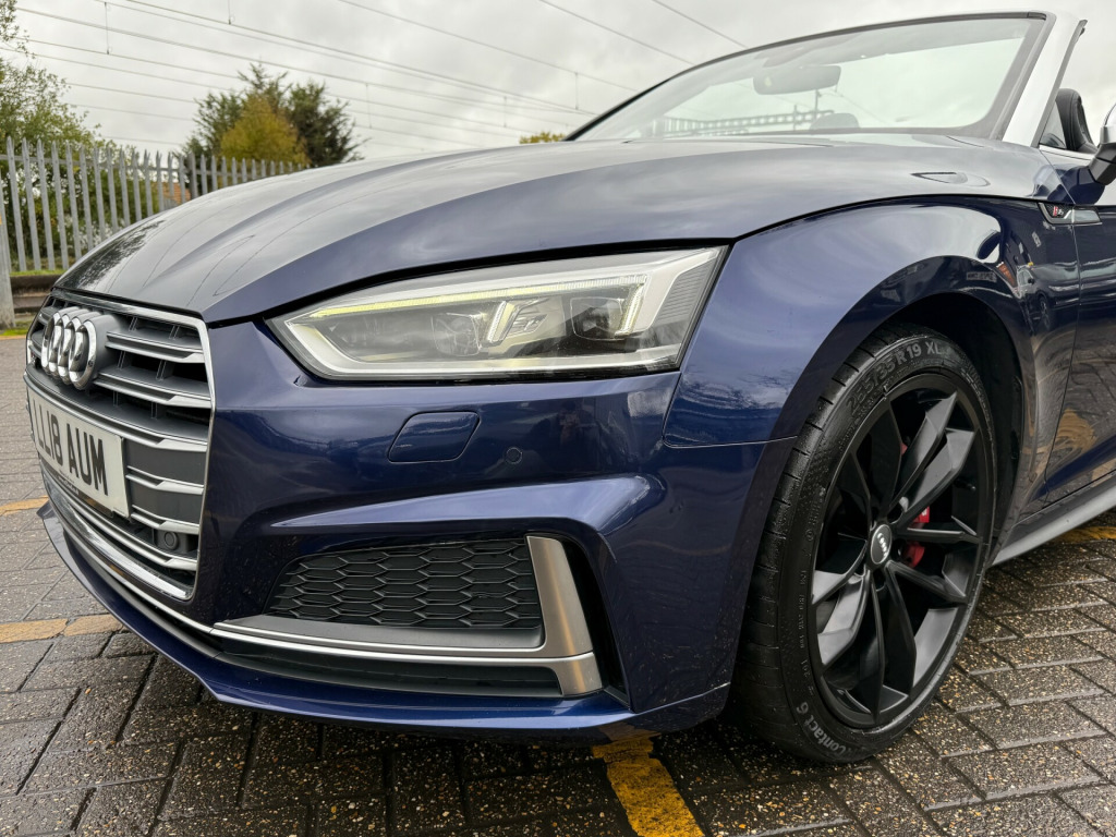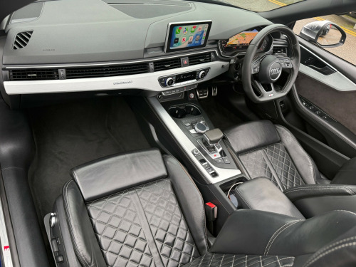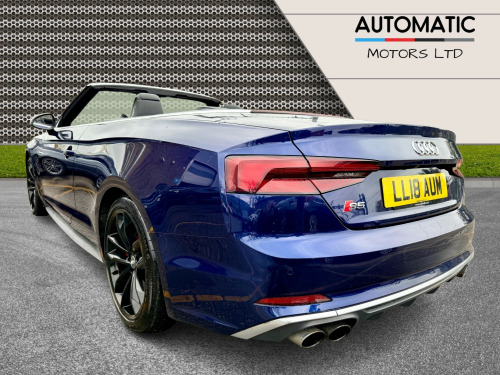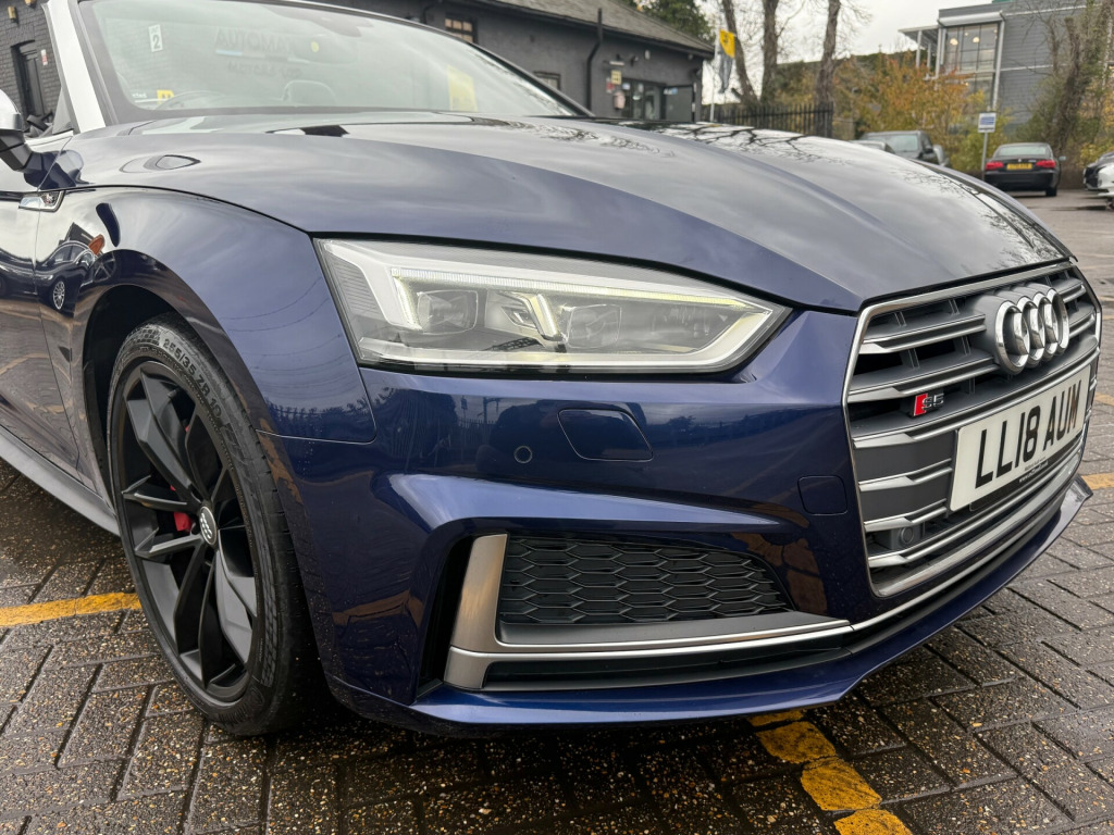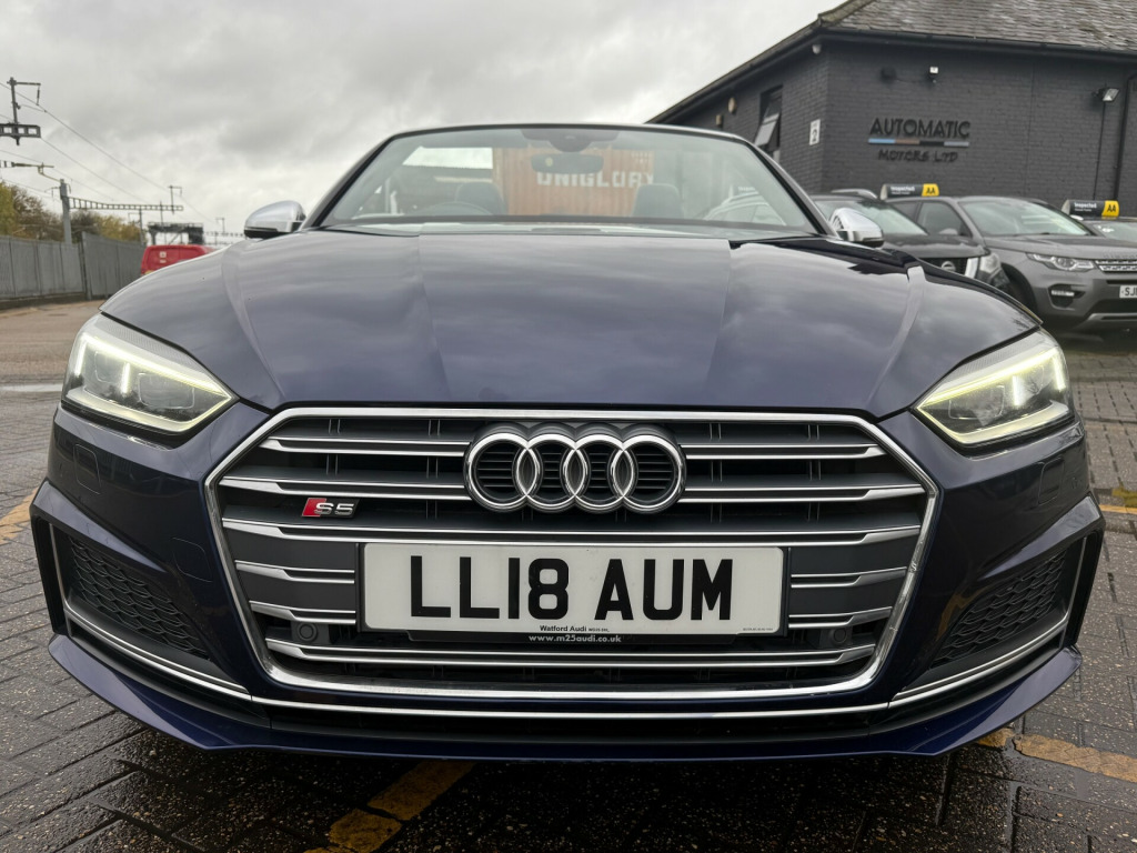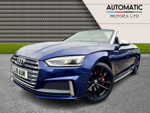 1 OWNER FROM NEW, APPLE/ANDROID CAR PLAY, ULEZ FREE, FRESH SERVICE (TOTAL 6 SERVICES), MOT 12/06/2026, NAVIGATION, BLUETOOTH, PARKING SENSORS, HEATED SEATS, SEAT MASSAGER, HEATED SEATS, REVER CAMERAThis sleek 2018 Audi S5 Cabriolet boasts a powerful 3.0 TFSI V6 engine, delivering 354 horsepower and Euro 6 (s/s) emissions compliance. With just 59700 miles on the clock, this convertible beauty is ready to hit the open road with its petrol fuel type and ULEZ compliant status. Featuring a MOT expiry date of 06/12/2026, this 2-door, 4-seater vehicle is a perfect blend of style, performance, and practicality. Whether cruising through the city or along scenic routes, the Audi S5 offers an exhilarating driving experience wrapped in luxury and sophistication. Ideal for those seeking a thrilling ride with top-down driving capabilities while enjoying the reassurance of Audi's legendary engineering.