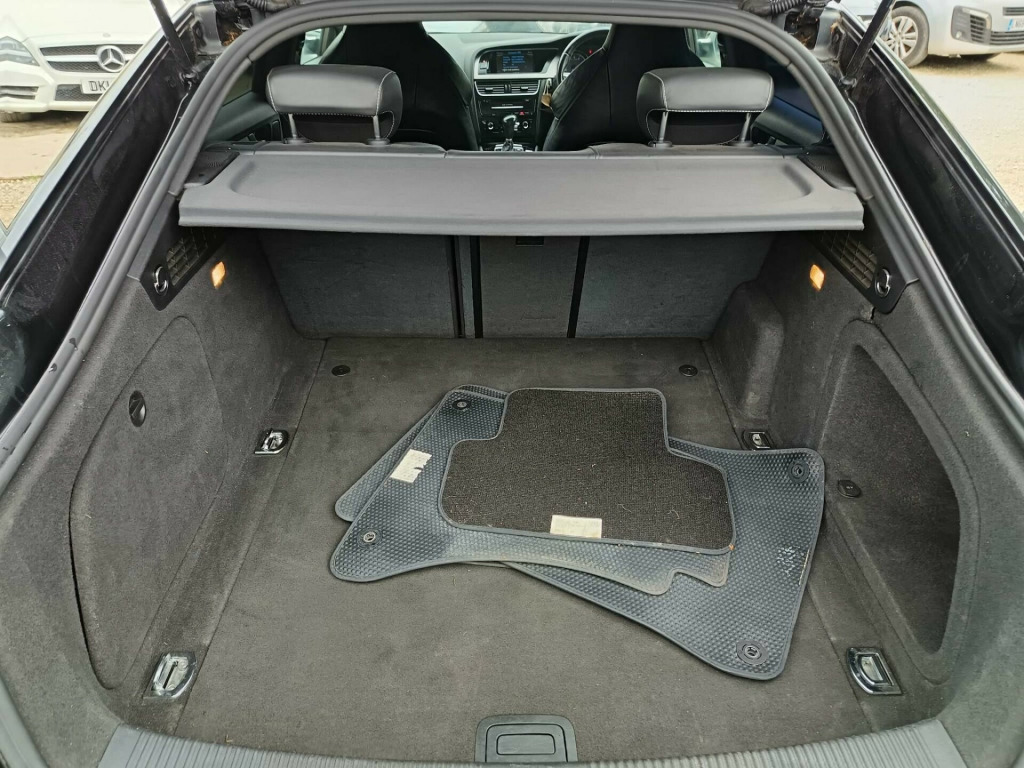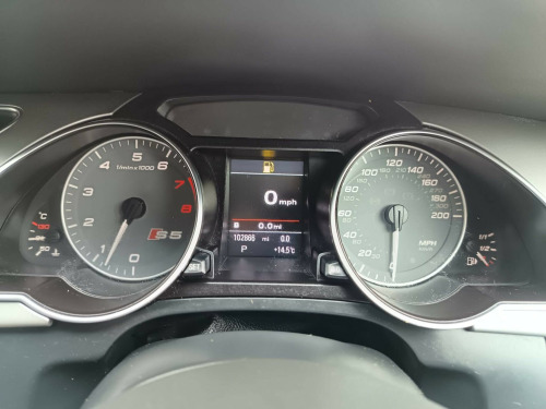 This is an Audi S5, a four-wheel drive car, first registered in 2010. It's a TFSI V6 variant, running on petrol, with a 3.0 litre engine. This vehicle comes with a 6 months warranty for peace of mind and will have 12 months MOT provided on purchase. It also has a partial service history.Inside, you'll find a Bang & Olufsen advanced sound system, a CD changer, and a DVD SatNav. The exterior boasts a black styling pack and 20in alloy wheels with a 7-arm double-spoke design, complemented by a tyre pressure monitor.The Audi S5 has a boot space of 480 litres, which means you get more room for your luggage and shopping than you might expect from similar vehicles. Furthermore, it can accelerate from 0-62mph in just 5.4 seconds, demonstrating its superior performance compared to other cars in its class. It also has a towing weight of 1900 kg. speakers, 19in 5 parallel spoke design alloy wheels, 19in alloy wheels - 20-spoke design, acoustic parking system - rear, alarm - thatcham category 1, bi-xenon headlights, climate control - electronic 3-zone, cloth headlining in black, delete engine designation at rear, deletion of model & engine designation at rear, door mirrors - electrically adjustable and heated, esp - electronic stability programme, first aid kit, front fog lights, headlights - automatic adjustment, headlights washers, inlays - matt brushed aluminium, interior light package, light and rain sensor package, matt brushed aluminium inlay, piano black finish inlay, s sport suspension, seats - front electric adjustment, split-folding rear seats, through-load facility with ski-snowboard bag, 12v power socket x2, abs - anti-lock braking system, airbags - driver, airbags - front passenger, airbags - front side system, automatic wipers with rain sensor, concert radio - mp3-cd player, concert radio & cd player with mp3 sd card reader & aux input socket, drivers information system - dis, electric windows - front and rear, electrically adjustable 4-way lumbar support, front centre armrest, front&rear floor mats, intelligent key, isofix child seat preparation front and rear with passenger airbag deactivation switch, power steering - servotronic, space saver spare wheel, steering column - rake and reach adjustment, steering wheel - 3-spoke leather - multi-function - sports, 6-cd changer and dvd player, ami - audi music interface, bluetooth mobile phone connection, cd changer, dab digital radio module, dvd satnav, mobile telephone preparation - high with bluetooth, 20in 7 arm double spoke alloy wheels, black styling pack, bang & olufsen advanced sound system, tyre pressure loss indicator, 20in alloy wheels - 7-arm double-spoke design, black styling package, tyre pressure monitor