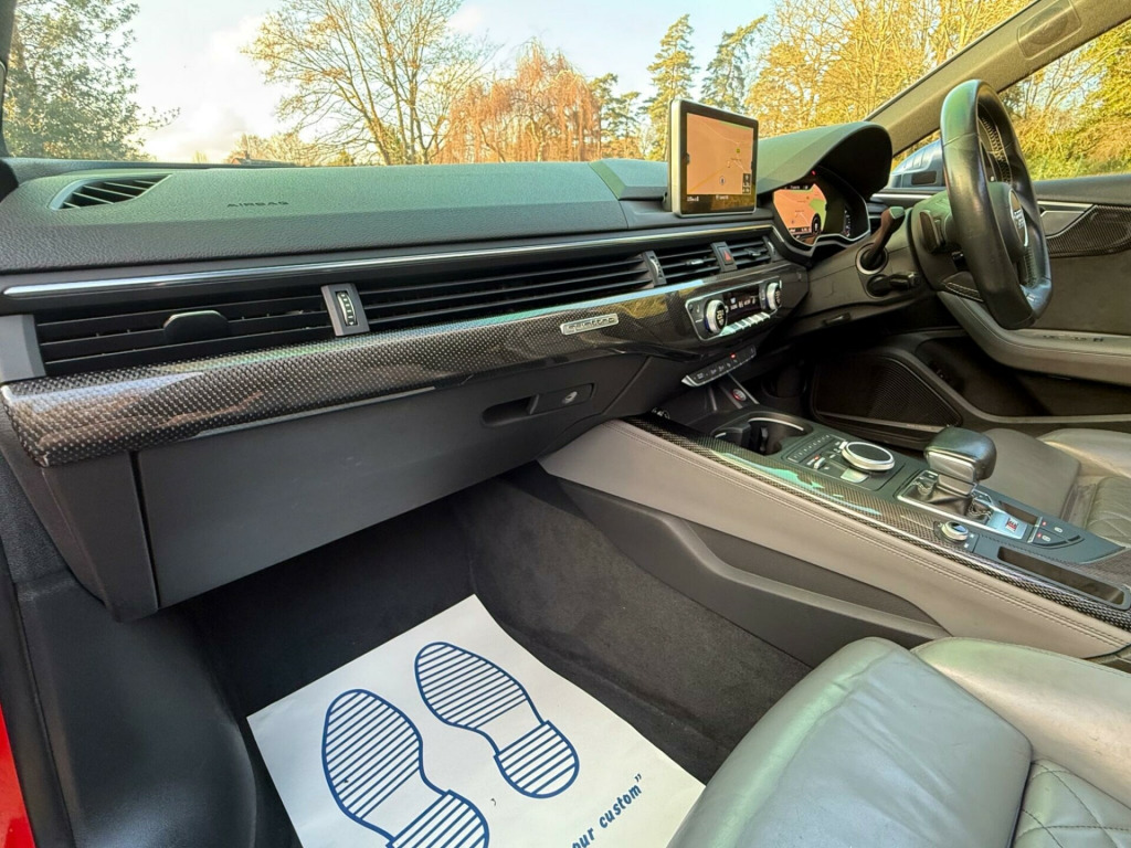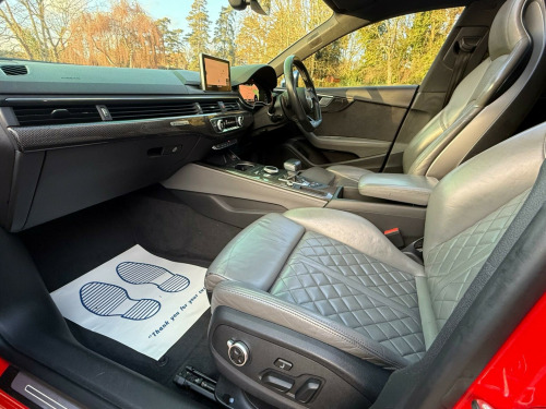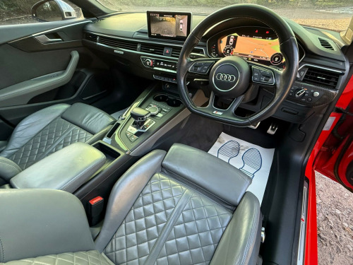 HEAD UP DISPLAY+ PANORAMIC SUNROOF +CARBON INLAYS+ADVANCE KEY WITH KEYLESS ENTRY+B&O SOUND+ VIRTUAL COCKPIT+ELECTRIC MEMORY HEATED MASSAGE SEATS+REAR HEATED SEATS+360 CAMERA+ELEC FOLD MIRRORS+19”S+WIRELESS PHONE CHARGE+SUPER SPORT GREY LEATHER+HILL HOLD+RED CALIPERS+POWER BOOT+HUGE SPEC WITH AUDI HISTORY+FINANCE AND PART EXCHANGE ARRANGED.This 2017 Audi S5 TFSI V6 boasts a full dealership service history, offering peace of mind for its next owner. Under the bonnet lies a powerful 3.0 litre petrol engine, paired with Audi's renowned four wheel drive system for exceptional handling and performance. This Euro 6 compliant model is equipped with striking Matrix LED headlights and LED rear lights, complete with dynamic front and rear indicators that enhance both visibility and style. Inside, you'll find a panoramic glass sunroof that floods the cabin with light, an Audi Phone Box with wireless charging for ultimate convenience, and a Head Up Display to keep essential information in your line of sight. A rear view camera further aids in parking and manoeuvring.The Audi S5 TFSI V6 delivers an exhilarating driving experience, accelerating from 0 to 60mph in a swift 4.5 seconds, a performance that sets it apart from many other vehicles in its class. This impressive acceleration is complemented by a large boot space, making it a practical choice for everyday use and longer journeys alike. The combination of its potent engine, advanced four wheel drive, and sophisticated technology ensures that this Audi S5 offers a compelling blend of performance, comfort, and everyday usability.. 19in Alloy Wheels - 5-Spoke Cavo Design - Contrasting Grey - Partly Polished, 2 x SDXC Card Readers, 2 x USB Charging Ports and 1 x AUX-IN, 4-Way Electric Lumbar Support, 6-Airbag System, Aluminium-Effect Door Mirror Housings, Anti Theft Locking Wheel Bolts, Anti-Theft Alarm, Audi Connect Infotainment Services - 3 Month Trial, Audi Connect Safety and Service - e-call, Audi Drive Select, Audi Smartphone Interface, Audi Sound System, Auto-Dimming Rear-View Mirror, Bluetooth Interface, Brake Calipers Painted in Black with S5 Logo at the Front, CD Drive, Cloth Headlining in Black, Cruise Control with Speed Limiter, DAB Digital Radio Reception, Deluxe 3-Zone Electronic Climate Control, Door Handles - Chrome Inserts, Door Mirrors - Electrically Adjustable and Heated with Built-in LED Indicators, Driver Information System - 7in Colour Display, Driver and Front Passenger Airbag with Front Passenger Airbag Deactivation, ESC - Electronic Stabilisation Control inc ABS - ASR and EDL, Electric Windows - Front, Electrically Adjustable Front Seats, Electromechanical Parking Brake, Electromechanical Power Steering, Extended Interior Upholstery Pack, First Aid Kit and Warning Triangle, Fixed Rear Seat Bench with Storage Tray in Seat, Front Centre Armrest, Front and Rear Floor Mats, Gear-lever Knob in Black Leather, Gear-lever with Diamond S Badge, Headlight Washers, Heat-Insulating Glass - Side and Rear Windows, Heated Front Seats, High Gloss Package, High Multi-Function 3-Spoke Leather Steering Wheel, High-Beam Assist, ISOFIX Child Seat Mounting and Top Tether, Illuminated Door Sill Trims with S Logo, Inlays - Matt Brushed Aluminium, Key with S5 Logo, Keyless Go, LED Headlights with LED Rear Lights and Dynamic Rear Indicators, LED Interior Light Package, Leather Door Armrests and Knee Pad, Light and Rain Sensor, Luggage Compartment Mat, Lumbar Support - Pneumatically Adjustable with Massage Function, MMI Navigation Plus, MMI Radio Plus with 7in Colour MMI Screen, MMI Touch Control Panel, Model and Engine Technology Badges at Rear, Multi Collision Brake Assist, Non-Smoking Package, Parking System Plus, Pedals and Footrest - Stainless Steel, Pop-Up Bonnet for Pedestrian Protection, Power Operated Tailgate, Pre-Sense City, Rear Grille - Black Grained, Rear Spoiler, Remote Central Locking, S Instrument Dials, S Model Enhanced Braking System, S Radiator Grille in Twilight Grey - Matt with Dual Struts in Aluminium, S Rear Diffuser in Twilight Grey - Matt with Diffuser Trim in Matt Aluminium and Honeycomb Grill in Black, S Specific Air Inlet Horizontal Inlay in Matt Aluminium, S Specific Air Inlets in Titan Black - Matt, S Specific Dual-Branch Chrome Tailpipes with Twin Oval Pipes Each on Left and Right, S Specific Front and Rear Bumpers, S Sport Suspension, S5 Badges on Grille - Front Wing Panels and Rear, Seat Belt Monitoring, Space Saver Spare Wheel, Sun Visors including Vanity Mirrors, Tool Kit and Car Jack, Tyre Pressure Warning Light, Variable Restraint System, Voice Control System, Windscreen with Acoustic Glazing, Audi Phone Box with Wireless Charging, Bang and Olufsen 3D Sound System, Camera-Based Traffic Sign Recognition, Head-Up Display, Rear-View Camera, Matrix LED Headlights with LED Rear Lights and Dynamic Front and Rear Indicators, Hill Hold Assist, Parking Assistance Pack, Brake Calipers - Red, 19in Alloy Wheels - 10-V Spoke Design, Door Mirrors - Folding, Door Mirrors - Heated-Electrically Adjustable-Folding, Panoramic Glass Sunroof, Audi Virtual Cockpit, Privacy Glass, Comfort and Sound Package, Electrically Adjustable Front Seats with Memory Function for Drivers Side, Fine Nappa Leather - S Super Sport Seats - S Embossed - Rotor Grey, Flat-Bottomed 3-Spoke Leather High Multi-Function Steering Wheel, Heated Front and Outer Rear Seats, Inlays - Carbon Atlas, Advanced Key with Electric Hands-Free Boot Opening System. Full dealership history