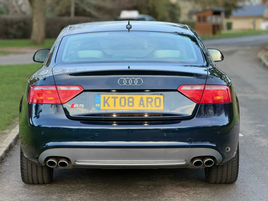 This 2008 Audi S5 V8 boasts a clear vehicle history, offering you peace of mind. Under the bonnet, you'll find a powerful 4.2 litre petrol engine paired with a four wheel drive system, ensuring a confident and engaging driving experience. This model is also notable for its low insurance group, making it an economical choice for its performance class.Beyond its impressive performance, this Audi S5 offers practicality with its large boot space, ideal for luggage or shopping. The combination of its potent V8 engine, all wheel drive capability, and surprisingly affordable insurance group sets it apart from other vehicles in its class, providing a compelling blend of power, usability, and value. speakers & 6 channel amp, 19in 5 parallel spoke design alloy wheels, 3spoke s sports multifunction steering wheel, 3spoke sports leather multifunction steering wheel, 3spoke sports leather steering wheel with silver stitching, 4spoke leather multifunction steering wheel, concert radio & single cd player with mp3 facility, delete engine designation at rear, deletion of model & engine designation at rear, front&rear floor mats, matt brushed aluminium inlay, piano black finish inlay