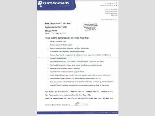 This 2017 Audi TT TDI Sport presents a compelling proposition with its remarkably low mileage of just 61,040 miles, a testament to its careful ownership. This stylish coupe, featuring the Sport trim and a 2.0 litre diesel engine, is a Euro 6 compliant vehicle, ensuring efficient performance. It has been cherished by only two owners and boasts an MOT valid until January 2027, offering peace of mind. Inside, you'll find practical comforts including air conditioning, Bluetooth mobile telephone preparation for seamless connectivity, and a front centre armrest for added convenience. Experience the impressive blend of economy and performance this Audi TT offers. Achieving an outstanding fuel economy of 60 miles per gallon, it stands out from many similar vehicles in its class. Furthermore, its acceleration from 0 to 60 miles per hour in just 6.9 seconds demonstrates a lively and engaging driving experience, making it a truly desirable choice for those seeking both efficiency and dynamism. Comes with 4 Services recorded as well as just being serviced by ourselves and it has 2 Keys. See below for its full list of features. Book today to view and test drive. Open 7 days a week. All part exchanges welcome. Please ask for details of our finance and extended warranty options, subject to status, T's and C's apply. Audi Virtual Cockpit, MMI Radio, Bluetooth Mobile Telephone Preparation, Cruise Control, DAB Digital Radio, Air Conditioning, 18in 5-Twin-Spoke Dynamic Design Alloy W, Black Alcantara-Leather Sport Seats , AMI - Audi Music Interface, Audi Drive Select, Electric Front Windows , Flat-Bottomed 3-Spoke Leather-Trimmed Mu, Front Centre Armrest, Keyless Go, Split-Folding Rear Seats, Xenon Headlights with LED Daytime Runnin, Electrically Adjustable Door Mirrors , Retractable Rear Spoiler, Tango Red, ABS - Anti-Lock Braking System, ESP - Electronic Stability Programme, Traction Control, Progressive Steering, Electromechanical Parking Brake, Tyre Pressure Loss Indicator, ISOFIX Child Seat Mounting, R