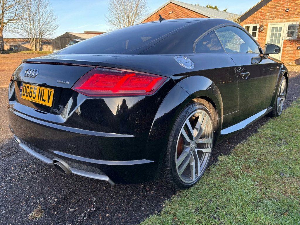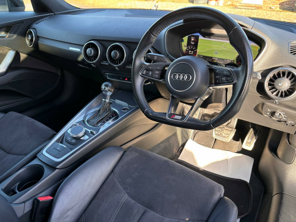NOW SOLDThis 2015 TT Quattro, s- line Mk3 TT gleams in Metallic Black, with a contrasting S Line embossed interior. Presented in exceptional condition and enjoys some rather nice factory options, these include, heated seats, 19 in diamond cut alloy wheels and Sat Nav integrated into the dashboard. Recently serviced with service history provided on file. With a great mileage, we would suggest this particular vehicle is a notch above the standard.Harpenden Cars Limited operates from a semi-rural and private location and accept appointments most times as arranged.All our vehicles are handpicked, with specific attention paid to ensuring an outstanding pedigree. Always accident free, HPi clear and usually completely 'stock' as standard from the factory. We are proud of our ability to source the very best vehicles available in the UK. We prepare to a good degree, perform servicing and MOT if required, professional valet and then store security undercover. Retail ready for viewing, inspection, and immediate purchase.We hope to have removed the need to tireless search for the right car yourself, instead to put your trust into a car trader with a genuine passion for what they do.All Prices Include a Comprehensive 3-month Warranty, which can be extended up to 3 years, a HPi certificate, a minimum of 6 months MOT and a VOSA MOT history report. v power socket, 19in alloy wheels - 5-arm star design, 2 x sdxc card readers, abs - anti-lock braking system, ami - audi music interface, aux-in socket, air conditioning, airbags - driver, airbags - front passenger, airbags - front side system, airbags - head system, all weather led headlights, anti theft locking wheel bolts, anti-theft alarm, audi active lane assist, audi drive select, audi virtual cockpit - 12.3in high resolution lcd display, automatic wipers with rain sensor, bluetooth audio streaming, body coloured door mirrors, brake lights - led, bumpers - front and rear - s line design, car jack, dab digital radio, diffuser - rear - platinum grey insert - s line design, door mirrors - built-in led side indicators, door mirrors - electrically adjustable and heated, door sill trims, door sill trims with s line logo, door trim inserts - alcantara, dynamic led indicators - rear, esp - electronic stability programme, electric windows - front, electrically adjustable 4-way lumbar support, electromechanical parking brake, extended aluminium look in interior, fm-am radio, first aid kit, front passenger airbag deactivation switch, front sports seats, fuel computer, gear knob - perforated leather black, gear knob - silver stitching, head restraints - front in leather, headlights - automatic dynamic range control, headlights - automatic range adjustment, headlights - coming-leaving home function, headlights - light sensor, headlights washers, headlining - black, isofix child seat mounting for front passenger, isofix child seat preparation for rear seats with top tether, inlays - matt brushed aluminium, integrated head restraints, keyless go, led daytime running lights, led rear lights, light and rain sensor package, mmi radio, mmi touch, manual front seat adjustment, mobile telephone preparation - bluetooth interface, non-smoking package, pedals in stainless steel, pollen filter, progressive steering, radiator grille - high gloss black, remote central locking, s line badge on the steering wheel, s line badges on the front wings, s line body styling, seat - side bolsters in leather, seats - alcantara centre section, seats - constrasting silver stitching on upholstery, side sills - s line, speakers x4 - front passive, split-folding rear seats, spoiler - retractable, steering wheel - 3-spoke leather-multifunction-flat bottomed, steering wheel - gear shift paddles, steering wheel - height and reach adjustable, steering wheel - multi-function, steering wheel - silver contrast stitching, steering wheel - sports, sunband for windscreen, tp memo - automatically saves traffic news, tool kit, traction control, tyre pressure loss indicator, tyre repair kit, usb connection, warning triangle, ipod connection, leather-alcantara - s embossed super sports seats - black with rock grey stitching, heated front seats, 19in alloy wheels - 5-spoke blade design, technology package