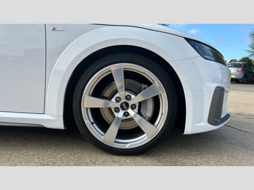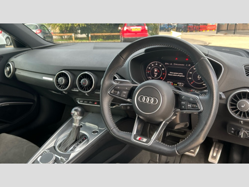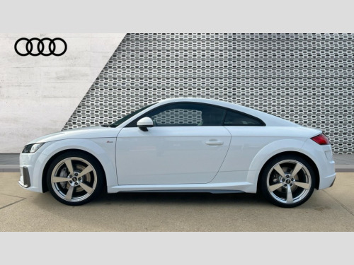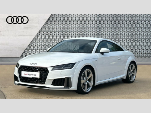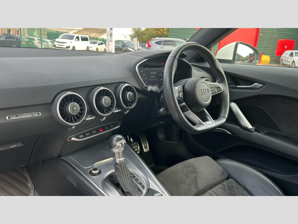Audi TT 45 TFSI Quattro S Line 2dr S Tronic Audi drive select with 4 Pre configured modes, Audi smartphone interface, Cruise control + speed limiter, Emergency call service, MMI touch panel, Mobile phone preparation with bluetooth interface, Progressive power assisted steering, Service interval indicator, Start/Stop system with energy recuperation, TP memo, S line sports suspension, AM/FM radio, Bluetooth audio streaming, DAB Digital radio, MMI Radio with CD player and SD/XC card slot, Auto dimming rear view mirror, Auto headlight range control, Black door mirrors, Body colour bumpers, Electric folding door mirrors, Electric front windows, Electrically adjustable and heated door mirrors with integrated LED side indicators, Front fog lights, Green tinted heat insulating glass, High gloss black radiator grille, LED 3rd brake light, LED daytime running lights, LED headlights with LED rear lights + dynamic rear indicators, Light and rain sensors, Rear boot, Retractable rear boot spoiler, S line badges on front wings, Sunband for windscreen, 12V socket, 2 rear seats, 3 spoke flat bottomed high multi-function leather sport steering wheel with gearshift paddles, 4 way electric lumbar support for driver and front passenger, Black headlining, Contrasting silver stitching in steering wheel, Door sill trims with S line logo, Extended aluminium look with stainless steel pedals, Front centre armrest, Front passenger seat, Front super sports seats, Heated front seats, Height adjustable driver's seat, Height adjustable front head restraints, Height/reach adjust steering wheel, ISOFIX child seat mounting for front passenger seat with airbag deactivation, Manual adjustment of seat height, fore/aft position, seat angle, seat depth and backrest angle, Perforated leather gearknob in black, Rear head restraints, Rear top tether child seat ISOFIX attachment, S Line badge on steering wheel, Split folding rear seat, Non smoking pack - TT/TT RS, S Line design styling pack - TT, 3 point front seat belts, ABS, ASR traction control, Curtain airbags, Driver and front passenger airbag with front passenger airbag deactivation, EDL traction control, Electromechanical parking brake, ESP, First aid kit, Front side airbags, Head airbags, Hill hold assist, Seatbelt warning, Tyre pressure loss indicator, Warning triangle, Anti theft alarm, Anti theft wheel bolts, Immobiliser, Keyless Go, Remote central locking, Matt brushed aluminium inlays, Tool kit, Tyre repair kit