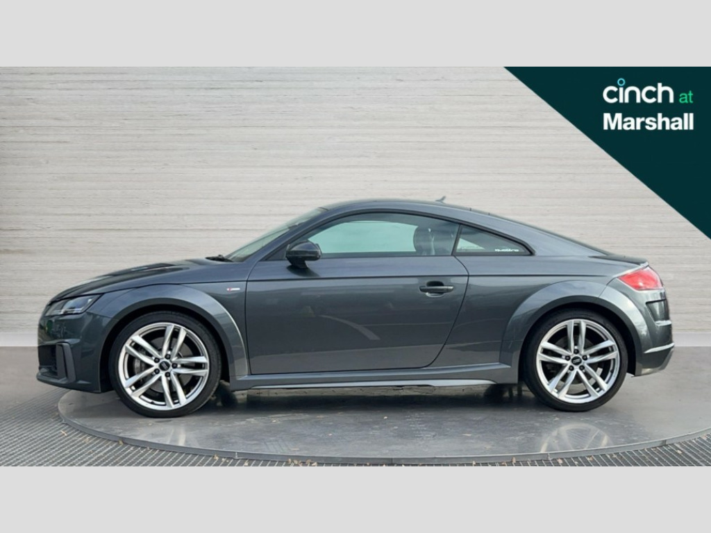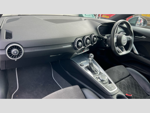 Audi TT 45 TFSI Quattro S Line 2dr S Tronic Audi active lane assist, Audi drive select with 4 Pre configured modes, Cruise control + speed limiter, MMI touch panel, Mobile phone preparation with bluetooth interface, Progressive power assisted steering, Service interval indicator, Start/Stop system with energy recuperation, TP memo, S line sports suspension, AM/FM radio, Audi music interface, Bluetooth audio streaming, DAB Digital radio, MMI Radio with CD player and SD/XC card slot, Auto dimming rear view mirror, Auto headlight range control, Body colour bumpers, Body colour electrically adjustable and heated door mirrors with built in LED side indicators, Dynamic rear indicators, Electric folding door mirrors, Electric front windows, Front fog lights, Green tinted heat insulating glass, Headlight wash system, High gloss black radiator grille, LED daytime running lights, LED headlights with LED rear lights + dynamic rear indicators, Light and rain sensors, Retractable rear boot spoiler, S line badges on front wings, S Line body styling, S Line front and rear bumpers, S line rear diffuser with platinum grey insert, S line sill plates, Sunband for windscreen, 12V socket, 3 spoke flat bottomed high multi-function leather sport steering wheel with gearshift paddles, 4 way electric lumbar support for driver and front passenger, Air conditioning, Black headlining, Door sill trims with S line logo, Extended aluminium look with stainless steel pedals, Front centre armrest, Front super sports seats, Heated front seats, Height adjustable driver's seat, Height adjustable front head restraints, Height/reach adjust steering wheel, ISOFIX child seat mounting for front passenger seat with airbag deactivation, Perforated leather gearknob, Rear head restraints, Rear top tether child seat ISOFIX attachment, S Line badge on steering wheel, Split folding rear seat, Top tether anchor plate for isofix child seat, Non smoking pack - TT/TT RS, 3 point front seat belts, ABS, ASR traction control, Brake energy regeneration, Curtain airbags, Driver and front passenger airbag with front passenger airbag deactivation, EDL traction control, Electromechanical parking brake, ESP, First aid kit, Front side airbags, Head airbags, Hill hold assist, Seatbelt warning, Tyre pressure warning, Warning triangle, Anti theft alarm, Anti theft wheel bolts, Immobiliser, Keyless Go, Remote central locking, Matt brushed aluminium inlays, Tool kit, Tyre repair kit