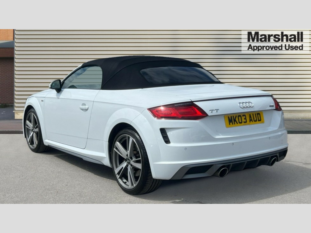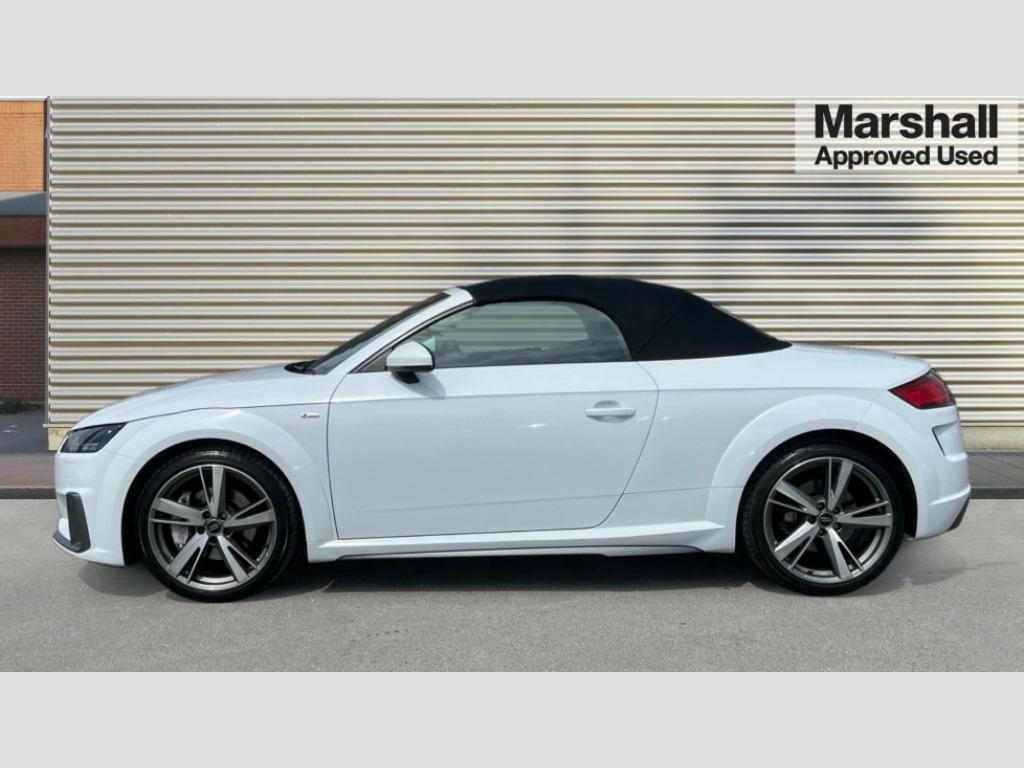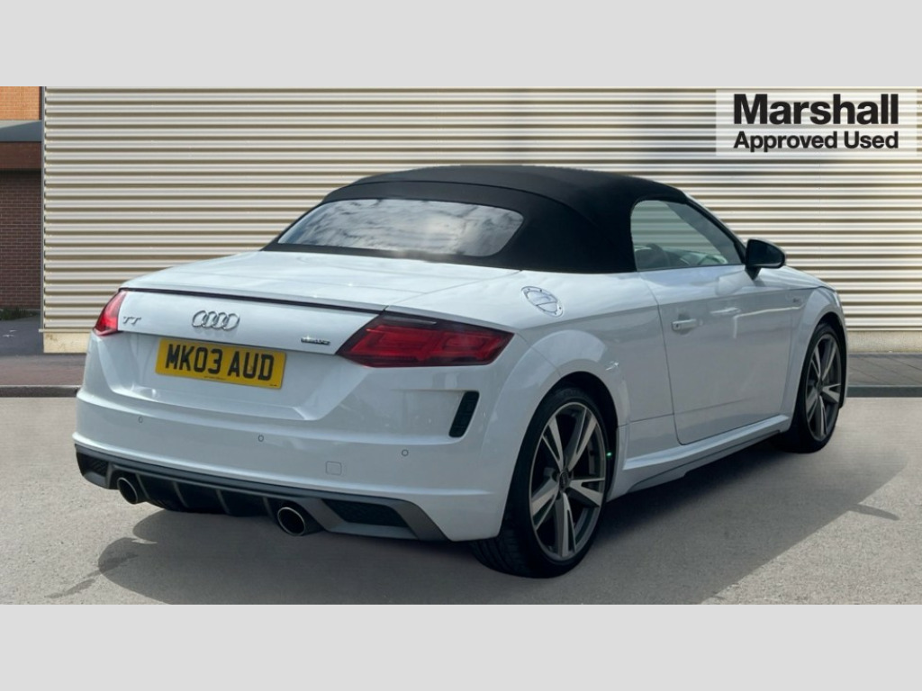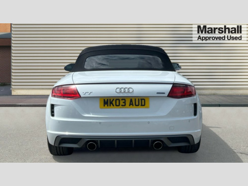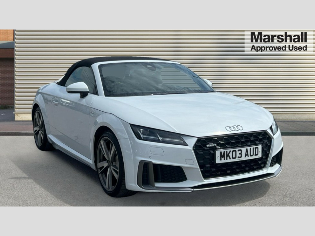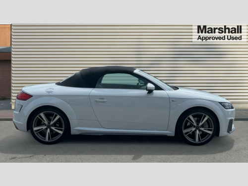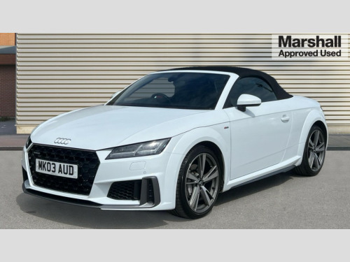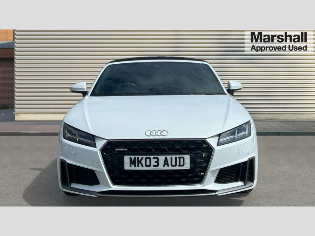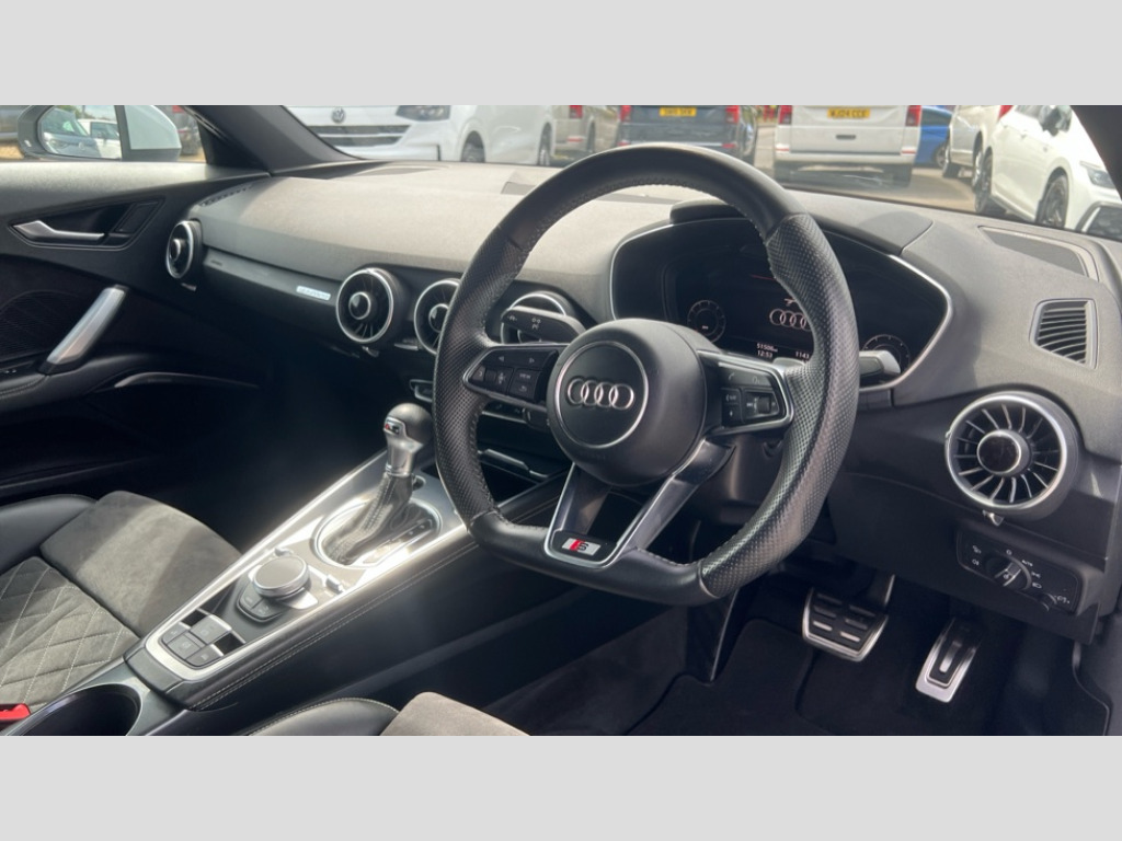 Audi TT 45 TFSI Quattro S Line 2dr S Tronic Audi active lane assist, Audi drive select with 4 Pre configured modes, Cruise control + speed limiter, MMI touch panel, Progressive power assisted steering, Rear parking sensors, Seat belt microphone, Service interval indicator, Start/Stop system with energy recuperation, TP memo, 8 Speakers, AM/FM radio, Audi music interface, Bluetooth audio streaming, DAB Digital radio, MMI Radio with CD player and SD/XC card slot, Auto dimming rear view mirror, Auto headlight range control, Body colour bumpers, Dynamic rear indicators, Electric front windows, Front fog lights, Fully automatic acoustic hood, Green tinted heat insulating glass, Headlight wash system, High gloss black radiator grille, LED daytime running lights, Light and rain sensors, Retractable rear boot spoiler, S line badges on front wings, S Line body styling, S Line front and rear bumpers, S line rear diffuser with platinum grey insert, S line sill plates, Sunband for windscreen, 12V socket, 3 spoke flat bottomed high multi-function leather sport steering wheel with gearshift paddles, 4 way electric lumbar support for driver and front passenger, Black headlining, Door sill trims with S line logo, Extended aluminium look with stainless steel pedals, Front centre armrest, Front super sports seats, Heated front seats, Height adjustable driver's seat, Height adjustable front head restraints, Height/reach adjust steering wheel, ISOFIX child seat mounting for front passenger seat with airbag deactivation, Perforated leather gearknob, S Line badge on steering wheel, Non smoking pack - TT/TT RS, 3 point front seat belts, ABS, ASR traction control, Brake energy regeneration, Curtain airbags, Driver and front passenger airbag with front passenger airbag deactivation, EDL traction control, Electromechanical parking brake, ESP, First aid kit, Front side airbags, Head airbags, Hill hold assist, Seatbelt warning, Tyre pressure warning, Warning triangle, Anti theft alarm, Anti theft wheel bolts, Immobiliser, Keyless Go, Remote central locking, Matt brushed aluminium inlays, Tool kit, Tyre repair kit