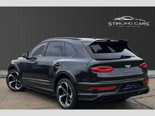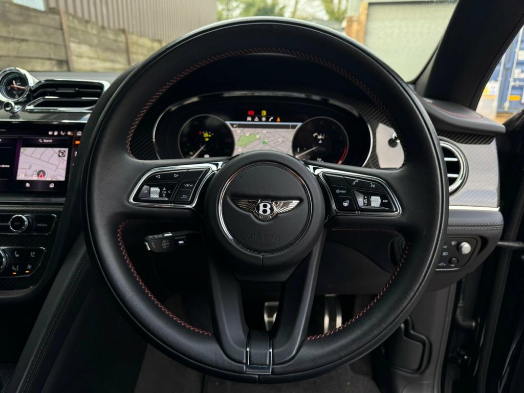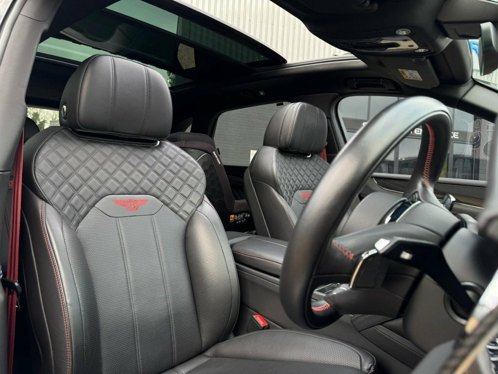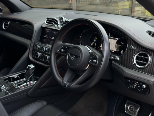 2021 (21) Bentley Bentayga 4.0 V8 Auto 4WD Euro 6 finished to an exceptional standard and offering outstanding performance with 550 PS from the powerful V8 engine. This vehicle has covered low miles and comes with Bentley and specialist service history, MOT and warranty included, 2 keys, and 3 previous owners. The exterior is enhanced with polished alloy wheels along with carbon styling including front splitter, rear spoiler and side skirts, giving the car a strong and elegant road presence. Inside, the luxury cabin features black Bentley-stitched leather seats with red contrast stitching and red seatbelts, all fully heated and cooled, complemented by a heated steering wheel. Carbon fibre inlays, carbon rear picnic tables and a panoramic sliding glass roof further elevate the interior ambience. Technology and comfort are at the forefront with a heads-up display, 360-degree camera system and Bentley Signature Sound system, making every journey effortless and refined. A superbly specified Bentayga V8 combining luxury, performance and practicality, ready to be driven away. Steering Wheel - 3 Spoke Duo Tone Hide T, Battery Charger, 22in Alloy Wheels - 5 Spoke Directional , Privacy Glass - Rear, 12v x 2 Power Points, 21in Alloy Wheels - 5 Twin Spoke - Paint, 21in Summer Tyres, 8in Touch Screen Infotainment, ABS - Anti Lock Braking System, Air Suspension - Continuous Damping - 4 , Airbag - Curtain, Airbag - Driver, Airbag - Front Passenger Deactivation, Airbag - Passenger, Airbags - Front Side, Airbags - Rear Side, Automatic Hill Hold Control, Bentley GPS Tracking System Full Fitment, Blind Spot Warning, Bright Roof Rails, Daytime Running Lights - LED, Door Mirrors - Electronically Adjustable, ESP - Electronic Stability Programme, Electric Front and Rear Windows,