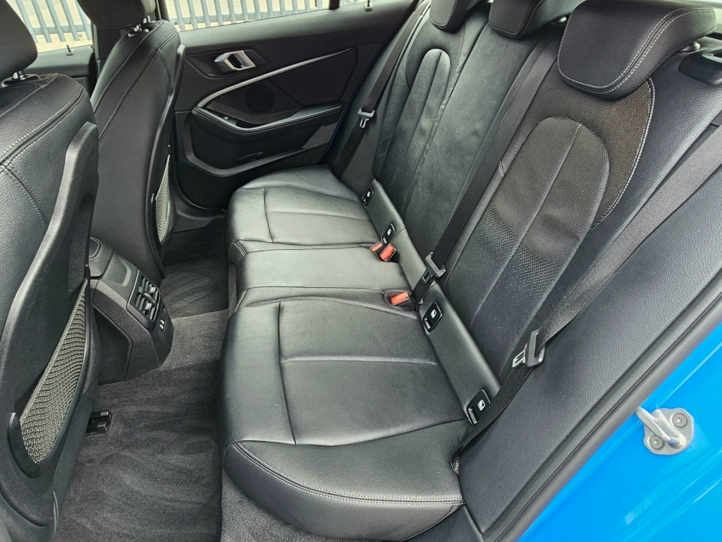 THIS WELL-EQUIPPED 1 SERIES IS PRESENTED IN METALLIC BLUE, WITH GLOSS BLACK ACCENTS COMPLEMENTED BY 18 INCH DOUBLE-SPOKE SILVER MACHINED ALLOY WHEELS. THE VERY RELIABLE AND ECONOMICAL 1.5 DIESEL ENGINE IS CONNECTED TO AN AUTOMATIC GEARBOX MAKING THIS CAR A GREAT DRIVE WHETHER AROUND TOWN OR ON THE MOTORWAY. THE COMFORTABLE AND SMART INTERIOR FULL DAKOTA LEATHER SEATS UPHOLSTERED IN BLACK WITH CONTRASTING GREY PANELS PLUS CHROME HIGHLIGHTS TO THE DOOR PANELS AND DASHBOARD. EQUIPMENT CENTRES AROUND THE BMW iDRIVE CONTROLLER WHICH GIVES ACCESS TO THE CLIMATE CONTROL, MULTIMEDIA INCLUDING BLUETOOTH TELEHONE AND MUSIC STREAMING, SAT-NAV AND VEHICLE SETTINGS. FURTHER EQUIPMENT INCLUDES FRONT & REAR PARKING SENSORS,LED HEADLIGHTS, AUTOMATIC AIR CONDITIONING, KEYLESS ENGINE START, HEAT PROTECTING GREEN-TINTED GLAZING, LEATHER-TRIMMED MULTI-FUNCTION STEERING WHEEL AND YET MORE TO BE DISCOVERED. WE HAVE FULLY INSPECTED AND SERVICED THIS CAR, SO THE ONLY ISSUE FOR ITS NEW OWNER WILL BE WHERE THE NEXT TRIP SHOULD BE. PLEASE CALL 0161 761 3452 (OPTION 2) TO ARRANGE A VIEWING, TO RESERVE THE CAR OR FOR MORE INFORMATION. WHILST EVERY EFFORT HAS BEEN MADE TO ENSURE THAT THE STATED SPECIFICATION IS ACCURATE, PLEASE CHECK WITH A MEMBER OF THE SALES TEAM IF A PARTICULAR SPECIFICATION/FEATURE IS IMPORTANT TO YOU.. 12V Power Socket in Centre Console Front with Blanking Plug, 18in Alloy Wheels - Double-Spoke Style 819M, Active Guard Plus, Air Conditioning Automatic with Two-Zone Control, Airbags, Alarm System - Thatcham 1 with Remote Control and Engine Immobiliser, Armrest - Front - Folding with Storage Compartment, Attentiveness Assistant, Automatically Dimming Rear View Mirror, BMW ConnectedDrive Online Services, BMW Emergency Call, BMW Live Cockpit Plus, BMW Mobility Tyre Sealing System, BMW TeleServices, Bluetooth - Audio Streaming - with Compatible Devices, Bluetooth Hands Free with USB Audio Interface, Bumper System Front and Rear - Replaceable Deformation Elements for Impacts Up to 9mph, Central Locking Switch - Doors - Fuel Filler Cap - Luggage Compartment, Check Control Warning System for Monitoring of Lights and Door-Luggage Compartment Open Warning, Child Seat ISOFIX Attachment For The Two Outer Rear Seats And Front Passenger Seat, Childproof Locking System - Rear Doors and Electric Windows, Condition Based Service, Connected Package Plus, Contrast Stitching - Instrument Panel, Crash Sensor, Cruise Control with Brake Function and Speed Limiter, Cupholders - Two Front Centre Console, DAB Digital Radio, DSC - Dynamic Stability Control Plus, Dead-locking Function System to all Doors, Direction Indicator Side Lights Integrated in Exterior Mirrors, Door Sill Finishers in Black Plastic with Inserted M Designation in Metallic Look - Front Only, Drive Performance Control with ECO PRO and Comfort Modes, Drive-Away Locking System on All Doors-Luggage Compartment - Can Be De-Activated in iDrive Settings, ECO PRO Mode, EPS - Electric Power Steering, Electric Handbrake, Electric Windows - Front and Rear with Open-Close Fingertip Control - Trap Release and Child Lock Function, Exhaust Tailpipe - Chrome - Single Round 90mm - Left, Extended Lighting, Extended Storage, Exterior Mirrors - Electrically Folding with Anti Dazzle, Exterior Parts in Body Colour, Exterior Trim - High Gloss Shadowline, First Aid Kit and Warning Triangle, Floor Mats in Anthracite Velour with Contrasting Colour Seam to Match Contrast Stitching on Instrument panel, Front Windscreen Wipers with Integrated Washer Jets, Glove Box with Light, Grab Handles - Integrated in Roof Linings - Four, Headlining - Anthracite, Heat Protection Glazing with Green Tint, High Level Third Brake Light, Illuminated Boston Interior Trim, Incorrect Fuelling Protection System, Integrated Owners Handbook - Within iDrive Menu, Interior Lighting, Kidney Grille - Chrome Frame with Satin Aluminium Struts, LED Fog Lights - Front, LED Headlights, Locking Wheel Bolts, Luggage Compartment Package, M Logo Designation Chrome - Side, M Sport Aerodynamic Package, M Sport Package, M Sport Steering Wheel, M Sport Suspension, Model Designation on Tailgate, Multifunction Controls for Steering Wheel, OBC - On-Board Computer, Oil Sensor For Level and Grade, Optimum Shift Indicator, PDC - Park Distance Control - Front and Rear, Performance Control, Personal Profile, Rain Sensor with Automatic Headlight Activation, Rear Fog Light, Rear Seat Backrest with Manual 60-40 Split Folding with 3 Top Tether Clips Integrated on Rear of Seat Panels, Rear Seat Headrests - Three, Remote Control Key x2, Reversing Light in Rear Light Clusters, Seat Belt Security Check for Driver and Front Passenger, Seat Belt Warning if Driver Starts Ignition without Putting on Seatbelt, Seat Heating for Driver and Front Passenger, Servotronic Steering, Shark Fin, Side Armrests - Front and Rear Integrated into Door Trim, Side Impact Protection, Sport Seats - Front, Start-Stop Button - Illuminated in Centre Console with Keyless Engine Start and Auto Start-Stop Deactivation Button, Steering Column with Manual Reach and Rake Adjustment, Stereo Speaker System, Storage Features, Sun Visors with Vanity Mirrors and Insert Tab, TPMS - Tyre Pressure Monitoring System, Three-Point Seat Belts - All Seats, Twin Horns, Tyres - Reduced Rolling Resistance, Visibl.