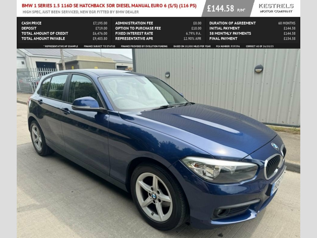 This 2017 BMW 1 Series 116d SE offers has low mileage and comprehensive service history, has had a new EGR fitted by the main dealer and has just been serviced. Cat N Vehicle due to flood damage to engine, no panel or structural damage, no lasting effects, car operating as it should, great value car. Powered by an efficient 1.5L Diesel Engine, this Euro 6 compliant model boasts low CO2 emissions, making it an economical choice. The SE trim level includes desirable features such as Run Flat Tyres for added peace of mind, Bluetooth Hands Free with USB Audio Interface for seamless connectivity, and automatic single zone Air Conditioning for a comfortable cabin environment. Further enhancing convenience and safety are the Rain Sensor with Automatic Headlight Activation and Park Distance Control for the rear, aiding in parking manoeuvres. The provenance of this BMW 1 Series is further strengthened by its MOT valid until December 2025 and a full service history, with the last service completed on 2025-08-06 at 62128 miles, which is notably low for a vehicle of this age. These details collectively indicate a vehicle that has been well cared for and maintained to a high standard, setting it apart from other similar models. A 3 month warranty is also included, providing further assurance for the new owner. Part exchange welcome, finance arranged. 12V Power Socket - Centre Console, 12V Power Socket - Passenger Footwell, 16in Alloy Wheels - Light Star Spoke - 6, Active Differential Brake - ADB Sport - , Air Conditioning - Automatic - Single Zo, Airbags, Alarm System - Thatcham 1 with Remote Co, Armrest - Front with Sliding Adjustment, Battery Age Recognition Function, Battery Safety Cut Off, Bluetooth Hands Free with USB Audio Inte, BMW ConnectedDrive Online Services, BMW ConnectedDrive Services, BMW Emergency Call, BMW Mobility Tyre Sealing System, BMW Navigation System, BMW Professional Radio - Single CD and M, BMW TeleServices, Brake Pad Wear Indicator - Front and Rea, Bumper System Front and Rear - Replaceab, Central Locking Switch