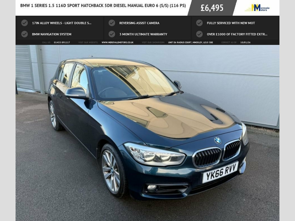 This 2016 BMW 1 Series 1.5 116d Sport Hatchback 5dr Diesel Manual Euro 6 Hatchback is currently available for £6,495 in Hinckley Leicestershire with Diesel engine and Manual gearbox. For more information or to arrange a viewing, click here to send us an email using form below.