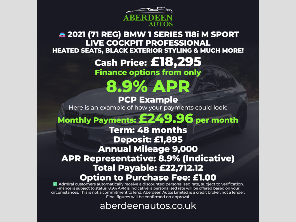 New arrival, images to follow. 2021 BMW 1 Series 118i M Sport Live Cockpit Professional. This stylish M Sport model is powered by an efficient 1.5L Euro 6 petrol engine, ensuring a balance of performance and economy. Inside, youll find a host of desirable features designed for comfort and convenience, including automatic dual zone climate control, LED headlights for enhanced visibility, and heated seats for both the driver and front passenger. Stay connected and entertained with Bluetooth audio streaming, and enjoy effortless journeys thanks to cruise control with brake function and a speed limiter. , The BMW 1 Series 118i M Sport is designed to impress, and its acceleration from 0 to 62 miles per hour in just 8.9 seconds sets it apart from many other vehicles in its class. This impressive performance is complemented by a generous boot space, making it a practical choice for everyday use and longer trips alike. The combination of its sporty M Sport trim, advanced technology, and efficient powertrain makes this 2021 BMW 1 Series a compelling option for those seeking a premium driving experience. , Key Highlights:, Live Cockpit Pro, Heated Front Seats, 18-inch Alloy Wheels, Dual Zone Climate Control, M Sport Aerodynamic Package, Keyless Engine Start , M Sport Steering Wheel, Trigon Cloth-Sensatec - Black with Blue Stitching, , Part Exchange welcome!, , Please contact us at Aberdeen Autos Limited to arrange a viewing and test drive. We look forward to helping you find your next car. , Enquiries are welcome! Please do not hesitate to contact our Sales Specialists with any queries, to request a video walkaround, or to make an appointment to view this vehicle. , Contact 01467 651600 / 07590 984097 (Mobile/WhatsApp) or contact us by email: [email protected], , We care about our customers and offer competitive finance rates. Please contact us for a free, no-obligation representative quote or you may wish to try the finance calculator on the website at: https://www.aberdeenautos.co.uk/finance/, , For our customers convenience, you can apply for finance via the website, where we have information about the finance options that are available and see Representative Examples (indicative only) (Representative from 8.9% APR) or contact us direct. , RESERVE NOW ON THE WEBSITE FOR £99, , Please see our website / Facebook for other vehicles available!, , www.aberdeenautos.co.uk, , Like us on Facebook to stay updated on the latest stock and deals!, , https://www.facebook.com/aberdeenautos, , Happy motoring from Aberdeen Autos!, , For your information: vehicles purchased from Aberdeen Autos Limited include: HPI security and history check; road test and 40-point vehicle check; new service (if required), MOT, remaining manufacturers warranty if applicable or 3 months warranty (warranty terms and conditions apply in all cases) and quarter of a tank of fuel (with no additional charge to the customer). Please discuss with our Sales Specialists if you require further information. , (Please note that whilst every effort is made to ensure details are correct, variations or omissions may occur, any notified errors will be rectified). , Directions: Please use Google Maps and enter Aberdeen Autos as the destination. Please do not use the postcode.