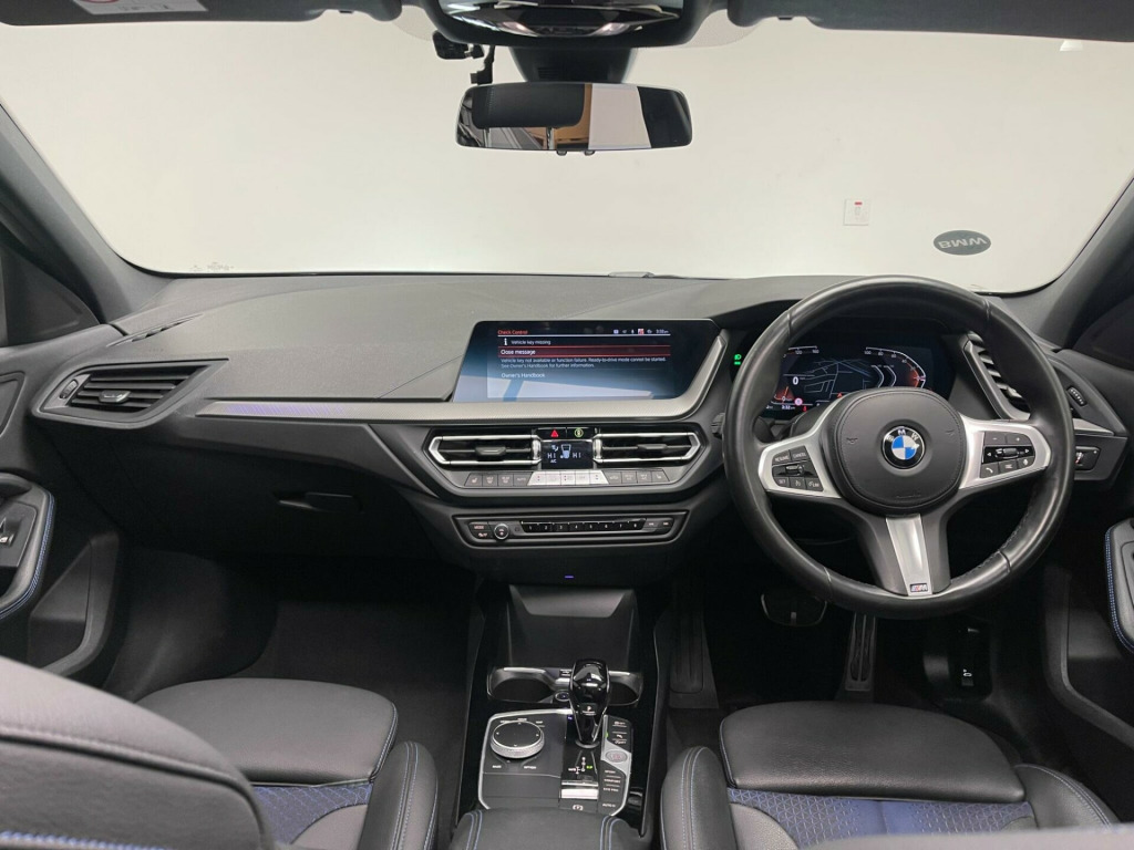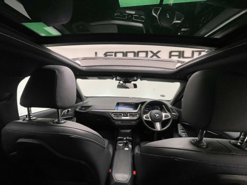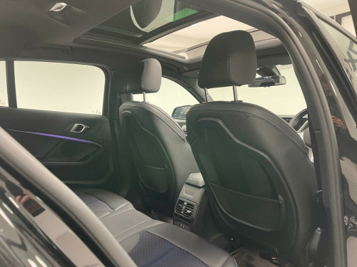 This 2022 BMW 1 Series 118i M Sport is a superb example, having had only one owner since new. This Euro 6 compliant model boasts a responsive 1.5 litre petrol engine and comes in the sporty M Sport trim. You'll enjoy the convenience of BMW Adaptive LED Headlights, which automatically turn on, and a Rain Sensor that also activates the headlights. For effortless parking, the Park Assistant with a rear camera is included, and staying connected is simple with the Bluetooth Hands Free and USB Audio Interface.Experience the open air with the impressive Panoramic Glass Sunroof, which can also be opened for an even more immersive drive. This 1 Series offers a generous boot space, making it practical for everyday use and longer journeys. Its performance is equally engaging, with an acceleration of 0-62mph in just 8.8 seconds, demonstrating its capability compared to other vehicles in its class. noramic glass sunroof, bmw adaptive led headlights, park assistant, trigon cloth-sensatec - black with blue stitching, 12v power socket in centre console front with blanking plug, 18in alloy wheels - m double-spoke style 819 - bi-colour, active guard plus, additional storage compartment, air conditioning automatic with two-zone control, airbags, alarm system - thatcham 1 with remote control and engine immobiliser, armrest - front - folding with storage compartment, attentiveness assistant, automatically dimming rear view mirror, bmw connected package professional, bmw connecteddrive online services, bmw emergency call, bmw live cockpit professional, bmw mobility tyre sealing system, bmw teleservices, bluetooth - audio streaming - with compatible devices, bluetooth hands free with usb audio interface, bumper system front and rear - replaceable deformation elements for impacts up to 9mph, central locking switch - doors - fuel filler cap - luggage compartment, check control warning system for monitoring of lights and door-luggage compartment open warning, child seat isofix attachment for the two outer rear seats and front passenger seat, childproof locking system - rear doors and electric windows, contrast stitching - instrument panel, crash sensor, cruise control with brake function and speed limiter, cupholders - two front centre console, dab digital radio, dsc - dynamic stability control plus, dead-locking function system to all doors, direction indicator side lights integrated in exterior mirrors, door sill finishers in black plastic with inserted m designation in metallic look - front only, drive performance control with eco pro and comfort modes, drive-away locking system on all doors-luggage compartment - can be de-activated in idrive settings, eco pro mode, eps - electric power steering, electric handbrake, electric windows - front and rear with open-close fingertip control - trap release and child lock function, exhaust tailpipe - chrome - single round 90mm - left, extended lighting, exterior mirrors - electrically folding with anti dazzle, exterior parts in body colour, exterior trim - high gloss shadowline, first aid kit and warning triangle, floor mats in anthracite velour with contrasting colour seam to match contrast stitching on instrument panel, front windscreen wipers with integrated washer jets, glove box with light, grab handles - integrated in roof linings - four, headlining - anthracite, heat protection glazing with green tint, high level third brake light, illuminated boston interior trim, integrated owners handbook - within idrive menu, interior lighting, kidney grille - chrome frame with satin aluminium struts, led fog lights - front, led headlights, locking wheel bolts, luggage compartment package, m logo designation chrome - side, m sport aerodynamic package, m sport package, m sport steering wheel, m sport suspension, model designation on electric bootlid, multifunction controls for steering wheel, obc - on-board computer, oil sensor for level and grade, optimum shift indicator, pdc - park distance control - front and rear, performance control, personal profile, preparation for high-beam assistant, rain sensor with automatic headlight activation, rear fog light, rear seat backrest with manual 60-40 split folding with 3 top tether clips integrated on rear of seat panels, rear seat headrests - three, rear window wiper, remote control key x2, reversing light in rear light clusters, seat belt security check for driver and front passenger, seat belt warning if driver starts ignition without putting on seatbelt, seat heating for driver and front passenger, servotronic steering, shark fin, side armrests - front and rear integrated into door trim, side impact protection, sport seats - front, start-stop button - illuminated in centre console with keyless engine start and auto start-stop deactivation button, steering column with manual reach and rake adjustment, stereo speaker system, storage features, sun visors with vanity mirrors and insert tab, tpms - tyre pressure monitoring system, three-point seat belts - all seats, two tone horn, tyres - reduced rolling resistance, visible vin, welcome light