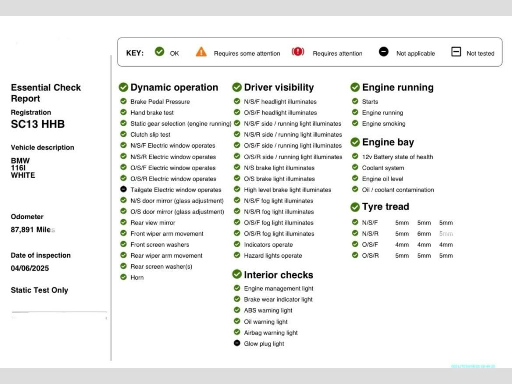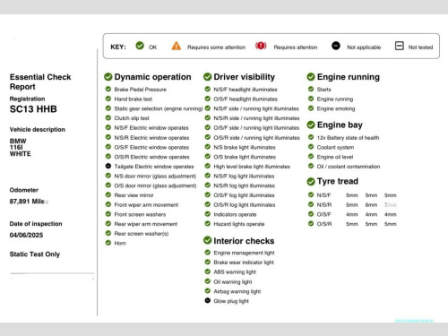 We are pleased to offer this stylish and sporty 2013 BMW 1 Series 1.6 116i Sport 5dr, finished in crisp Alpine White with 87,891 miles and a smooth 6-speed manual gearbox. Powered by a responsive 1.6L petrol TwinPower Turbo engine, it combines premium driving dynamics with everyday practicality and efficiency. Comes with the following such as sports front seats, 17'' Sport alloy wheels, Drive Performance Control with Sport mode, and interior red accent stitching for a more dynamic feel. It also features Bluetooth with USB audio, air conditioning, and on-board computer. Sports front seats with red stitching, Cloth ''Track'' upholstery - Anthracite with Red accents, Leather-wrapped sport steering wheel, Interior trim: High-gloss black with coral red finisher, 6 airbags (front, side, curtain), Dynamic Stability Control (DSC), (ABS) with brake assist, ISOFIX child***EXTENDED WARRANTY AVAILABLE****DUE TO HIGH DEMAND WE RECOMMEND A VIEWING IN ADVANCE, which you can do via the website or by calling us at +44 7349 390791.Our friendly team will look after you before, during and after the sales. We will help you with taxing the vehicle, completing official forms, and we will make sure that you, your family and loved ones are safe on the road. We also offer a wide range of warranties and finance to meet your needs. WHO WE AREWe are a car dealership with 16 years of experience, based in Clarence Street, Stalybridge, SK15 1QF. We are 100% sure that we can find you the right vehicle as we offer over 150 cars for sale at any time. OUR QUALITY PROMISE- Every car comes with our FREE 3 Months warranty- We offer a fresh MOT for all vehicles due for one within the next 3 months. - All our vehicles are HPI Clear and undergo a 39-Point check, conducted by professional inspectors. - Every vehicle is valeted and sanitised to a high standard. - We are able to offer delivery nationwide at competitive prices, don't hesitate to contact us for a quote.FINANCE, PART EXCHANGE OR A STRAIGHT PURCHASE IS AVAILABLE. QPX Wheels Team.https://qpxwheels.co.uk/ v power socket - centre console, 12v power socket - passenger footwell, 17in alloy wheels - light star spoke - 379, 6.5in colour display screen, abs - anti lock braking system, asc - automatic stability control, active differential brake, air conditioning - manual, airbags - curtain, airbags - driver, airbags - front side, airbags - passenger, airbags - passenger deactivation, alarm system thatcham 1 with remote control, ambiance lighting - switchable, ambient interior lighting, armrest - front and rear integrated into door trim, armrest - front with sliding adjustment, auxiliary input, bmw online services, bmw professional radio - single cd and mp3, bmw teleservices, belt force limiters - front, bluetooth hands free with usb audio interface, brake assist, brake drying, brake pad wear indicator - front and rear, bumpers - body colour, cbc - cornering brake control, central locking - remote, child proof locking system - rear doors, child seat isofix attachment - rear x2, comfort go keyless engine start, crash sensor - activating central locking-hazard warning lights-fuel cut off, cup holders, dab digital radio, dbc - dynamic brake control, dsc - dynamic stability control plus, dtc - dynamic traction control, daytime running lights, door handles - body colour, door mirrors - body coloured housing, door mirrors - electric and heated, door sill finishers - sport designation, drive performance control - eco pro - comfort - sport - sport plus, dynamic brake lights, electric windows - front and rear with open-close fingertip control, first aid kit, floor mats - velour, follow me home headlight function, front air inlet with high-gloss black finisher, front fog lights, grab handles - in roof lining x4, halogen headlights, handbrake lever - gear lever knob and gaiters in leather, head restraints - rear and folding, headlights - automatic activation, heat protection glazing with green tint, heated windscreen washer jets, high level third brake light, hill start assist, interior lighting, interior trim - black high gloss, interior trim - black high gloss with coral red finisher, interior trim finisher - coral red, kidney grille - chrome extra-wide high-gloss black vertical slats, lights-on warning, locking wheel bolts, luggage compartment - lashing eyes x2, mobility tyre sealing system, multifunction controls for steering wheel, non smokers package, obc - on-board computer, power steering - electric, pyrotechnic belt tensioners - front, rain sensor, rear window wiper, run flat tyres, seats - 60-40 split folding rear, side impact protection, sport multi-function leather steering wheel - three spoke, steering column with manual reach and rake adjustment, storage compartment - rear centre console, sun visors with vanity mirrors and ticket holder, tpws - tyre pressure warning system, trim designation deletion, tyres - reduced rolling resistance, air microfilter, sport seats - front, enhanced bluetooth telephone functionality with usb audio interface and voice control, steering wheel - black leather - sport - three spoke, track cloth - anthracite/red