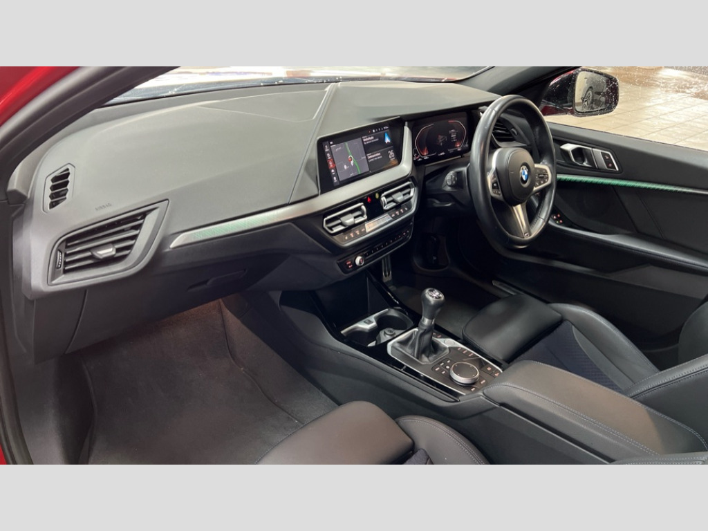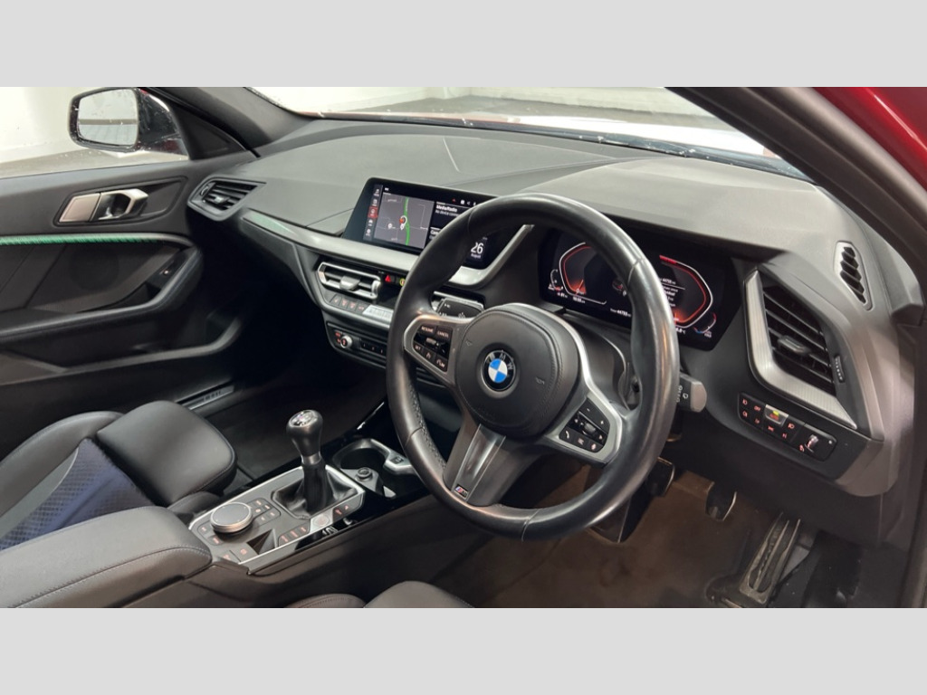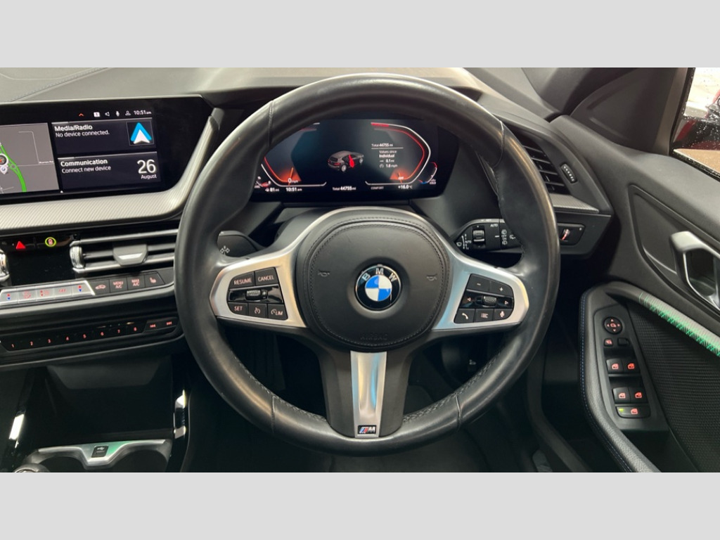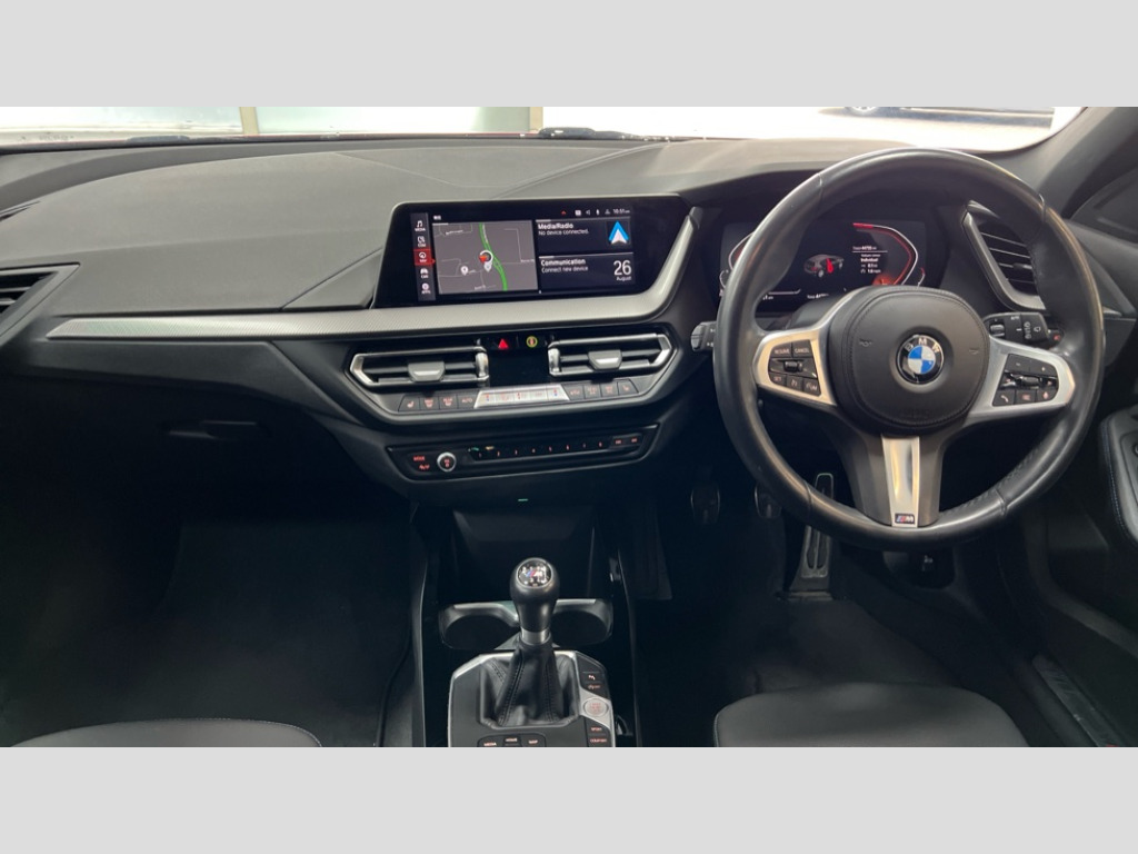 BMW 1 Series 118d M Sport 5dr [Live Cockpit Professional] Active guard plus, Attentiveness assist, BMW ConnectedDrive online services, BMW Teleservices, Characteristic map controlled oil pump system, Check Control warning system for monitoring of lights and door/luggage compartment open warning, Cruise control with brake assist, Eco pro mode, Front axle single joint with specific axle kinematics to minimise drive influences on steering + provide increased rigidity agile driving behaviour, Integrated owners handbook, Lane departure warning system, Oil sensor for level and grade, On board computer, Optimum shift indicator, Personal Profile, Pull away assistant, Rigidly mounted rear subframe - Multi link construction with separate spring / damper configuration and excellent driving characteristics, Speed limit Info including no-overtaking indicator, Speed limiter, AdBlue tank, Aluminium lightweight construction, Anti roll bar front and rear, Balancer shaft, Diesel particulate filter, DOHC valve train with two overhead camshafts, Drive Performance Control, Electronic differential lock, Single turbo charger with variable vane geometry, Twin tube gas filled shock absorbers with degressive characteristic curve, Two-stage charging, DAB Digital radio, Auto dimming rear view mirror, Automatic headlight beam throw control, Automatic windscreen wipers and automatic headlight, Body colour door handles, Body colour mirror caps, Body colour roof trims, Chrome 'M' logo side designation, Chrome exhaust twin tailpipes round 90mm in left and right split, Chrome kidney grille frame with Satin Aluminium struts, Direction indicator side lights in exterior mirrors, Fading support, Folding side mirrors with auto dimming/folding wing mirrors with auto dimming, Follow me home headlights, Front and rear bumper system with replaceable deformation elements, Front and rear electric windows with open and close fingertip control, anti trap facility and comfort closing, Front door sill finishers in black plastic with M designation in metallic look, Green tinted heat protection glazing, Heated, electrically adjustable exterior mirror aspheric on driver side, convex on passenger side, High gloss shadowline window frame, Recess cover mirror frames and B/C pillar embelisher trim, High level third brake light, Integrated front windscreen with washer jets, LED daytime running lights, LED eyebrow turn indicators, LED front fog lights, LED Headlights, Lightweight engineering, Matt black air guide grilles, Matt black wheel arch trim, Model designation on electric bootlid, Nearside reverse light in rear light cluster, Preparation for high beam assistant, Rear fog lights, Rear side wing doors, Rear window wiper, Shark fin antenna, Trailer stabilisation logic, Visible VIN plate, Welcome lighting, 12V power socket in front centre console with blanking plug, 3 rear seat head restraints, 3 seat bench in 2nd row, 3 spoke sports leather steering wheel in black leather with black stitching and decorative finisher in pearl chrome, specific M badge + leather knob, Anthracite headlining, Black boot net with lashing eyes, Cargo function on 2nd seat row, Child seat ISOFIX attachment for two outer rear seats and front passenger seat with anchorage points, Conditioned based service, Driver and front passenger seat heating, Folding rear clothes hook, Four grab handles integrated in roof lining, Front and rear door pockets with bottle holders, Front and rear side armrest integrated into door trim, Front armrest, Front sports seats, Gearshift lever with M designation, Glove compartment, Height adjustable front head restraints, Luggage compartment for bag hooks on left and right, foldable luggage compartment liner and four lashing eyelets, Manual adjust steering wheel, Multi-function controls for steering wheel, Single front passenger seat, Storage compartment in centre console, Sun visors with vanity mirrors and insert tab, Two front centre console cupholders, Two zone automatic air conditioning, Velour floor mats, Additional interior lighting pack - 1 Series, BMW live cockpit professional pack- 1 Series, Connected pack professional - 1 Series, Interior lights pack - 1 Series, M Sport exterior styling aerodynamics pack - 1 Series, 2 tone horn, 3 point seatbelts on all seats, front pyrotechnic belt tensioners, stopper and belt force limiters, rear coded belt buckles, Airbags - Front driver/passenger, front and rear curtain head protection, front side, manual deactivation of front passenger airbag, Anti lock braking system (ABS) with brake assist, BMW emergency call, Brake drying, Braking readiness, Child proof locking system in rear door, City braking function, Comfort modes, Cornering brake control, Crash sensor activating central locking release, hazard warning lights, fuel cut off, interior lighting + activation of safety battery terminal clamp, Driver and front passenger seat belt security check, Dynamic stability control + (DSC+), Dynamic Traction Control - DTC, Electrically operated hand brake, Front and rear disc brakes, Seatbelt warning, Side impact protection, Tyre pressure monitoring system, Warning triangle and first aid kit, Central locking switch for all doors, fuel filler cap and luggage compartment, Deadlocking function system to all doors, Drive away locking system on all doors and luggage compartment, Incorrect fuel protection system, Locking wheel bolts, Remote control with integrated key with High-gloss Black inlay and M designation and 1 button for open/ close lock, window, open luggage compartment, Start/stop button illuminated in centre console with keyless engine start and auto start stop deactivation button, Thatcham Cat.1 alarm and immobiliser, Wheel slip limitation close to the actuator (ARB), Contrast stitching on instrument panel, Electrically powered 12V compressor, Reduced rolling resistance tyres